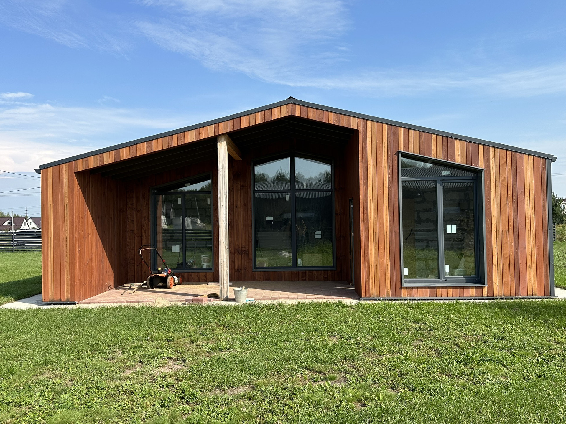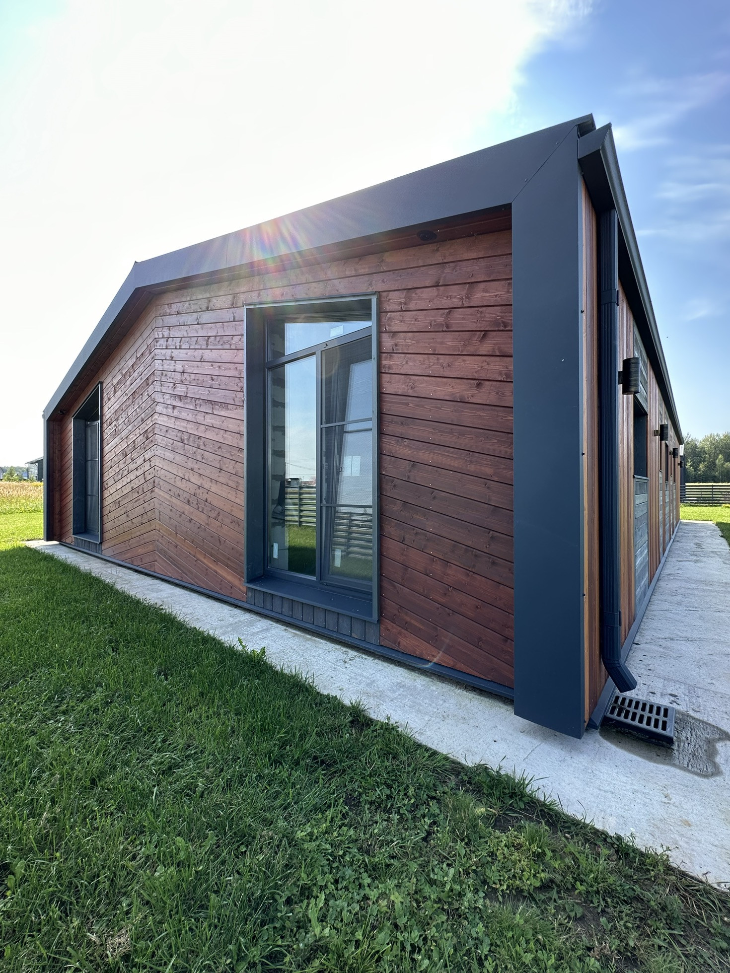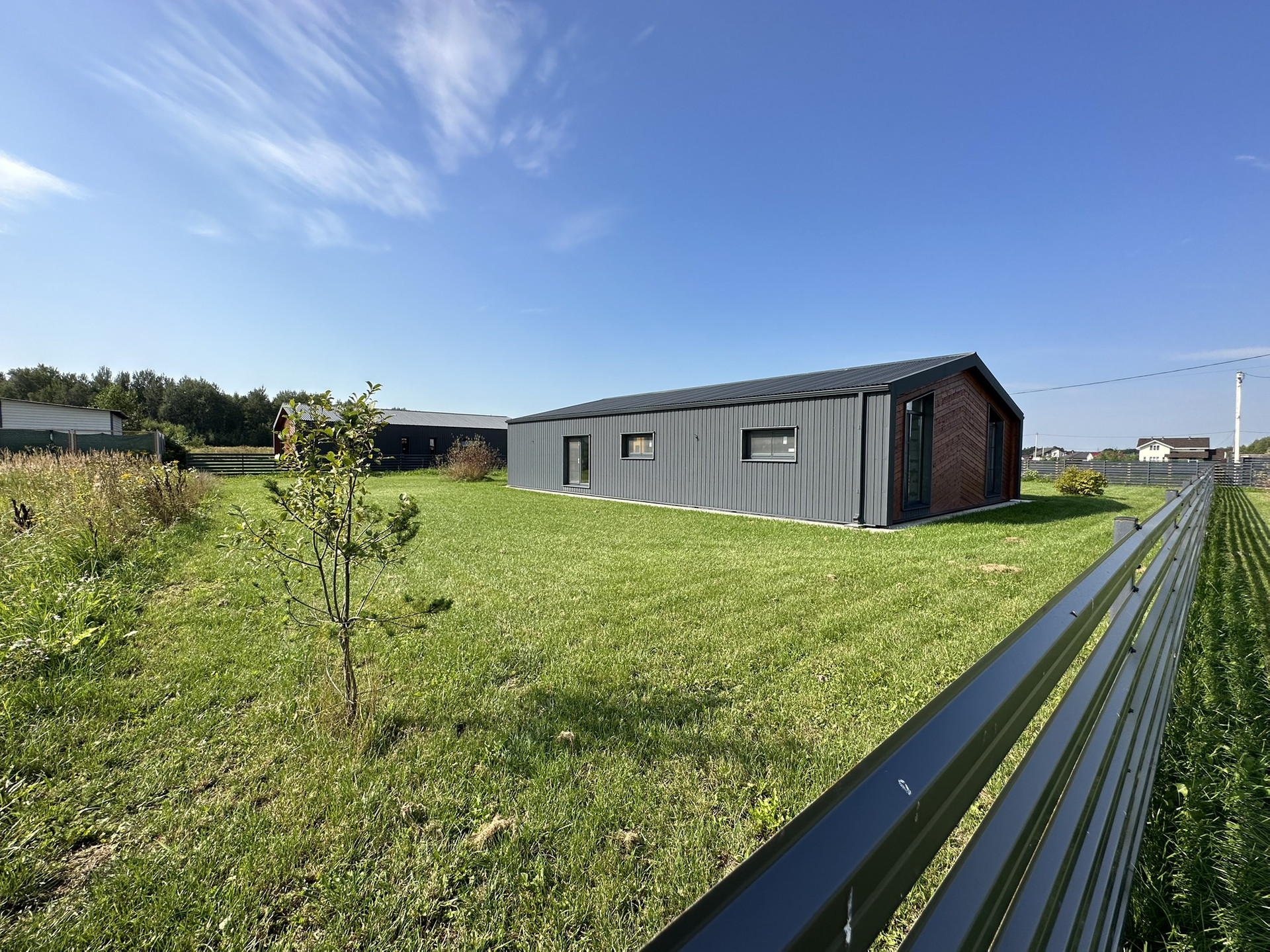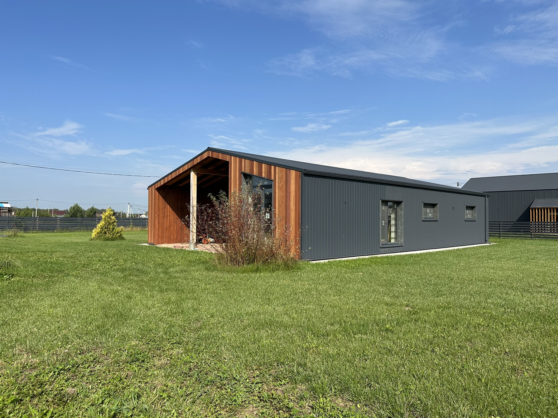 Дом снаружи отделан полностью, использовались такие материалы, как металл с цветом(7024), имитация бруса и планкен лиственница. На участке 12 сот есть газон, все коммуникации подведены ( канализация, водопровод, электричество, отвод воды, дренаж)