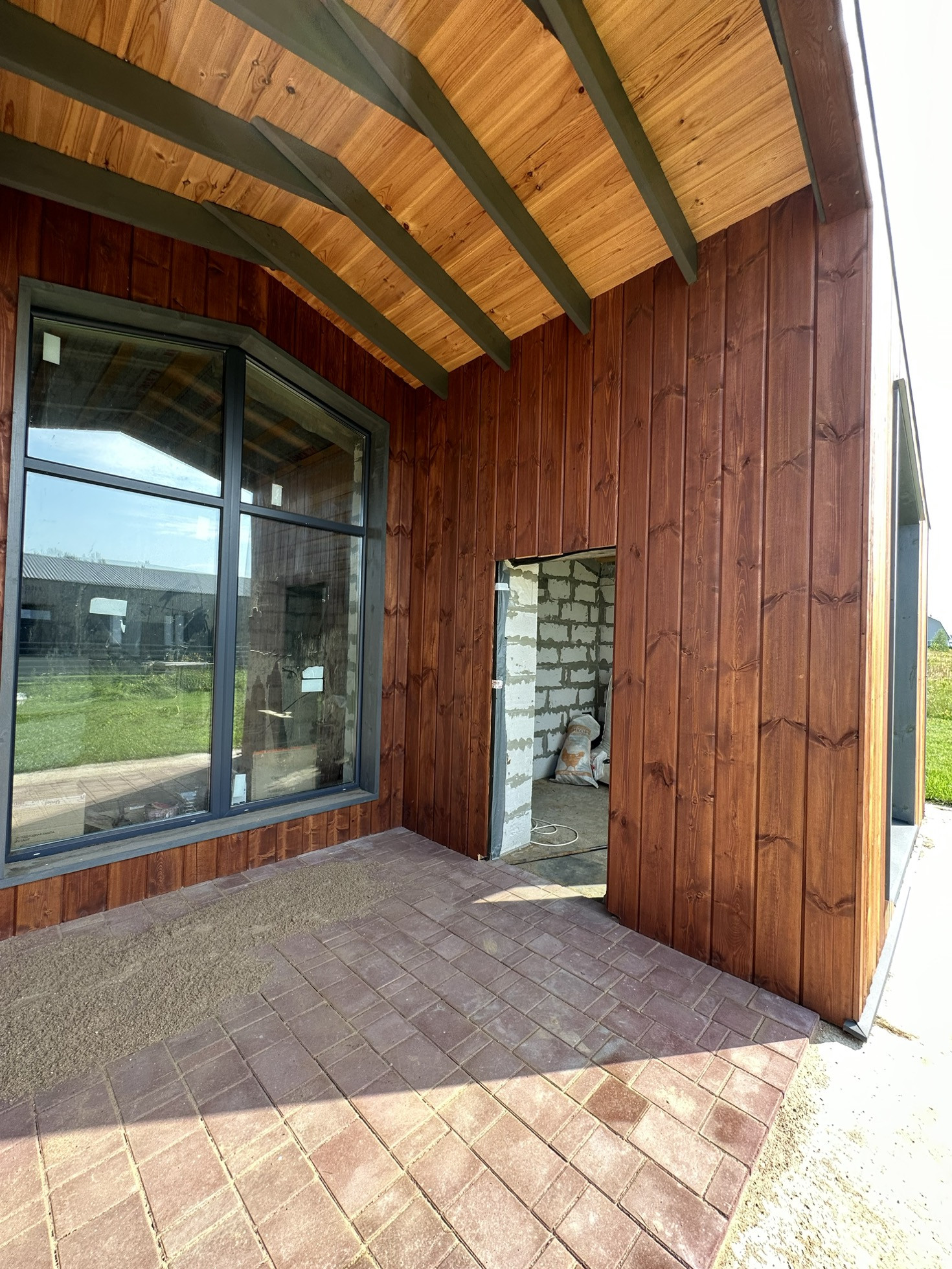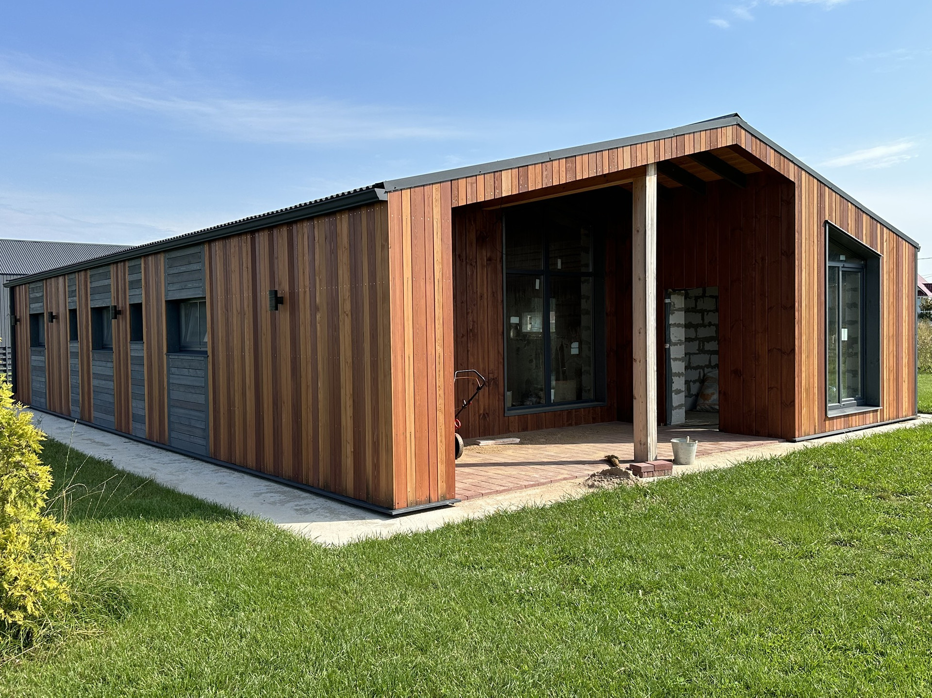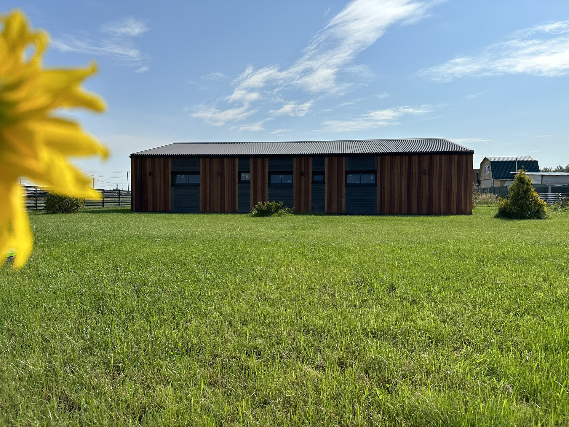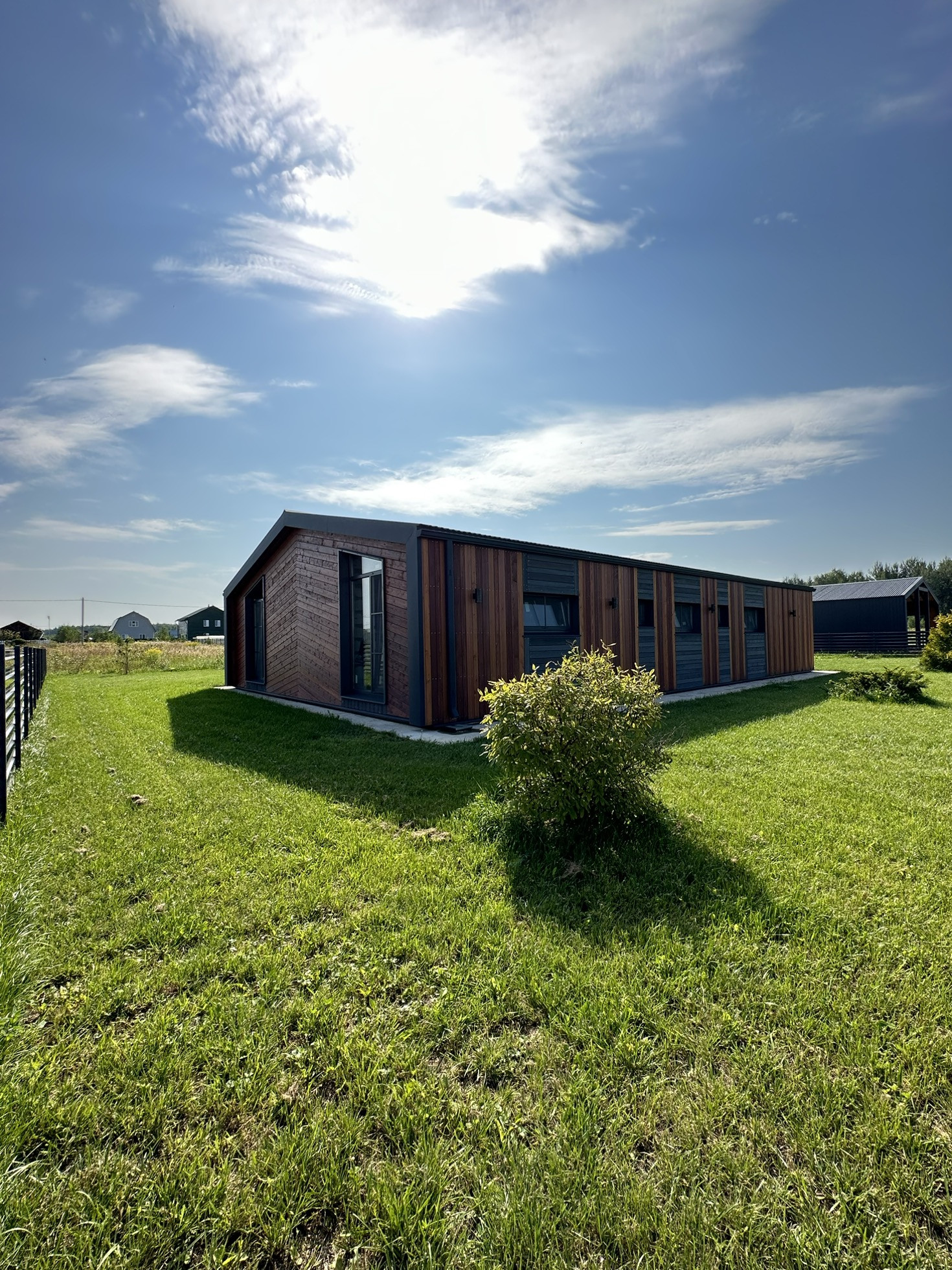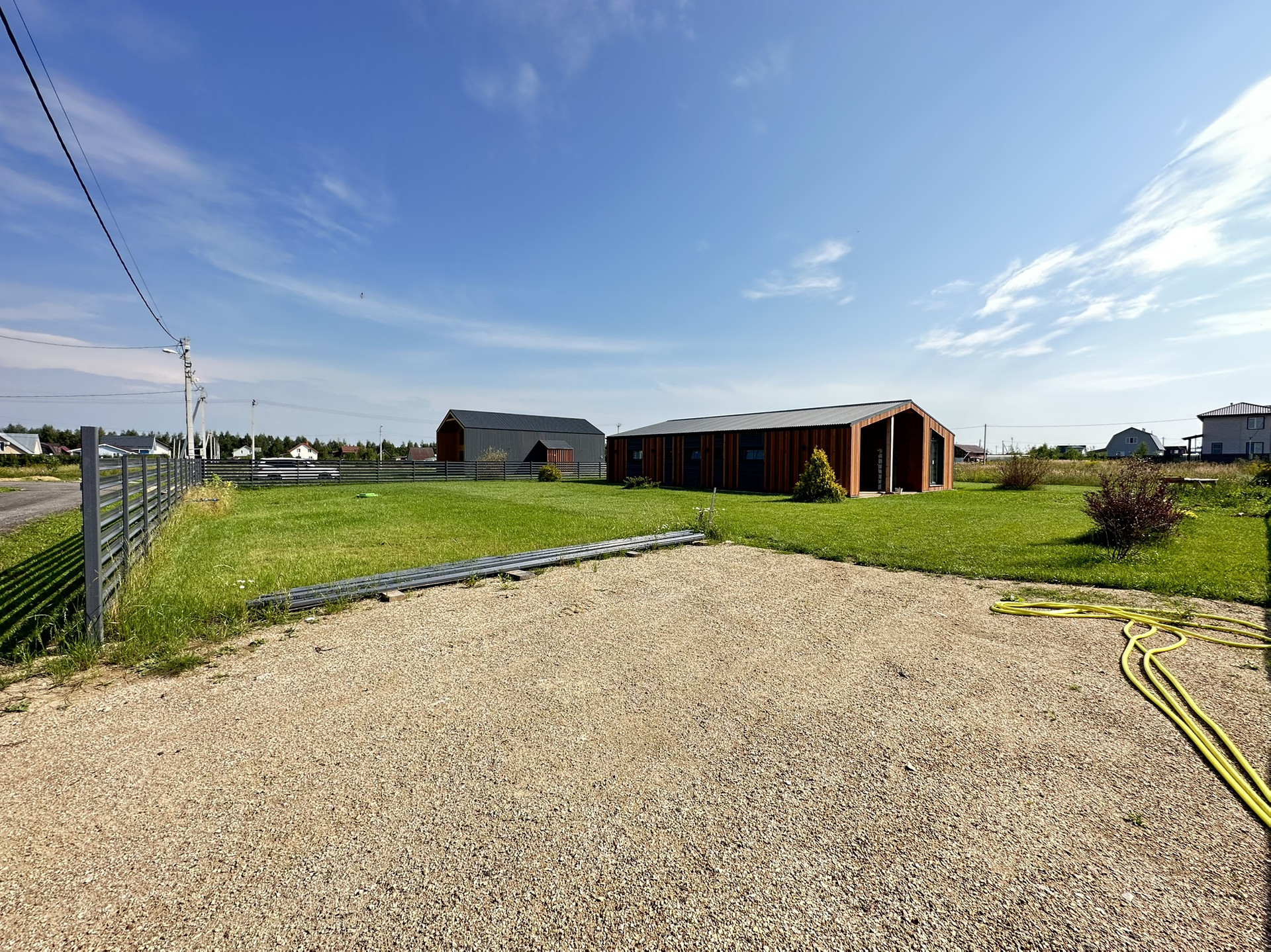Дом снаружи отделан полностью, использовались такие материалы, как металл с цветом(7024), имитация бруса и планкен лиственница. На участке 12 сот есть газон, все коммуникации подведены ( канализация, водопровод, электричество, отвод воды, дренаж)