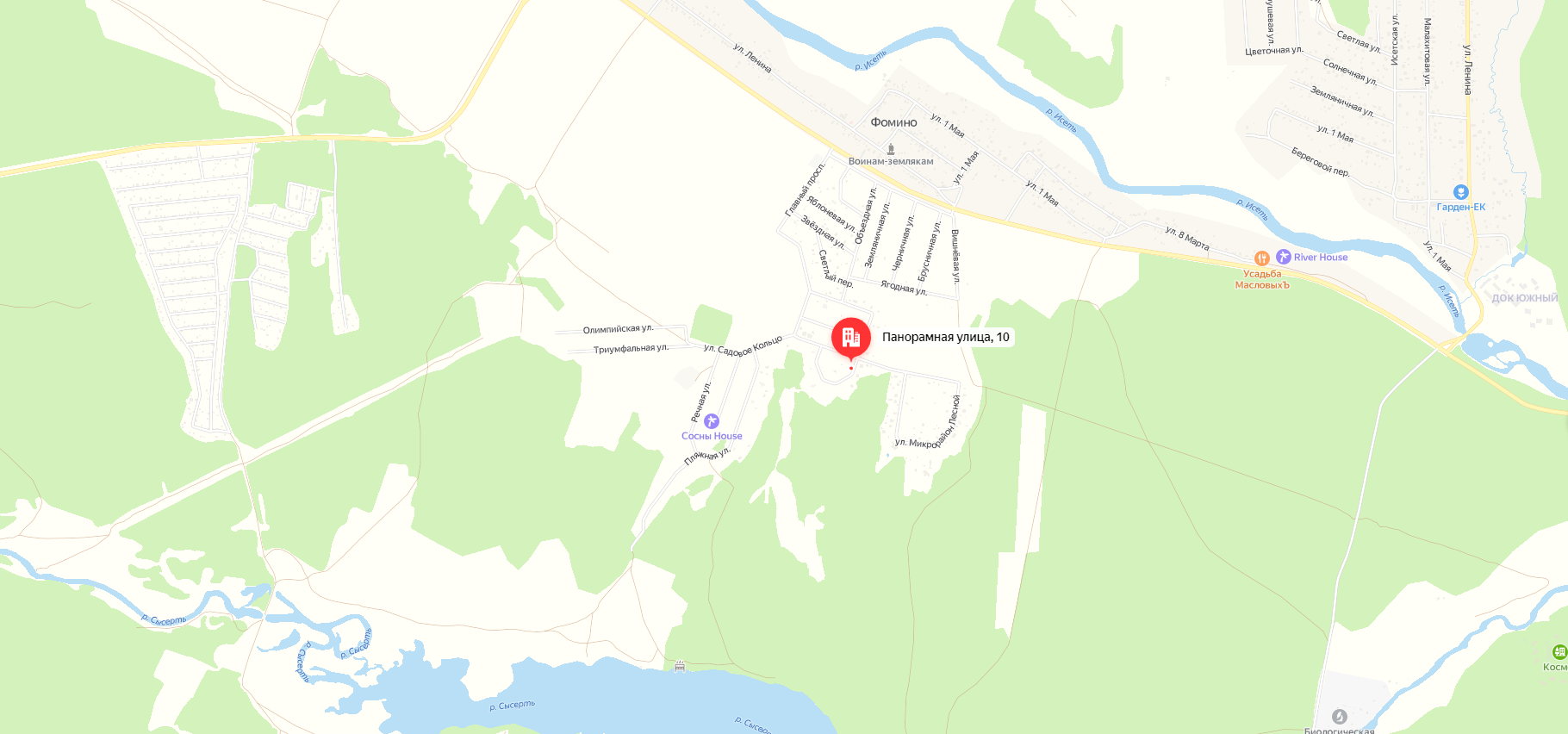 В 700 метрах река Сысерть, а лес (с грибами и ягодами) прямо через дорогу.