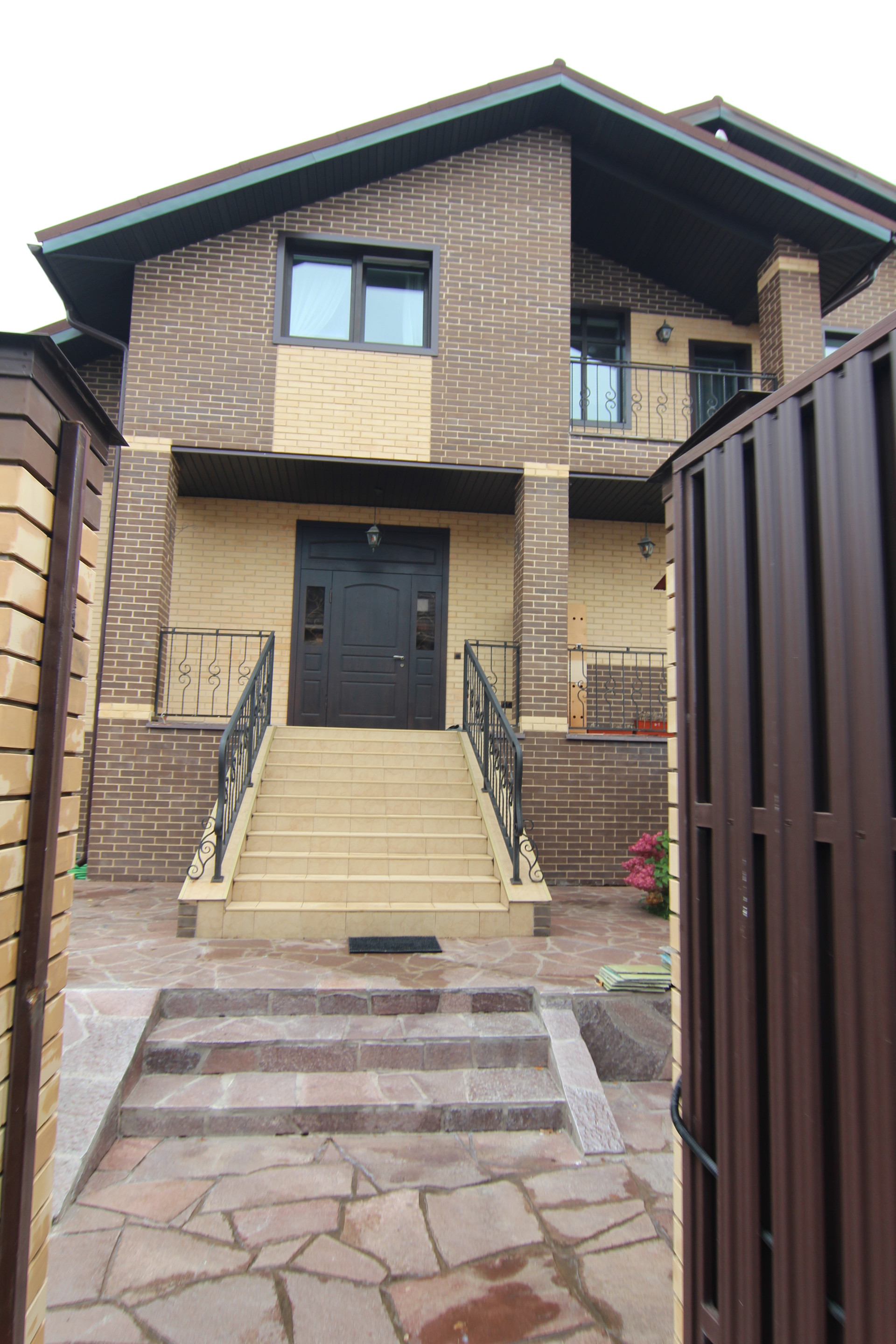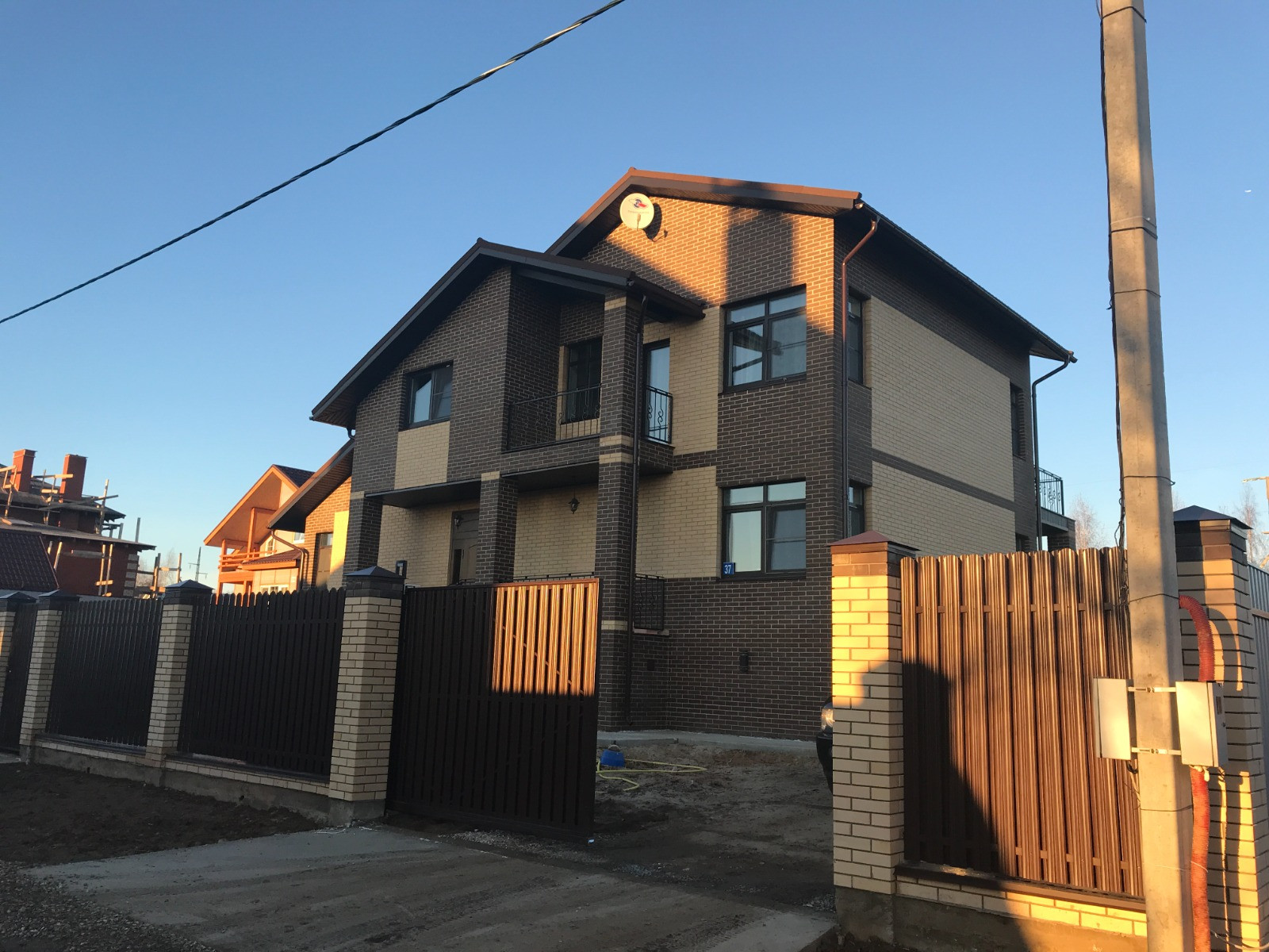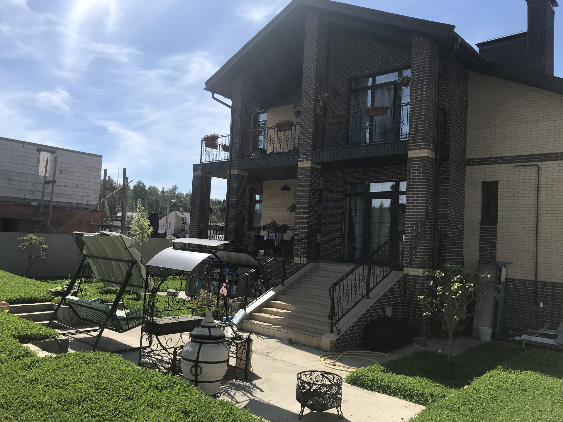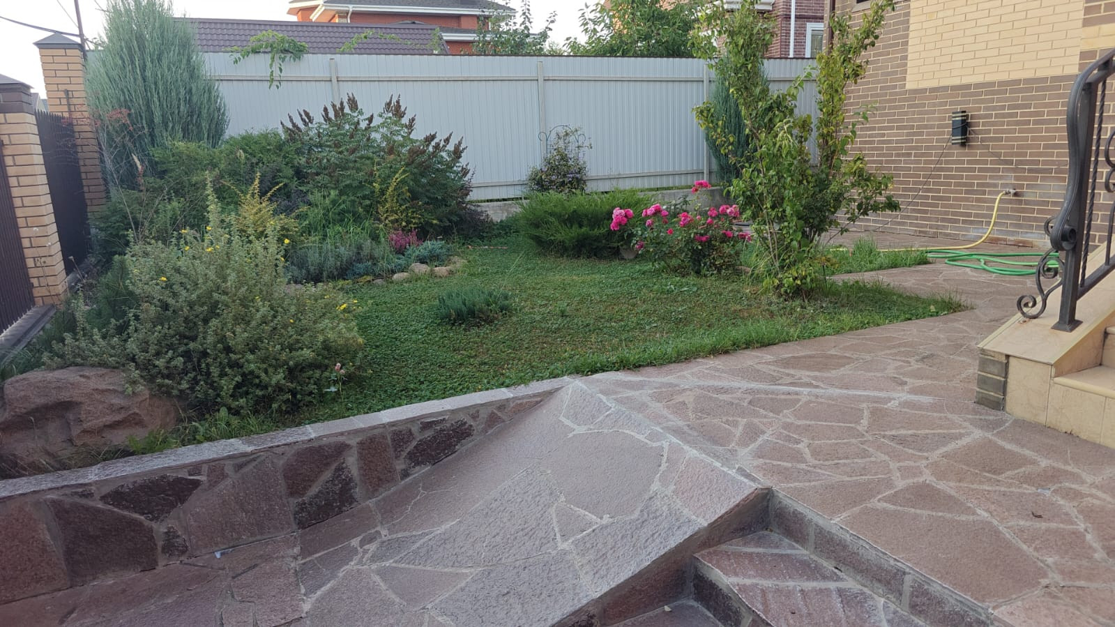 Участок полностью огорожен, выполнена отмостка и укладка природного камня (ламизит) по периметру дома, в парковочной и пешеходных зонах.