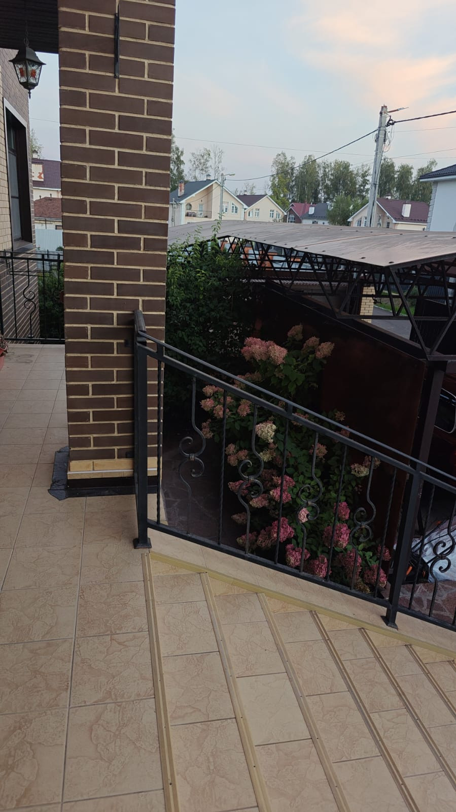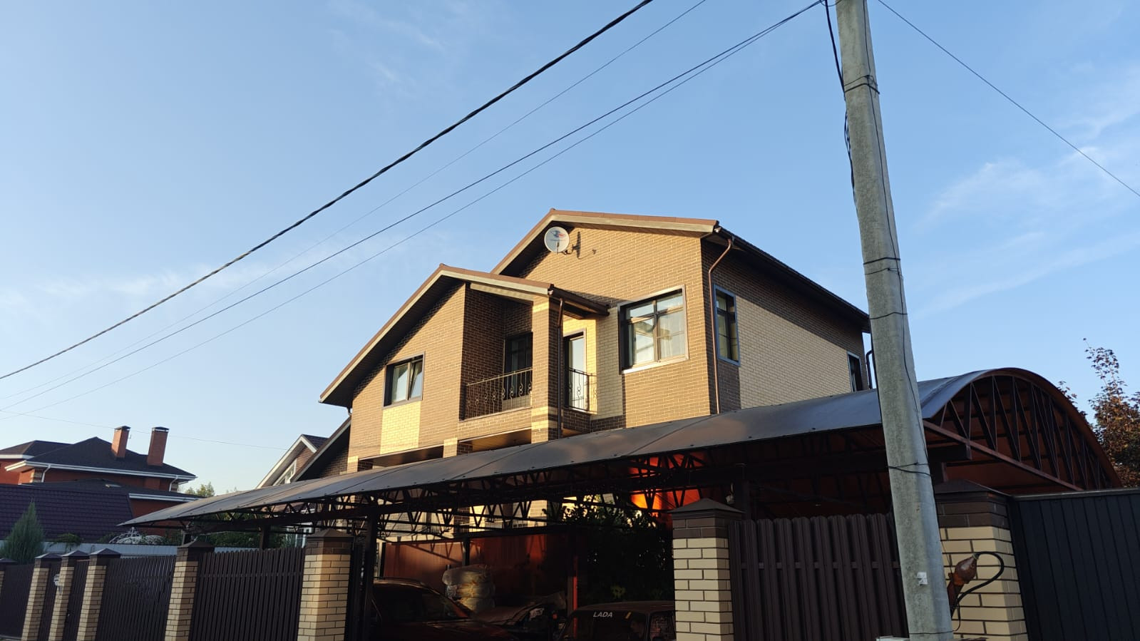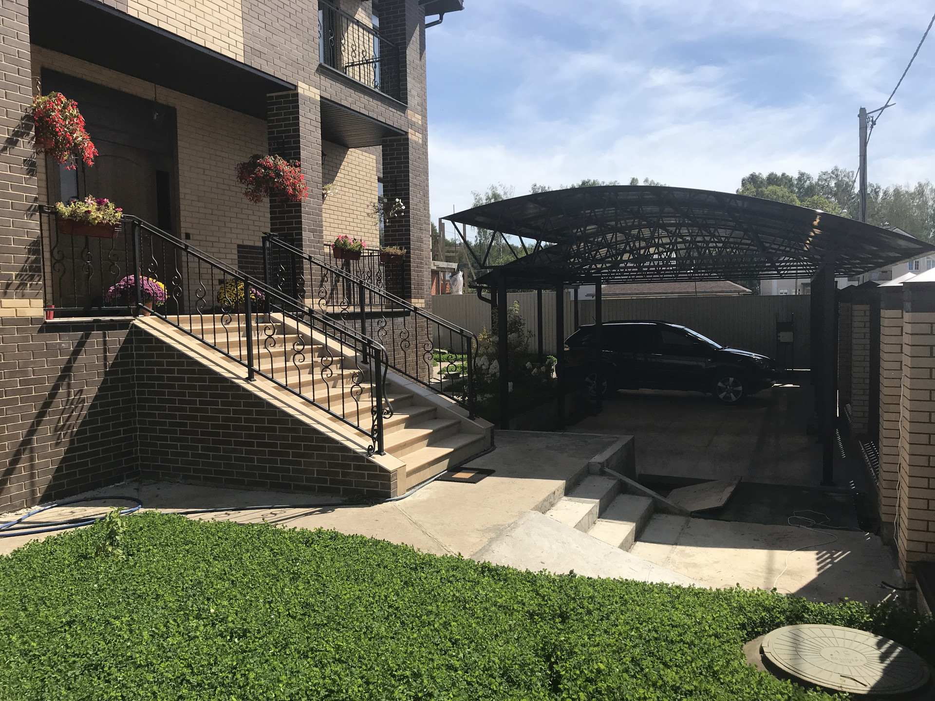 Парковочная зона с навесом на 3 автомобиля и входная группа с откатными воротами и калиткой.