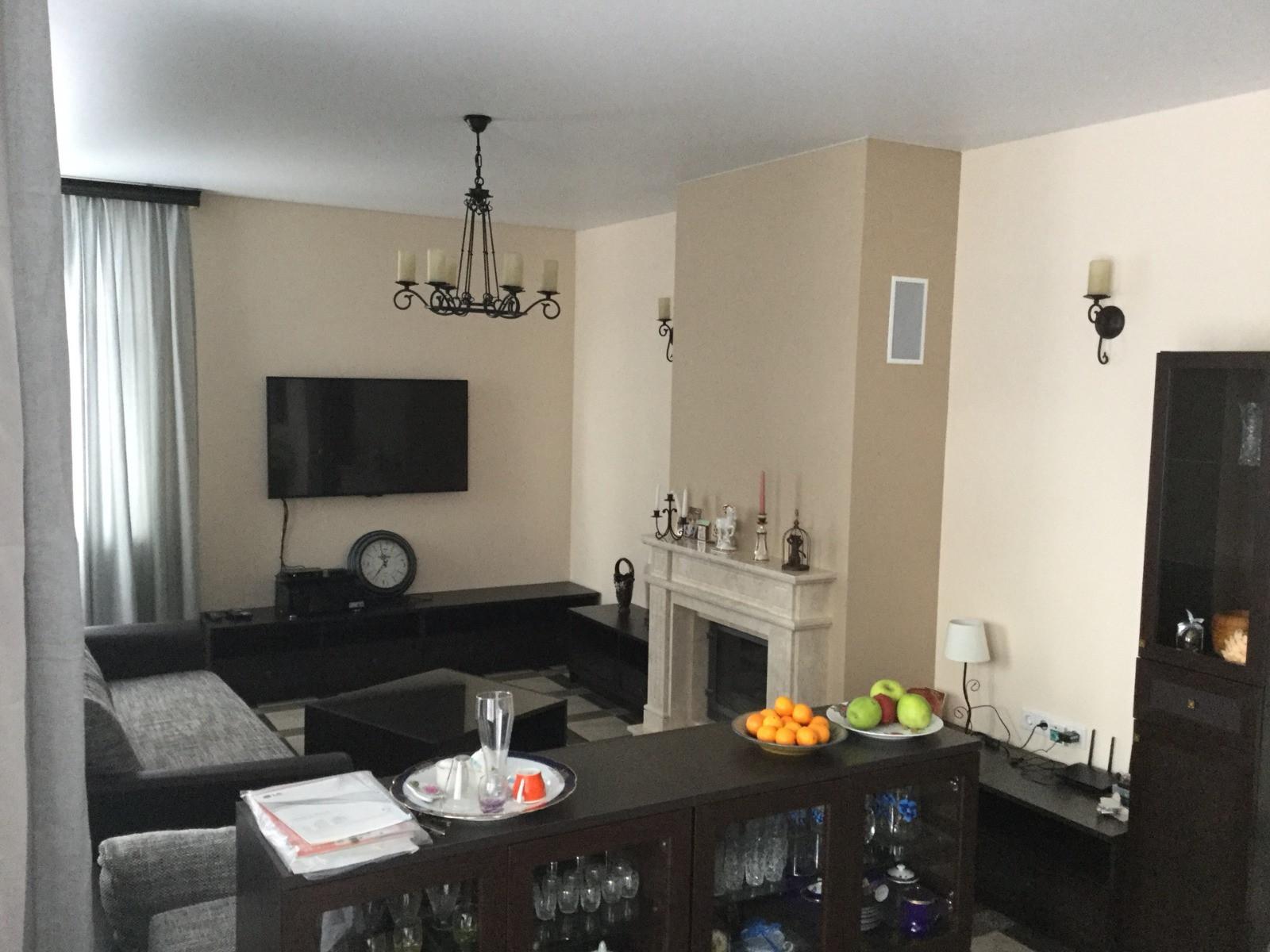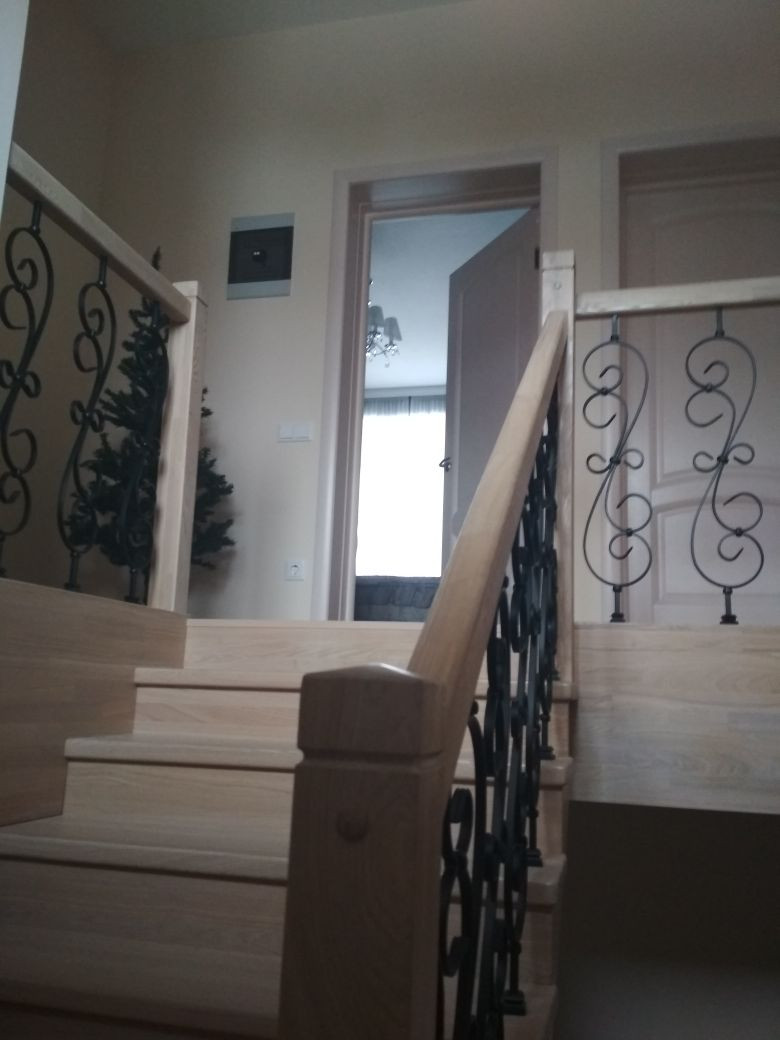 На первом этаже расположены: кухня с панорамной гостиной, с витражным остеклением (ст/пакет тройной, энергосберегающий с легкой тонировкой от солнца) с выходом на крытую летнюю террасу и во двор, 2 спальни, 2 санузла, хозяйственная комната. Кухня их массива ясеня. В гостиной дровяной камин с облицовкой мрамором.