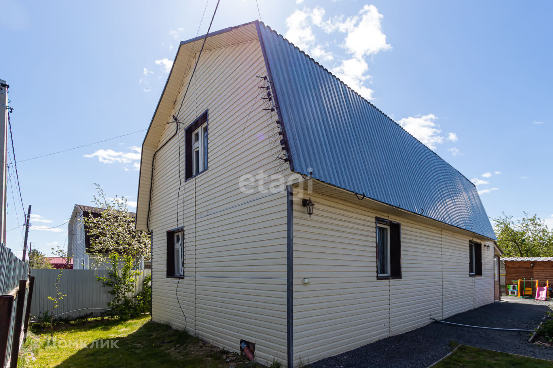 Двухэтажный дом (1 этаж и мансарда) общей площадью около 150 м2, расположен на участке правильной формы 5,5 соток.