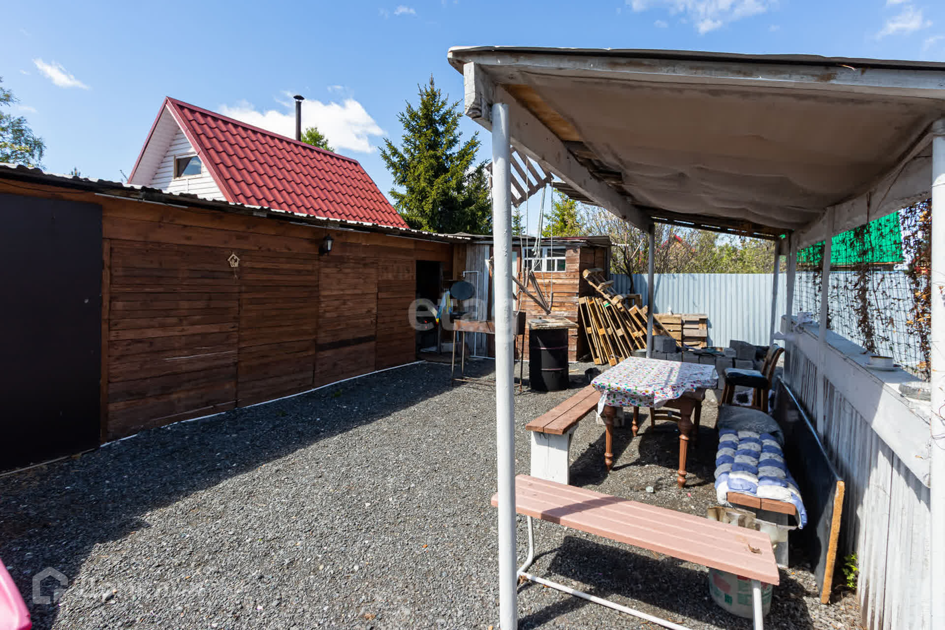 Участок разработан,высокий,не требует дополнительно отсыпки.Есть небольшой огород с насаждениями, газон и отсыпанный срезкой участок - никогда нет грязи , сарай, дровник, беседка с крышей , по периметру летний водопровод ,в колодце вода чистая, большая парковка (до 5 машин ). Парковка для авто и дорожки закатаны асфальтовой срезкой.