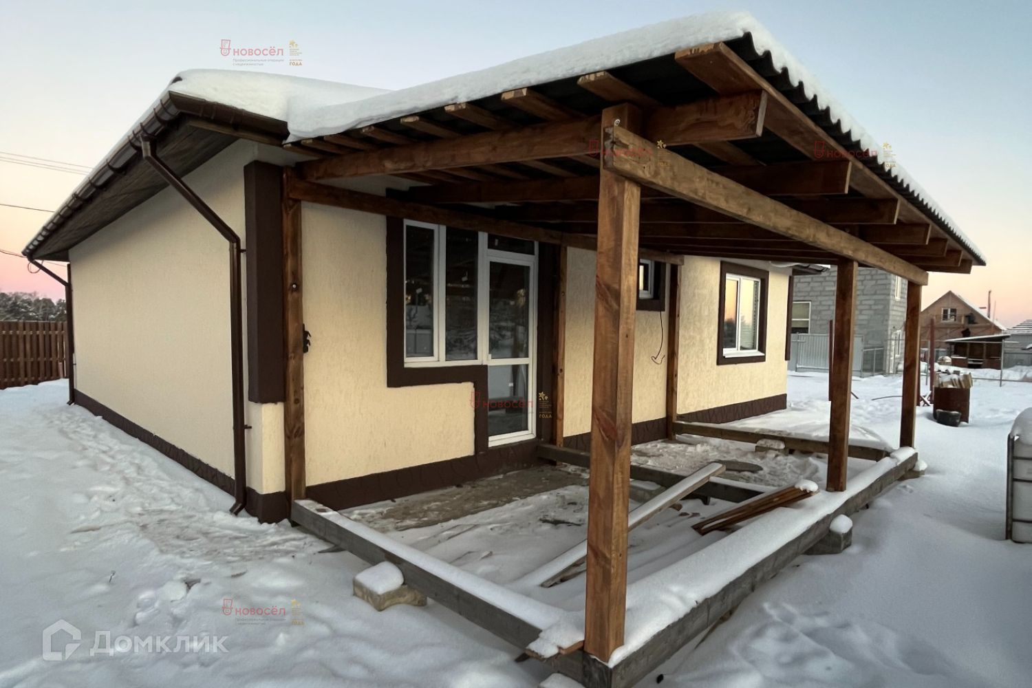 Площадь 115 кв.м., материал стен- твинблок, утеплитель. Материал крыши - ондулин. Коммуникации: отопление, тёплый пол, электричество 15 киловатт заведено в дом, скважина 48 метров, септик 6 кубов.