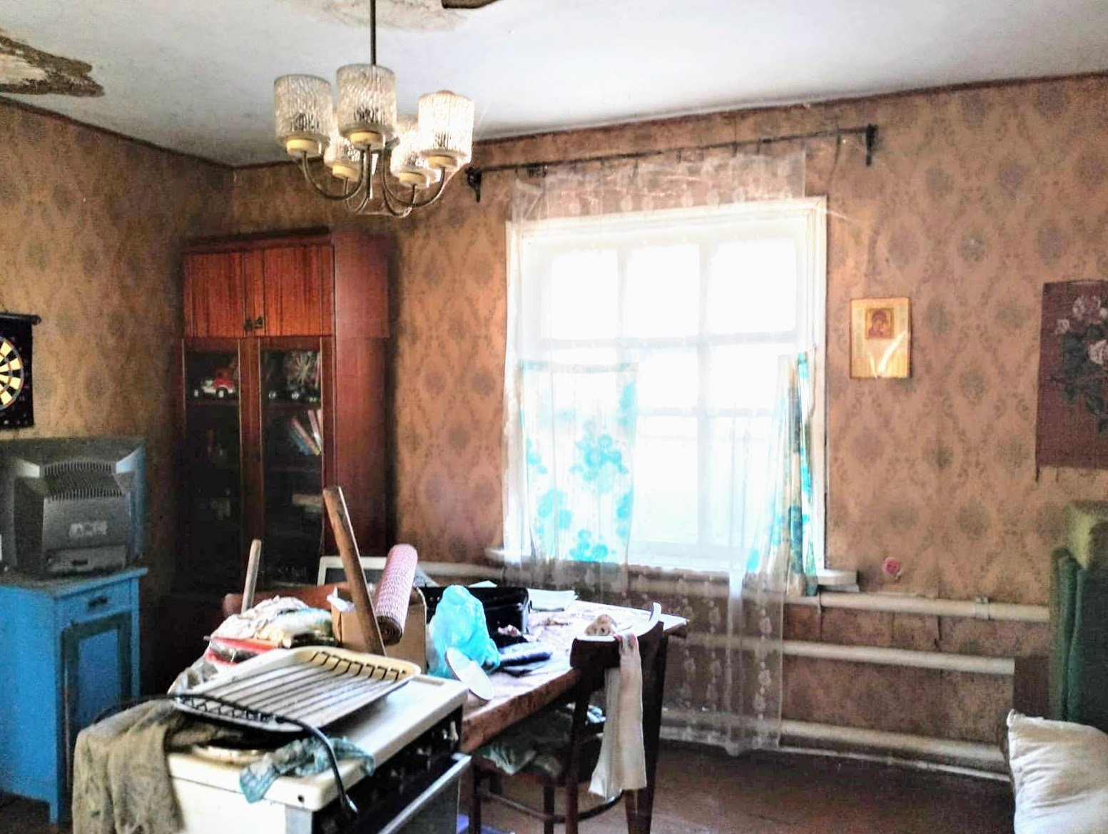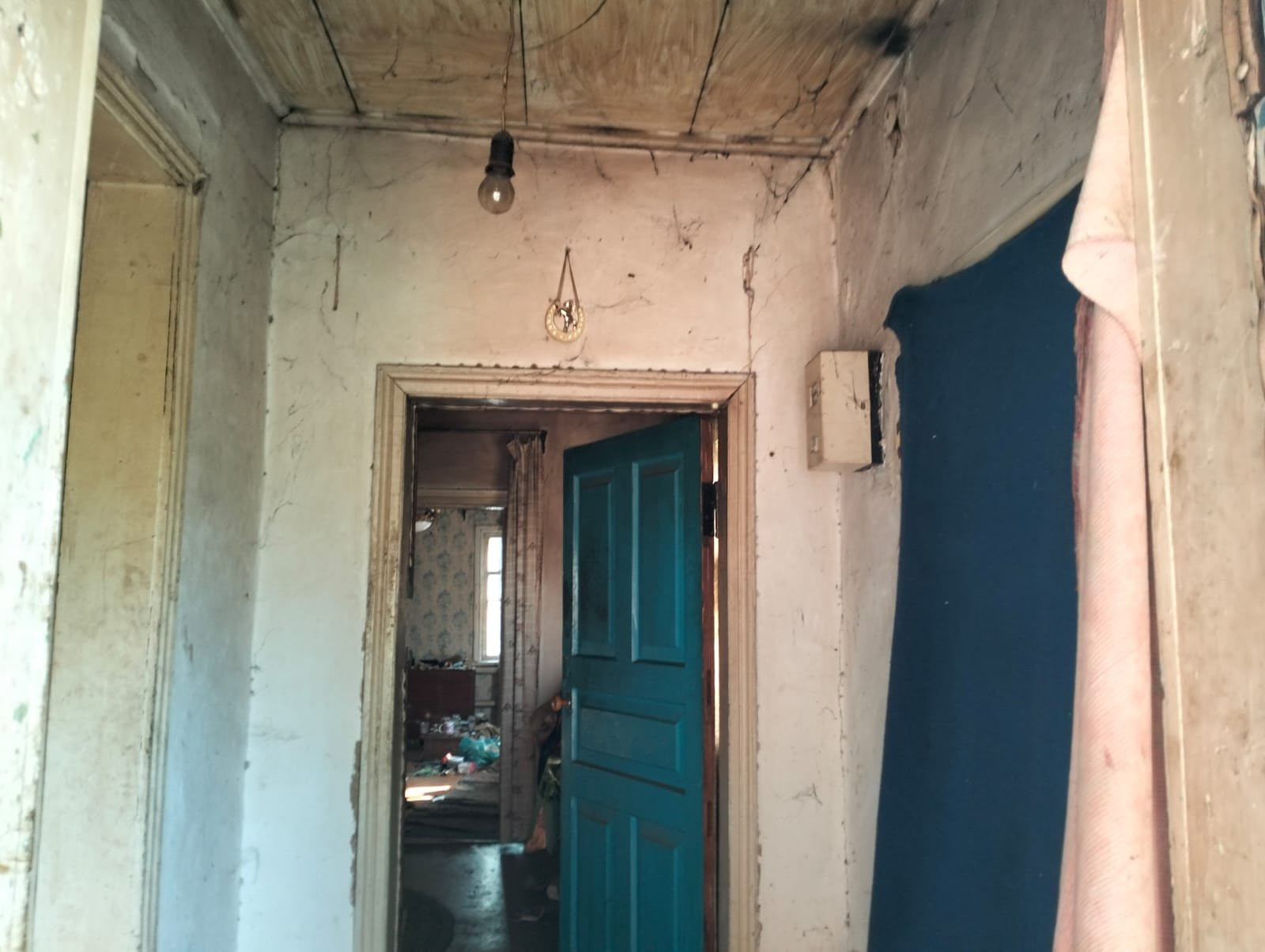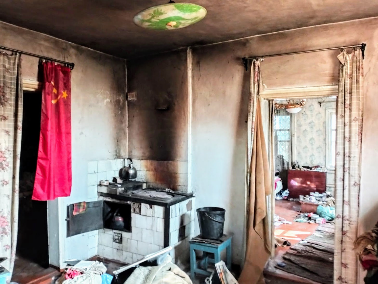 Состоит из пяти жилых комнат смежно-раздельного расположения, кухни, с/у и коридора. На стенах обои, потолки - побелены, полы застелены листами ДВП. В кухне стены на 1/2 окрашены краской, рабочая зона облицована кафелем, потолок - побелен, полы - ДВП. С/у совмещенный, на ½ облицован кафелем. Установлены счетчики на коммуникации. Отопление - напольный газовый котел. Входная дверь - деревянная.