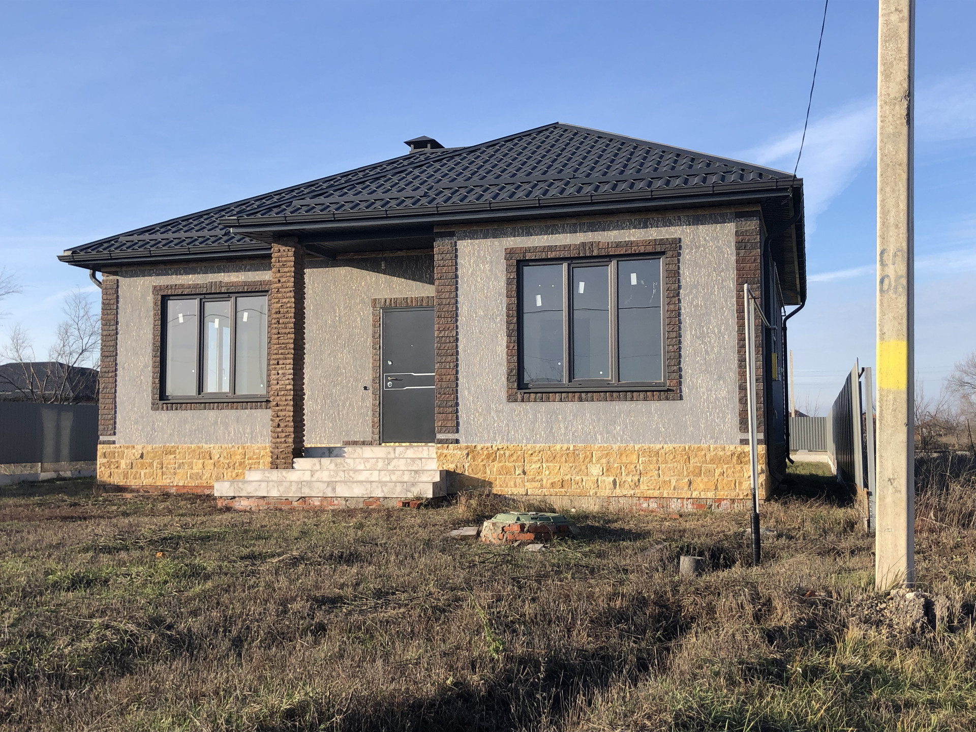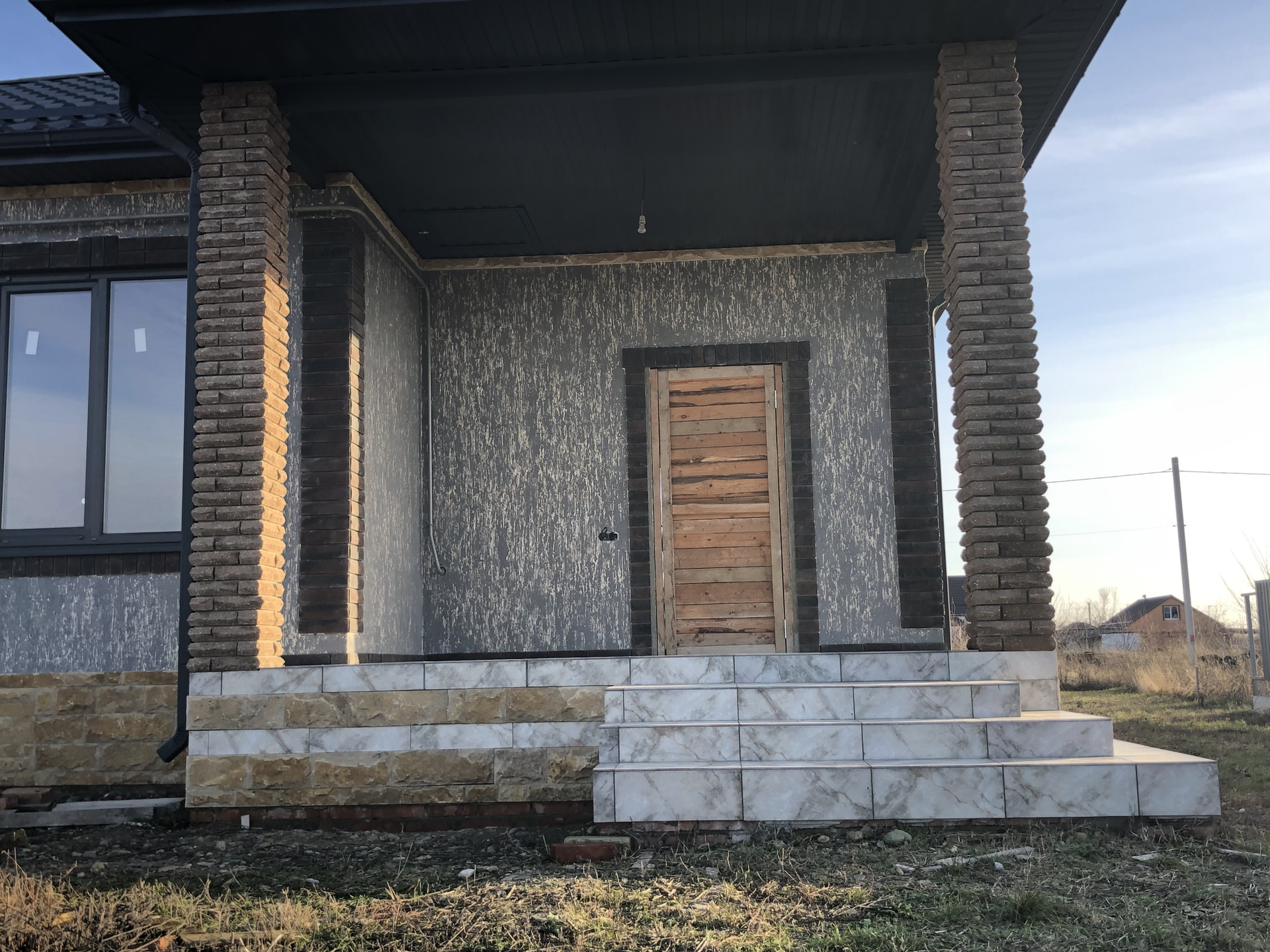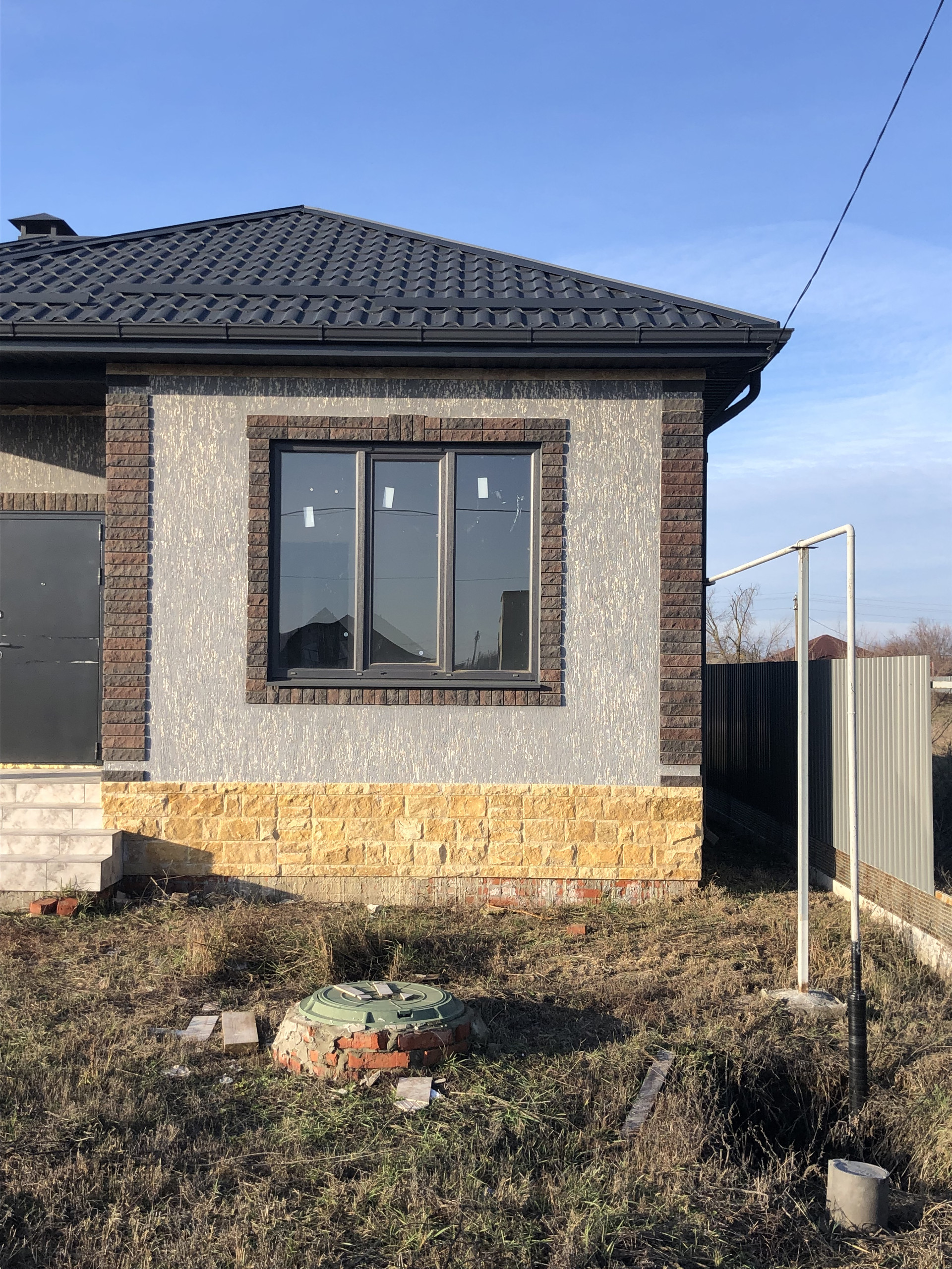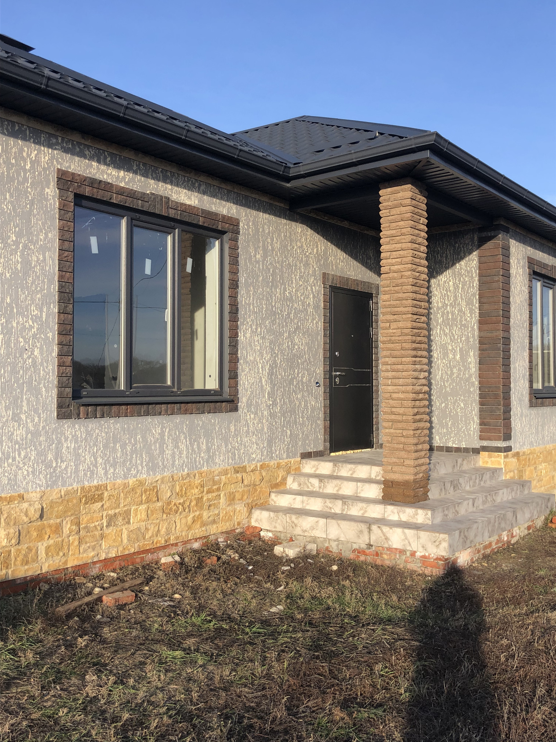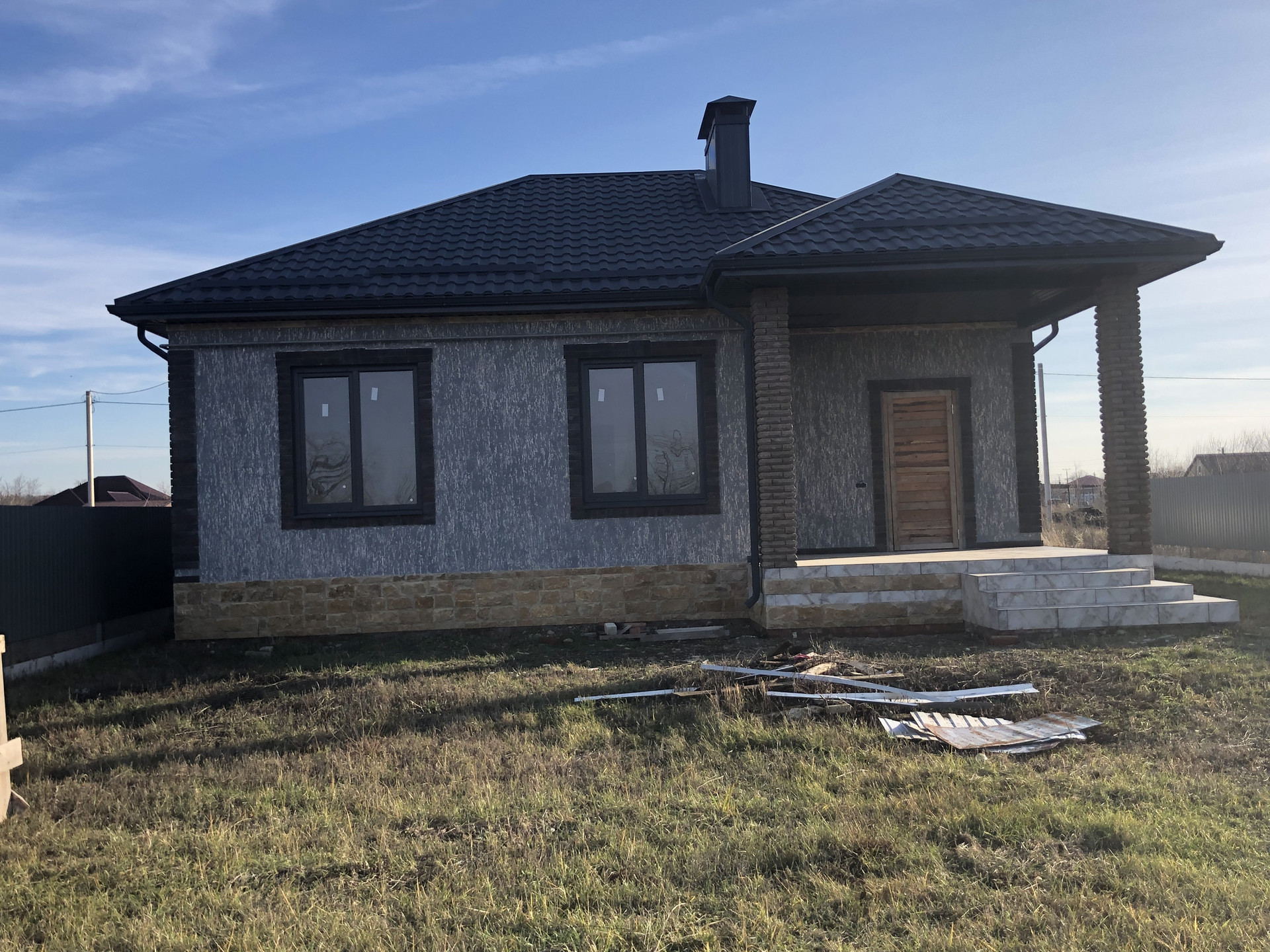 Дом с высоким цоколем, который отделан дагестанским камнем. Стены из газоблока, потолок утеплён в 3-и слоя, высота потолков 3 м., снаружи отделка - короед с окрасом. Предчистовая отделка (стены оштукатурены и ошпаклёваны), тёплые полы (тамбур, коридор, кухня, ванна), пол чистовой.  Дом газифицирован (котёл Navien 24 кВт.). Вода проведена, канализация – септик (2 ж/б кольца). В помещении кухни возведен дымоход на 4 вентканала. Роскошная терраса, с чердачным помещением, большие окна REHAU.