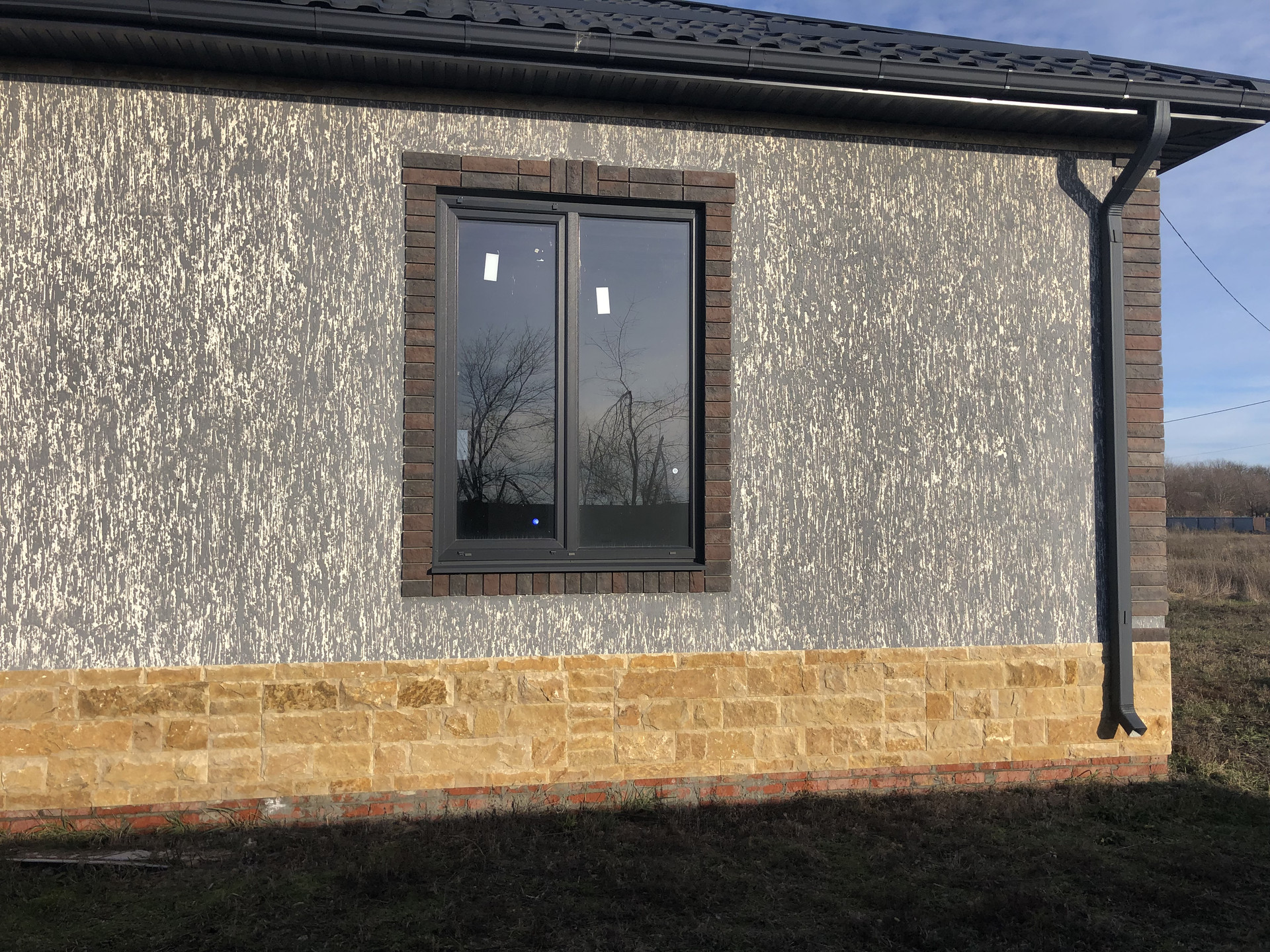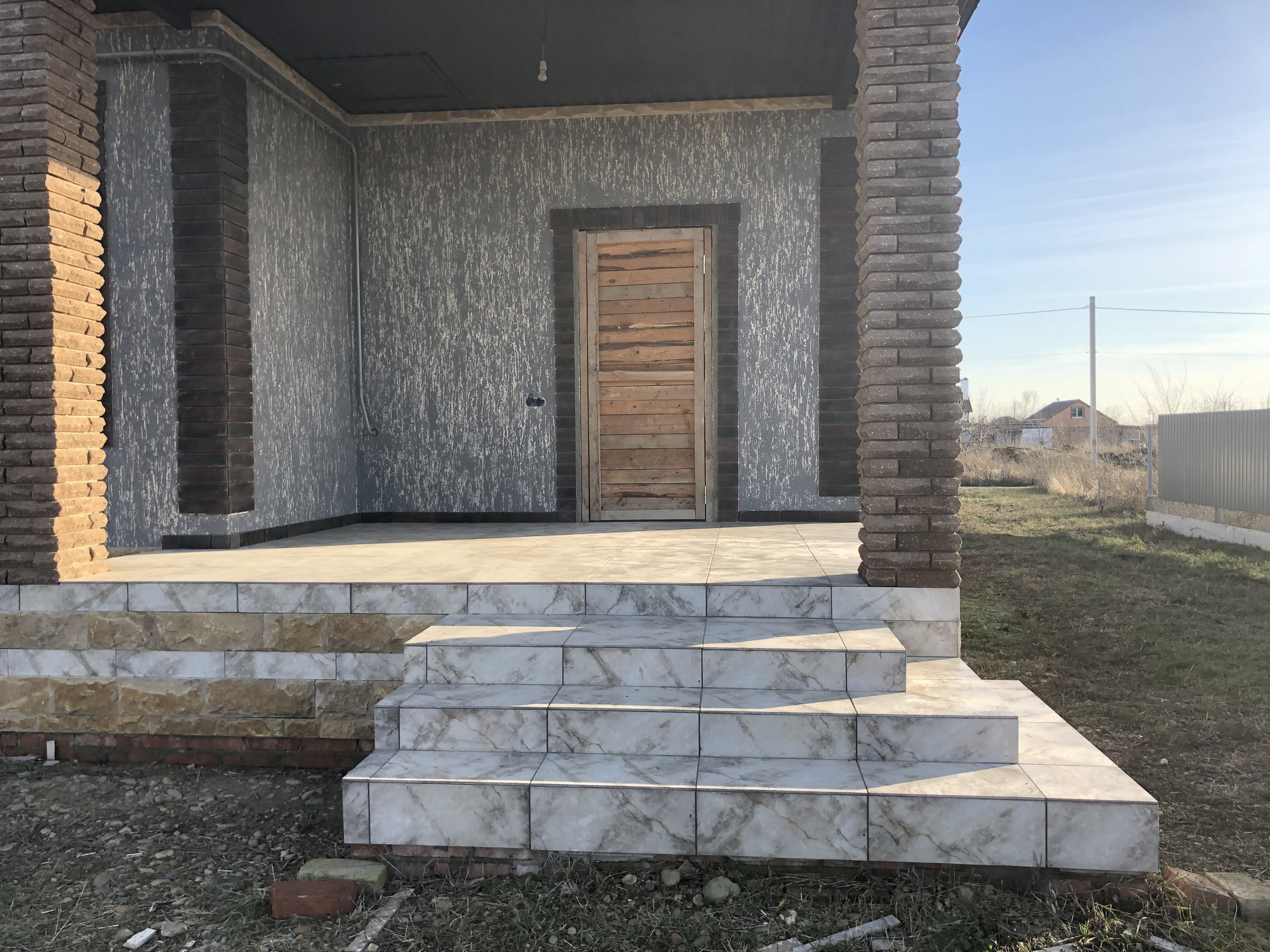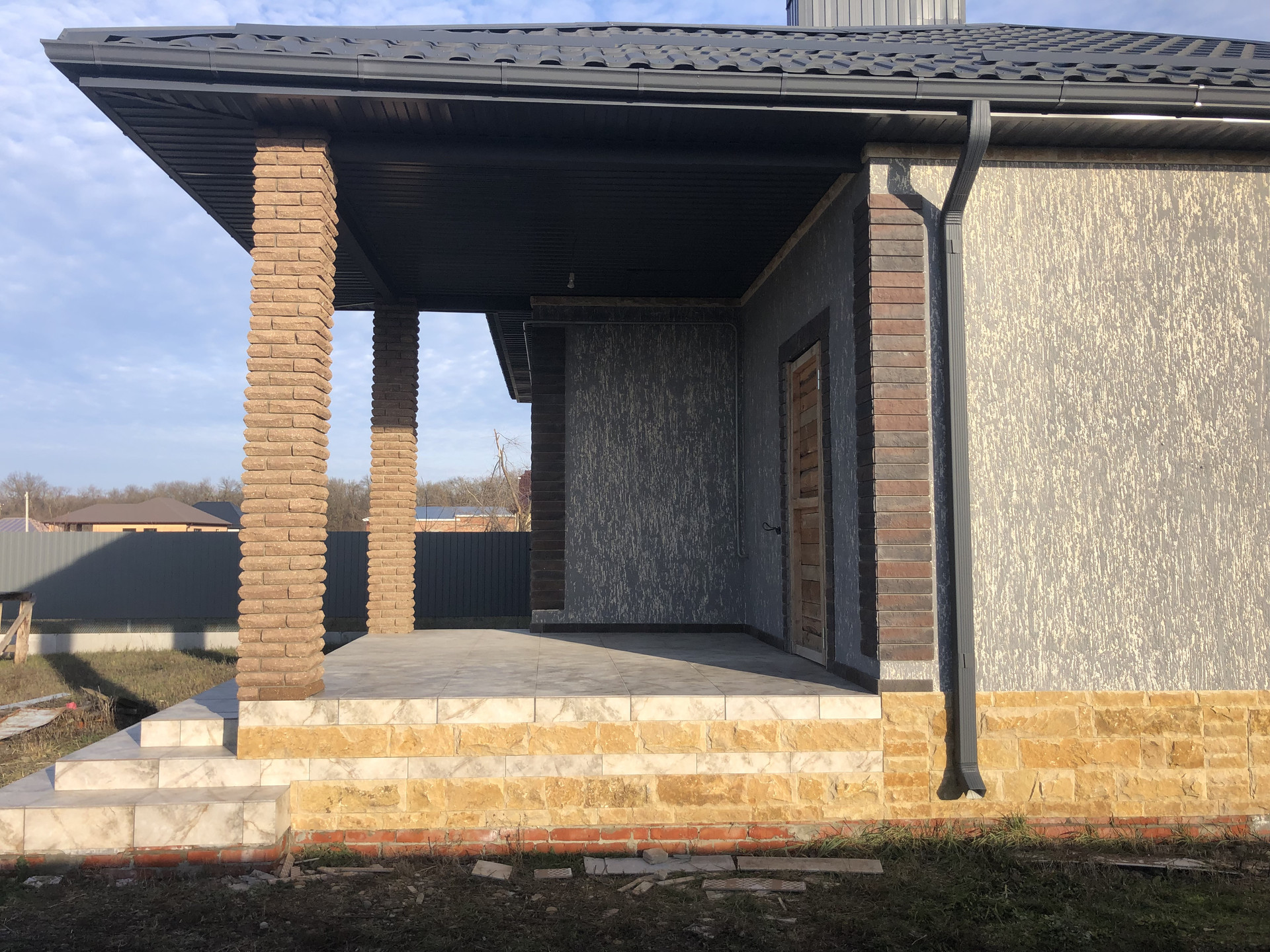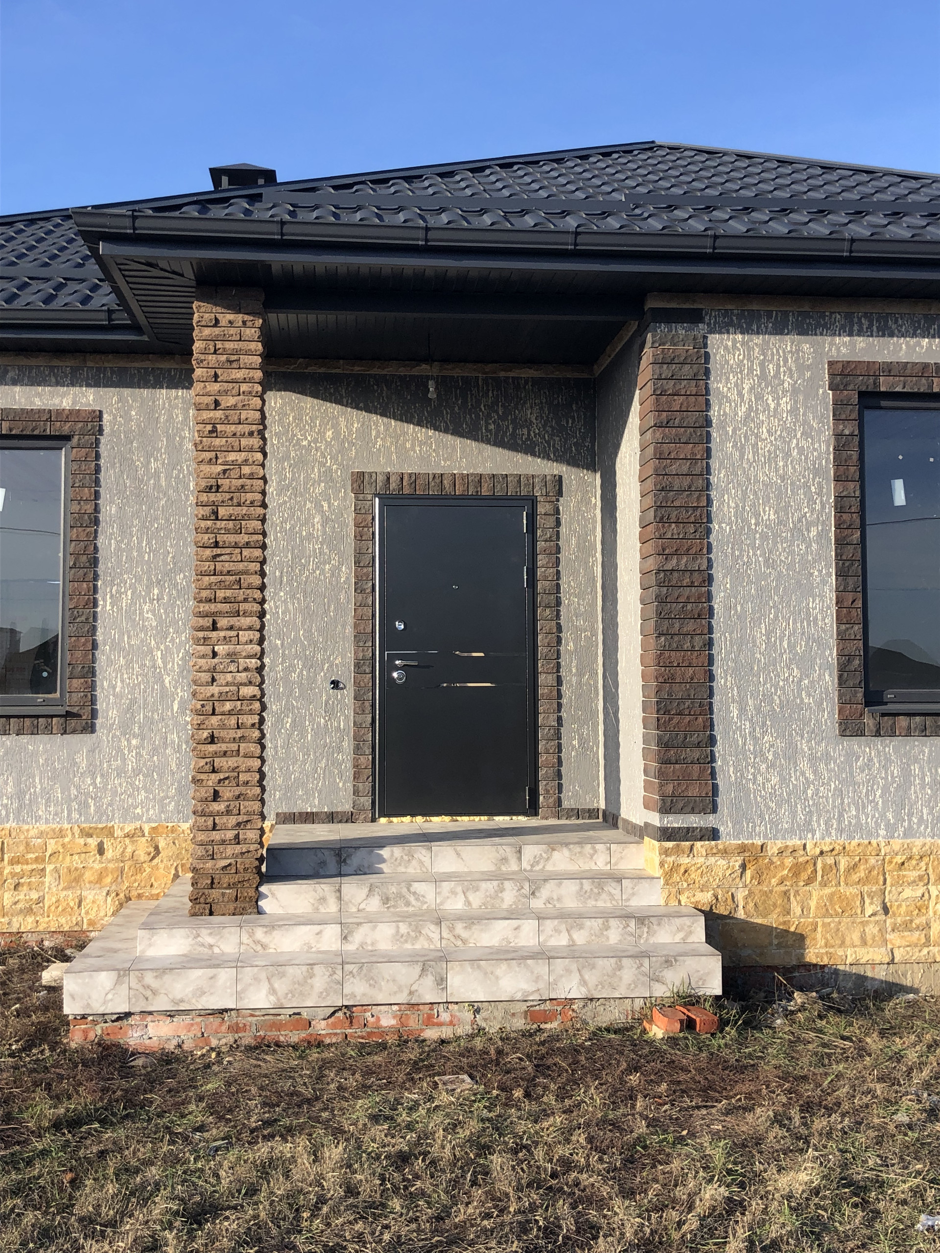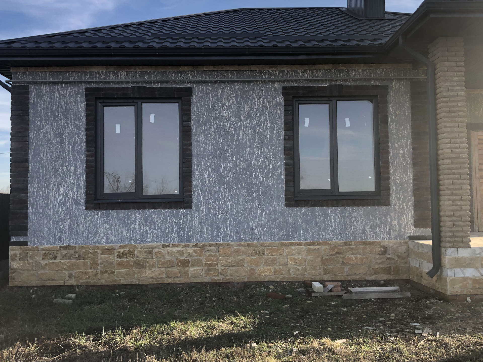 Дом с высоким цоколем, который отделан дагестанским камнем. Стены из газоблока, потолок утеплён в 3-и слоя, высота потолков 3 м., снаружи отделка - короед с окрасом. Предчистовая отделка (стены оштукатурены и ошпаклёваны), тёплые полы (тамбур, коридор, кухня, ванна), пол чистовой.  Дом газифицирован (котёл Navien 24 кВт.). Вода проведена, канализация – септик (2 ж/б кольца). В помещении кухни возведен дымоход на 4 вентканала. Роскошная терраса, с чердачным помещением, большие окна REHAU.