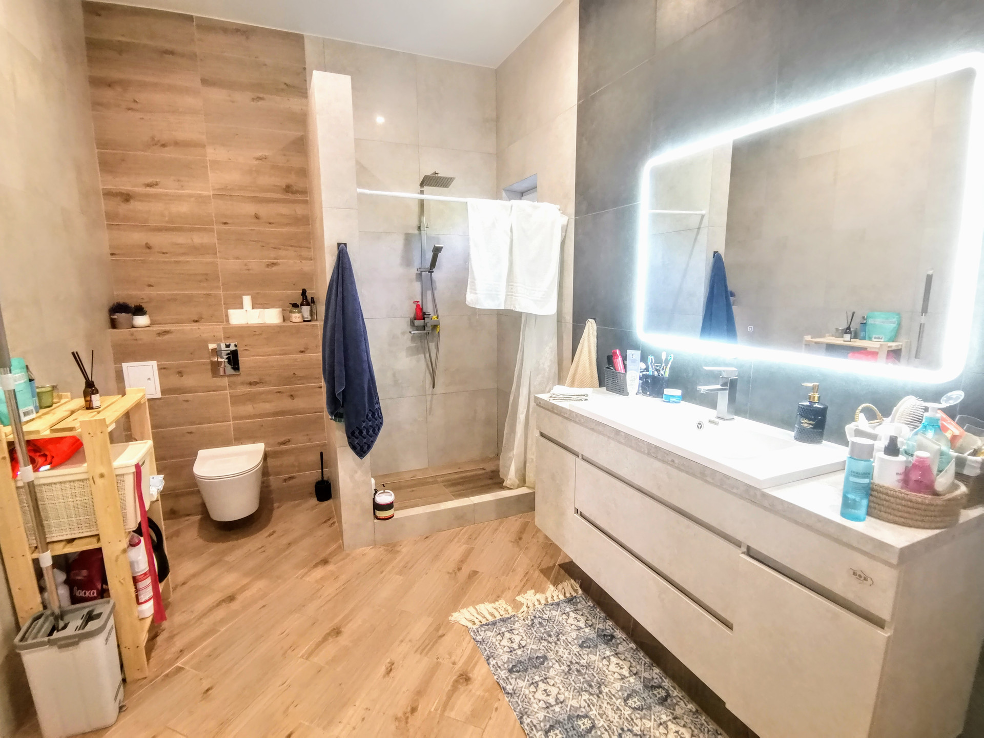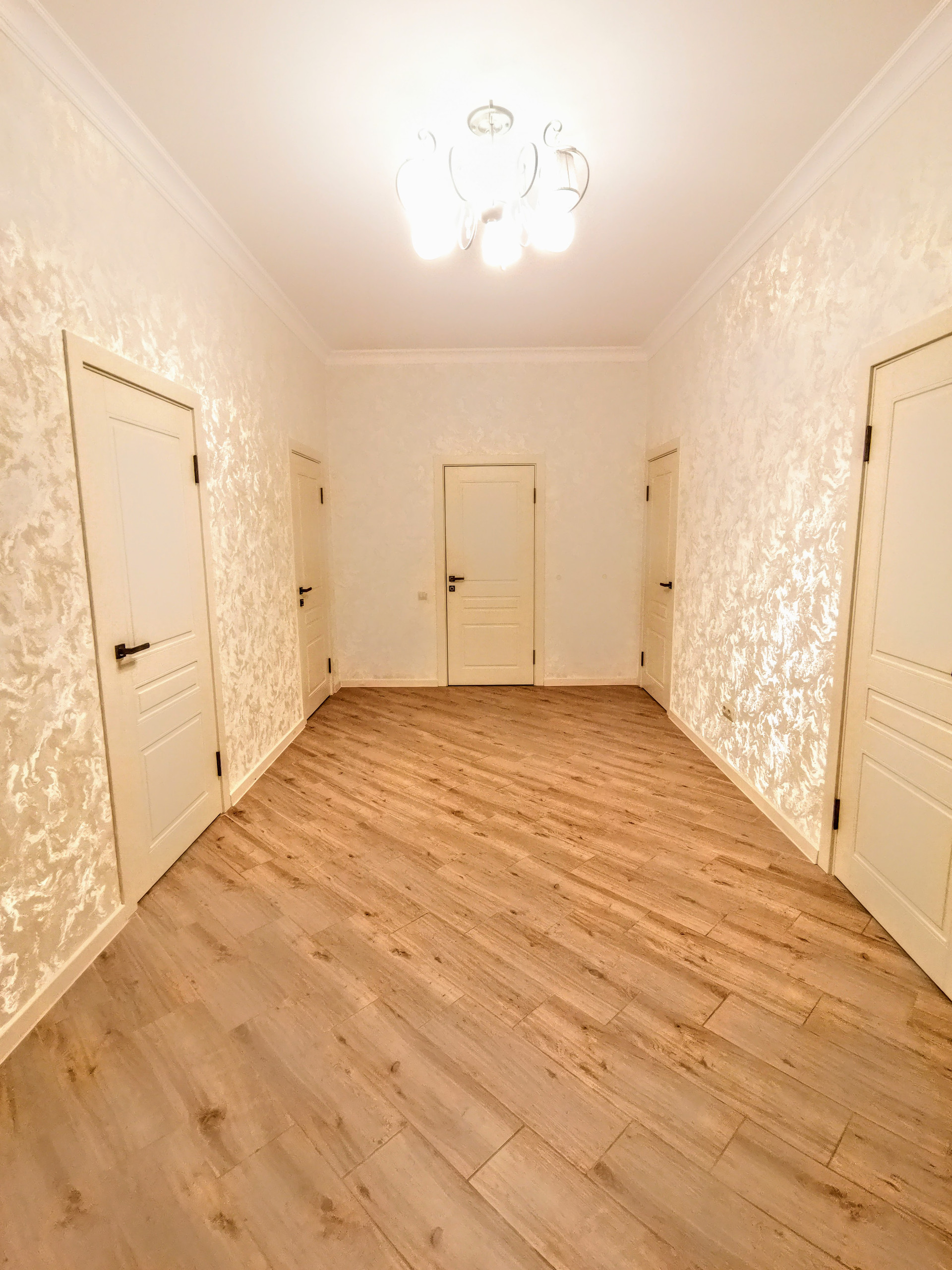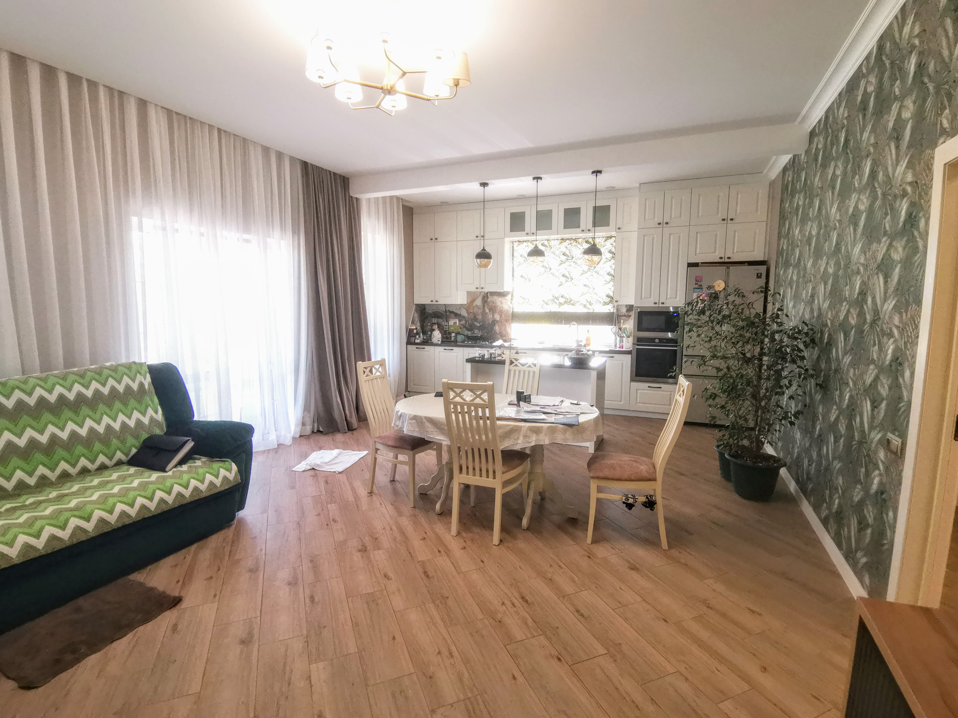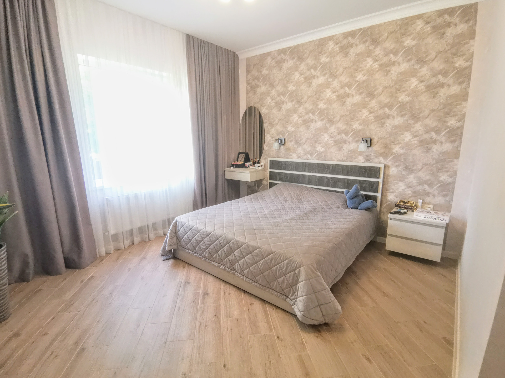 Имеет два входа. Состоит из трех жилых комнат раздельного расположения, кухни-гостиной с выходом на открытую террасу, большой гардеробной комнаты с выходом на чердак, с/у и коридора. Выполнен косметический ремонт из качественных материалов. Во всем доме стены оклеены обоями нейтральных цветов, потолки обшиты гипсокартоном, полы облицованы плиткой. С/у совмещенный, облицован плиткой, потолок - натяжной со встроенным точечным освещением. По договоренности, остается мебель и бытовая техника. Установлены металлопластиковые окна и двери. Приборы учета на все коммуникации (электричество на 380V). Сплит-система. Спутниковое ТВ. Интернет. Видеонаблюдение. Во всем доме установлена система “теплый пол”. Отопление - двухконтурный навесной газовый котел. Входная дверь - металлическая. Перед входом в дом построен капитальный навес.