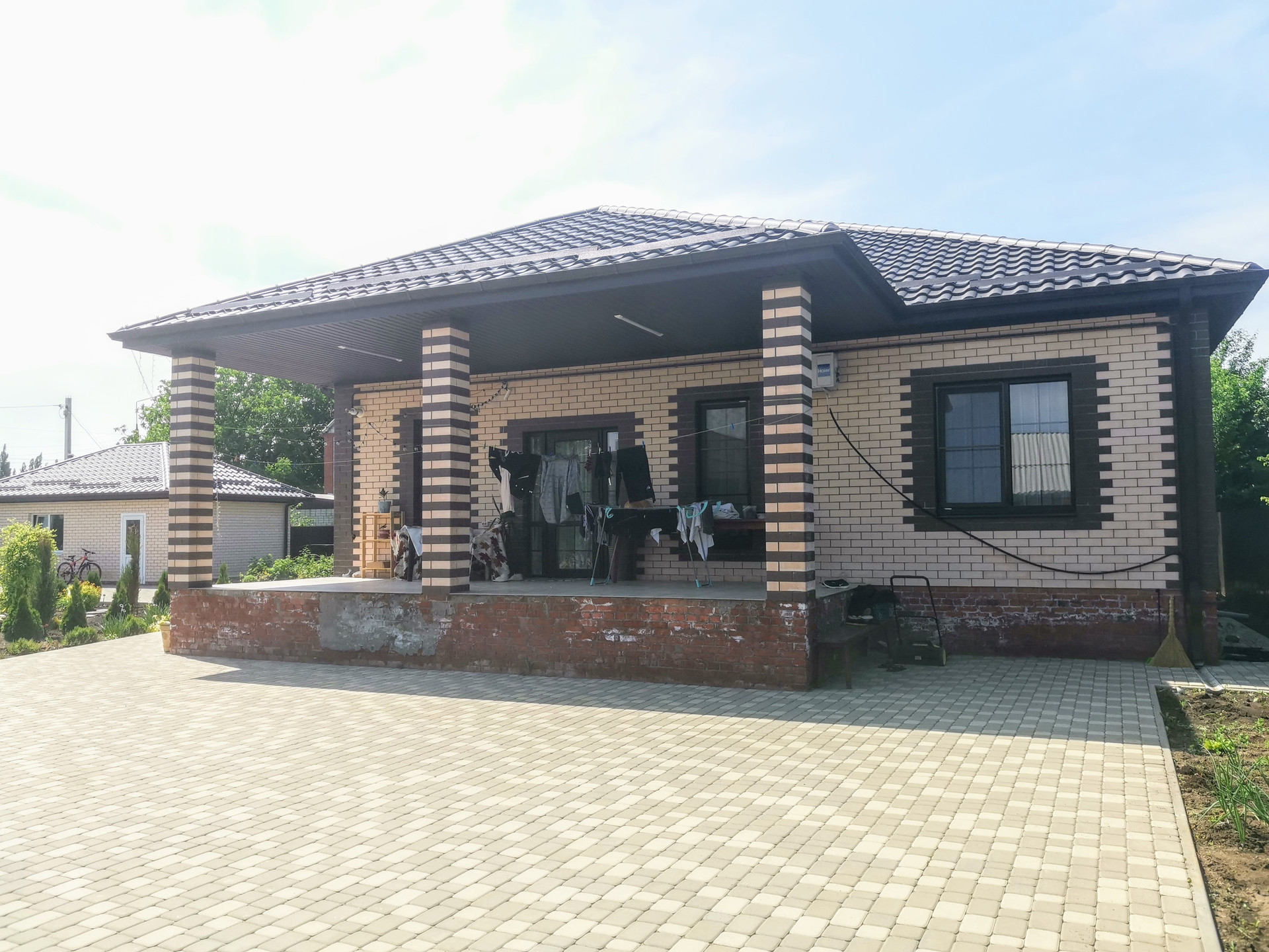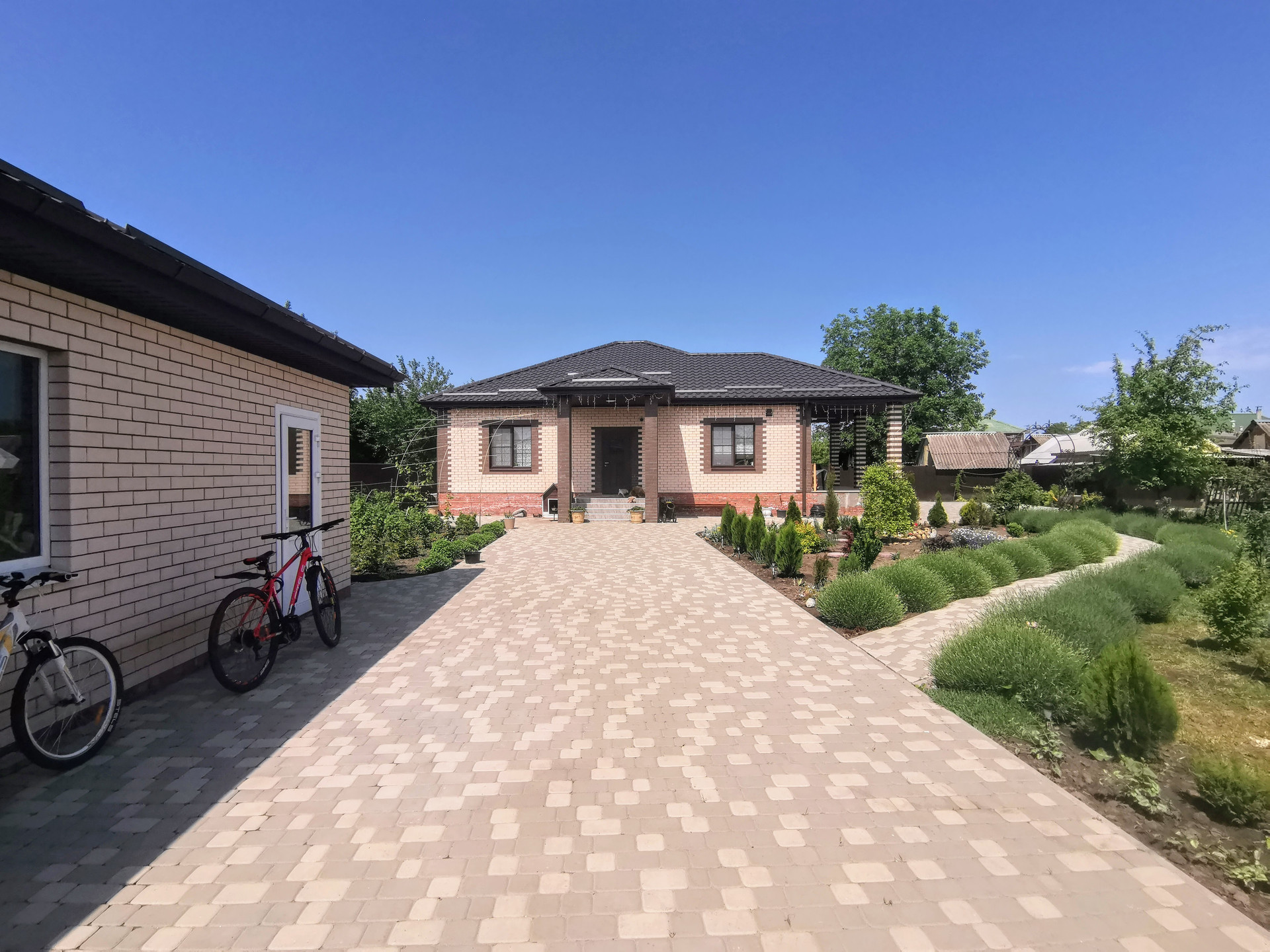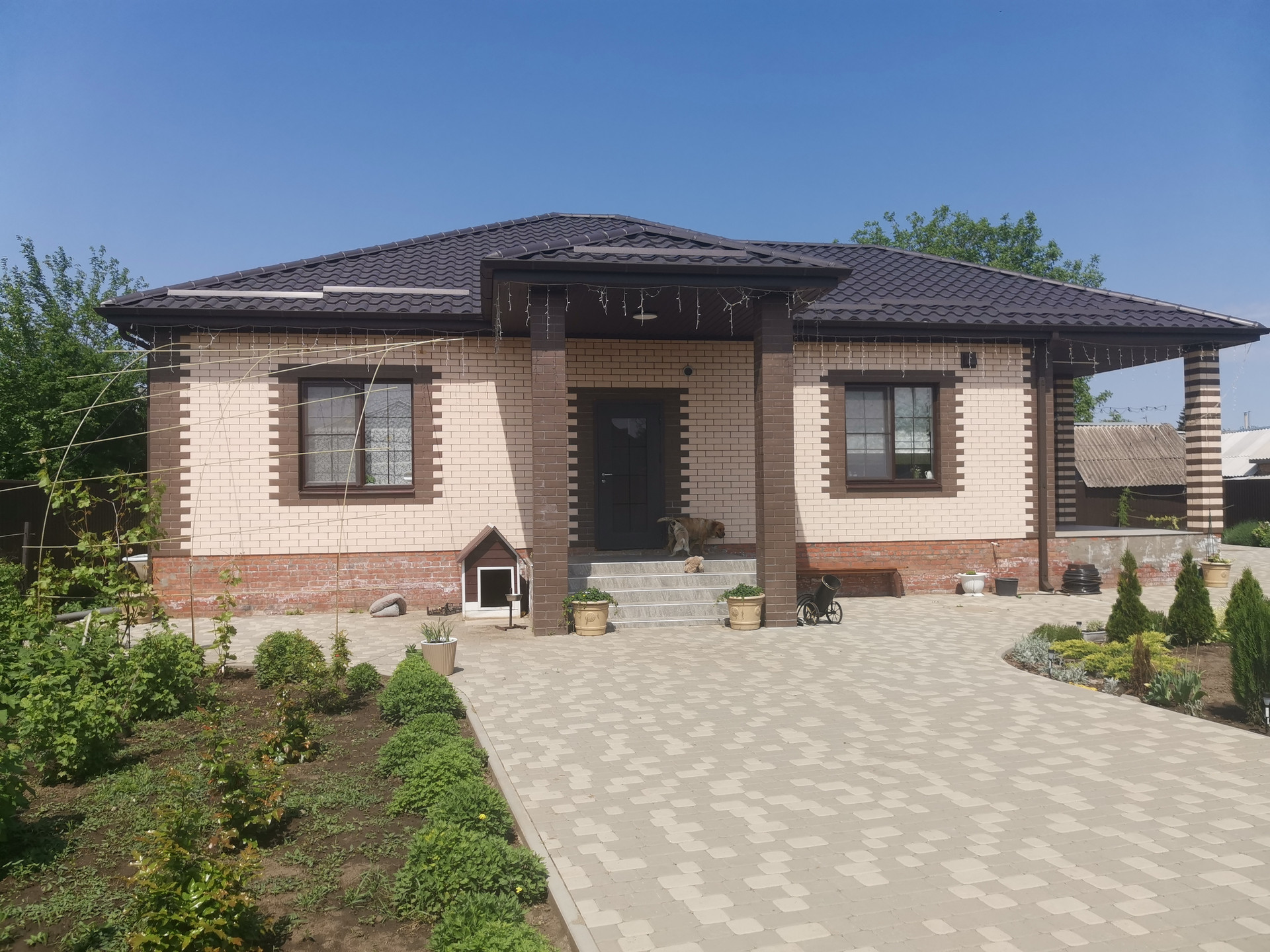 Из хоз.построек: кирпичный гараж на одну машину с автоматическими воротами, есть вывод воды на улицу. Канализация - септик (2 шт.). Ухоженный земельный участок 10,01 соток, с молодым садом, много деревьев хвойных пород. Есть палисадники и виноградник. Свободная территория двора вымощена тротуарной плиткой. Кирпичный забор, который обеспечивает тишину во дворе и в доме, ширина фасада более 30 м.. За двором облагороженная стоянка для автомобилей.