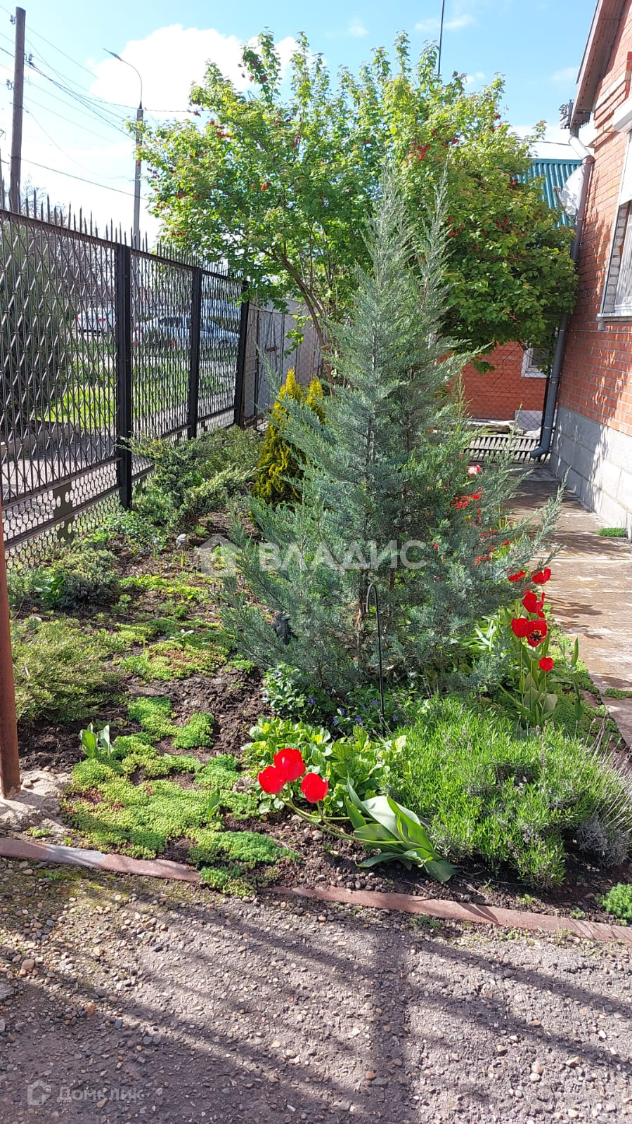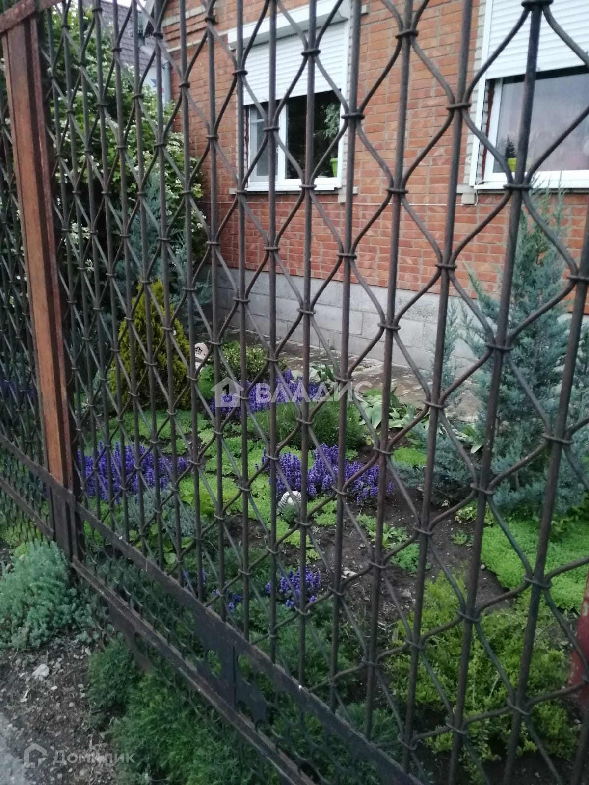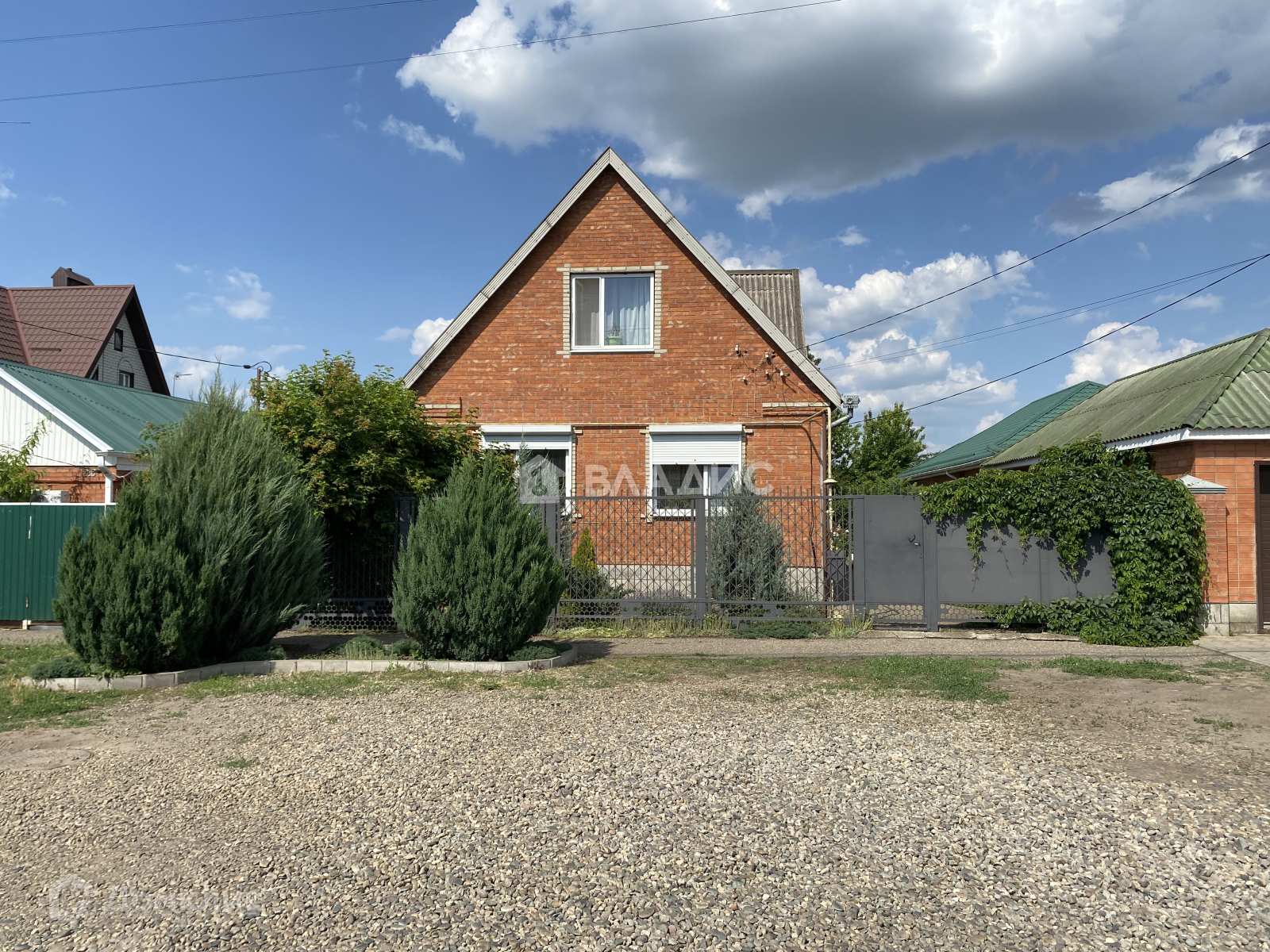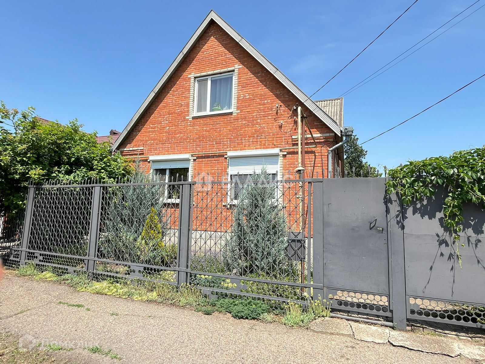 Стены - кирпич, кровля - шифер, забор - металлический.