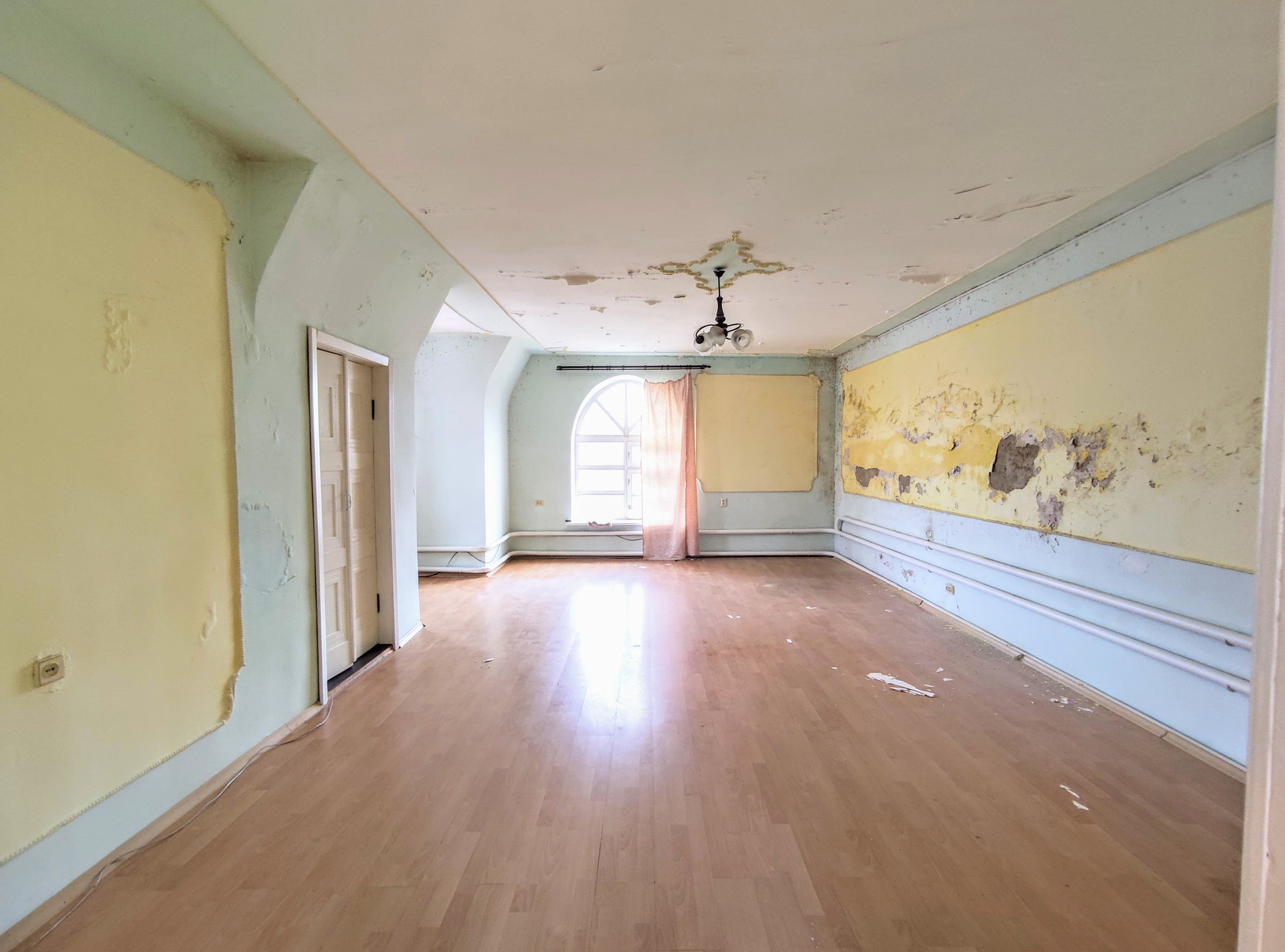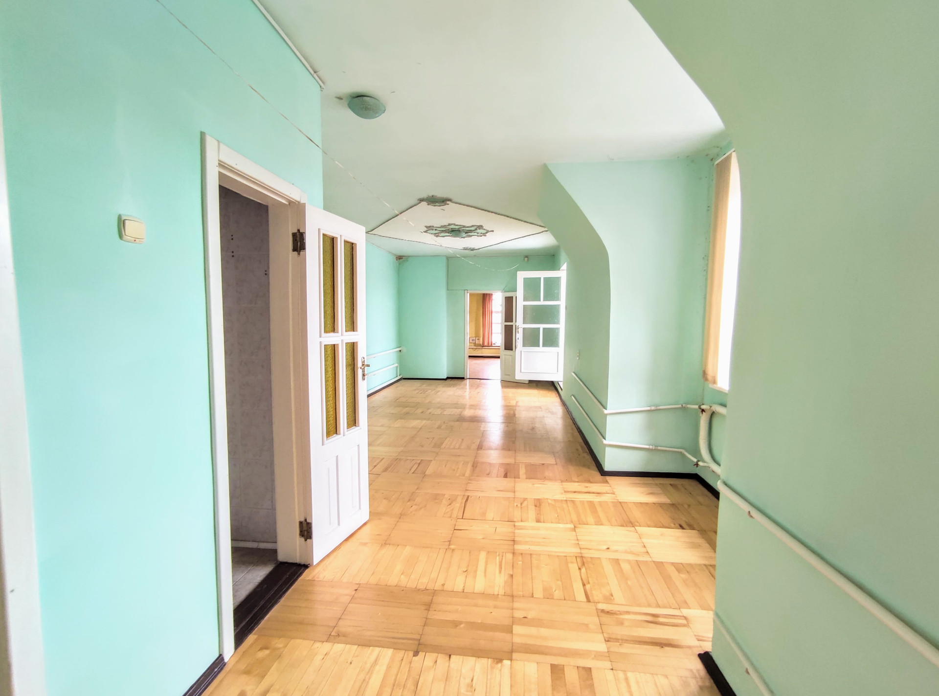 Первый этаж состоит из трех жилых комнат раздельного расположения, кухни и с/у. К комнатах и кухне стены окрашены колеров, потолки - водоэмульсионная краска, полы застелены ламинатом паркет. Раздельный с/у, ванная комната окрашена колером, уборная - облицована плиткой.