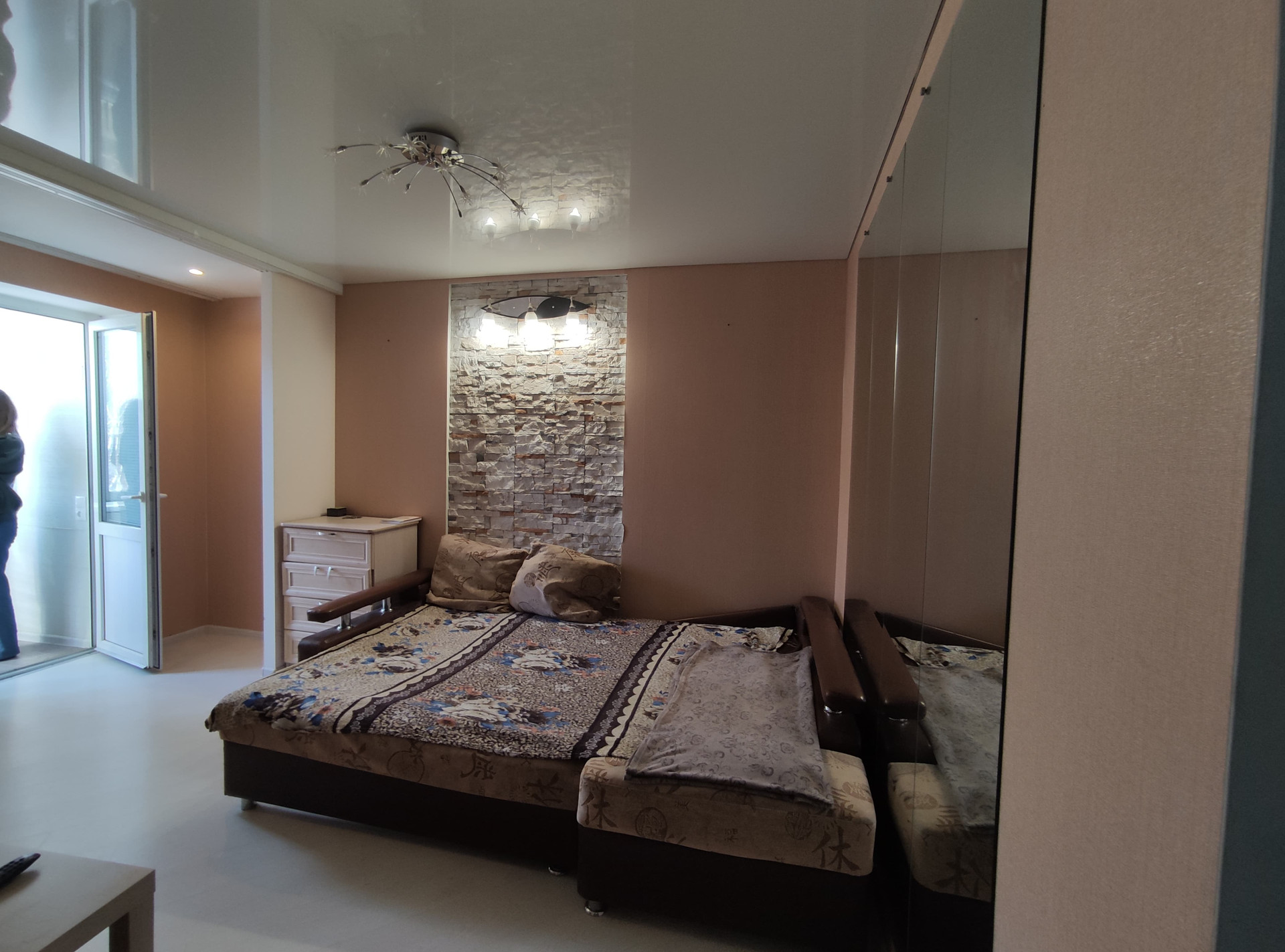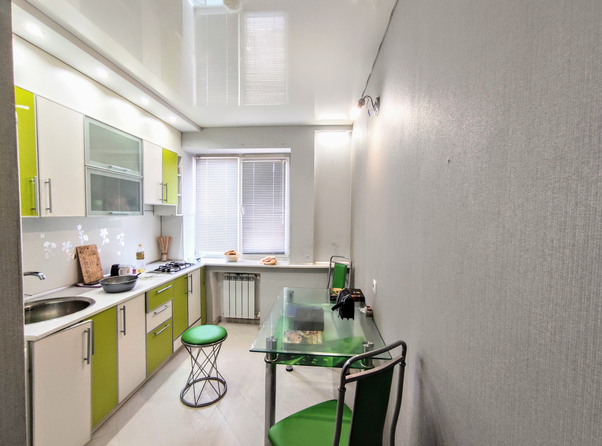 На стенах обои нейтрального цвета, натяжной потолок со встроенным точечным освещением, пол застелен ламинатом. Есть просторная гардеробная комната. Застекленный балкон, имеет выход из комнаты. На кухне, стены оклеены обоями, рабочая зона обшита “фальш-панелью”, натяжной потолок, пол застелен ламинатом. С/у раздельный, облицован плиткой. Установлены металлопластиковые окна. Счетчики на коммуникации. Сплит-система. Входная дверь - металлическая.