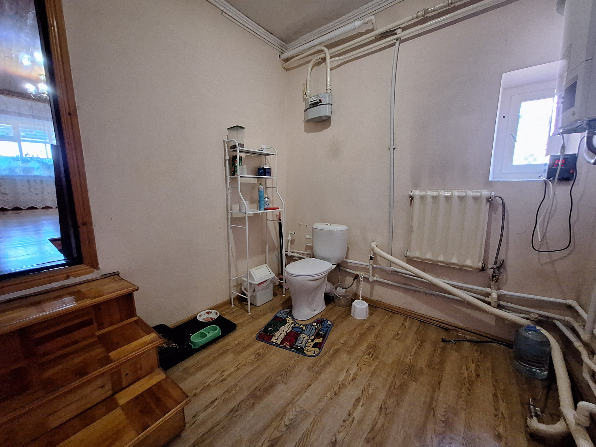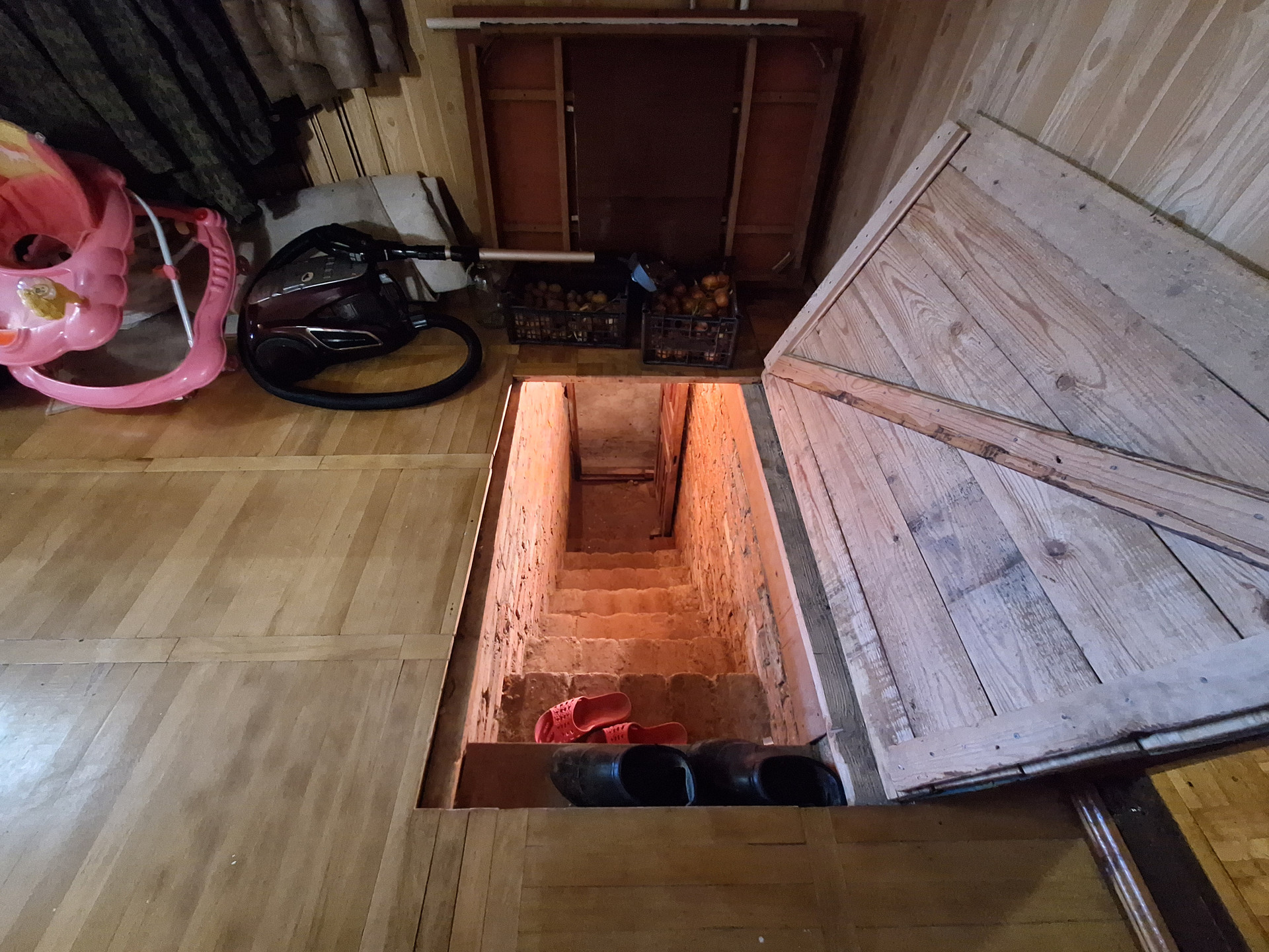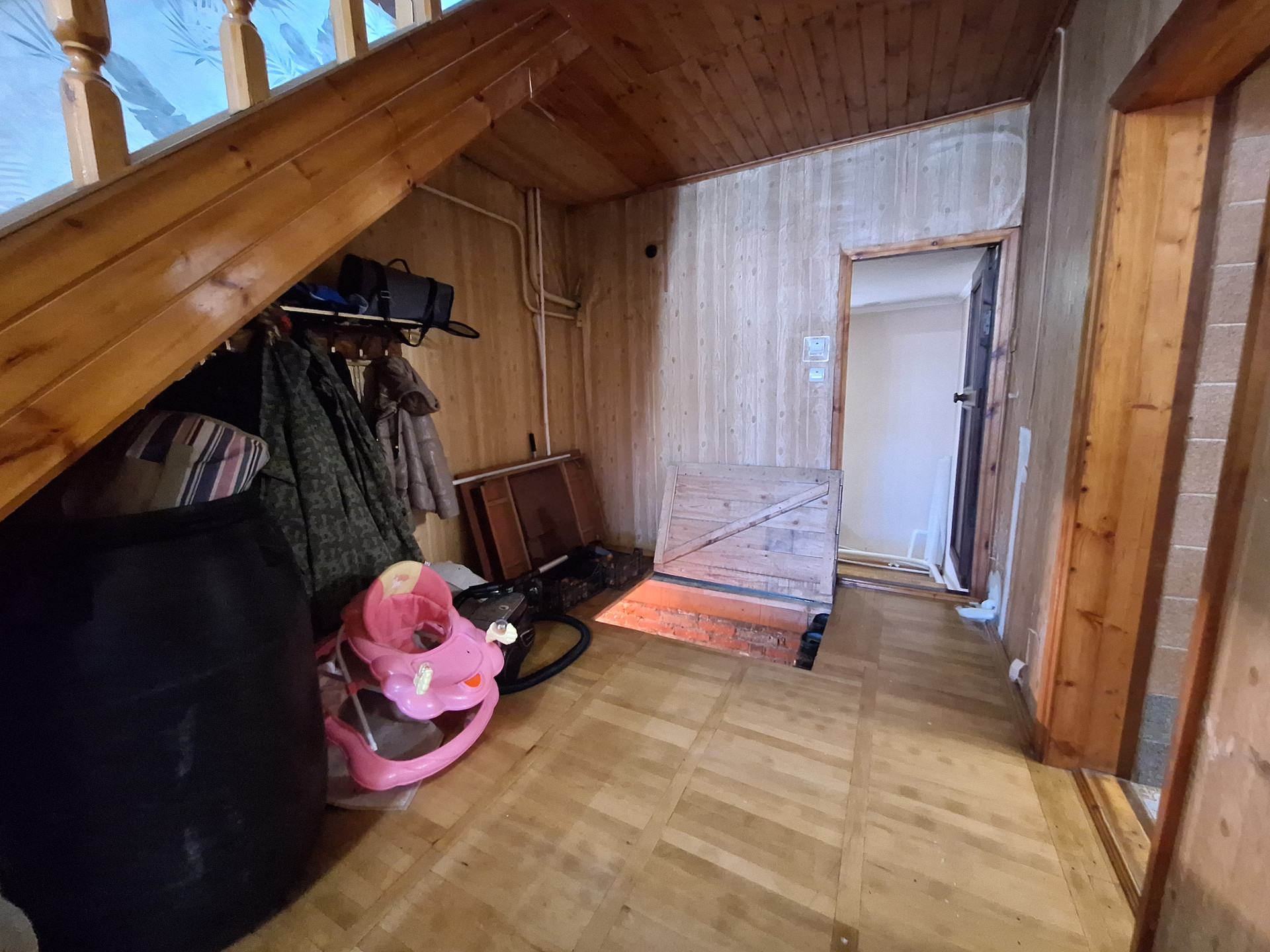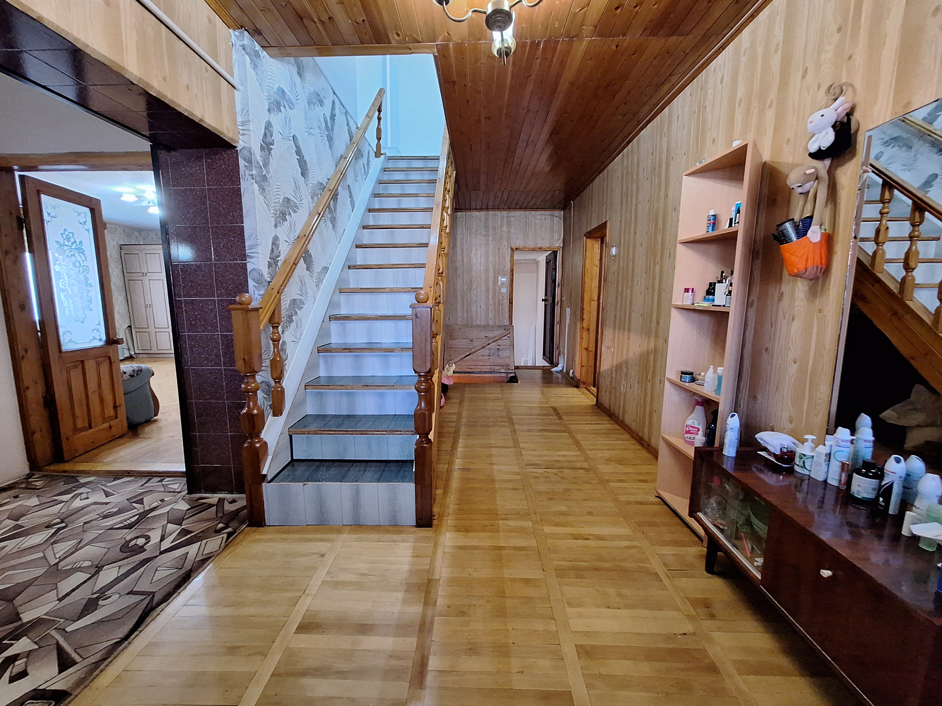 На первом: Просторная комната-28.6 кв.м, кухня-17.9 кв.м., раздельный санузел, коридор, подвал для хранения заготовок с освещением-47.3 кв.м., ., есть выход в гараж(С ЯМОЙ)-16.5 кв.м. Лестница из дерева , поверх ламинат, выведены провода подсветки . Окна частично пластиковые и деревянные.