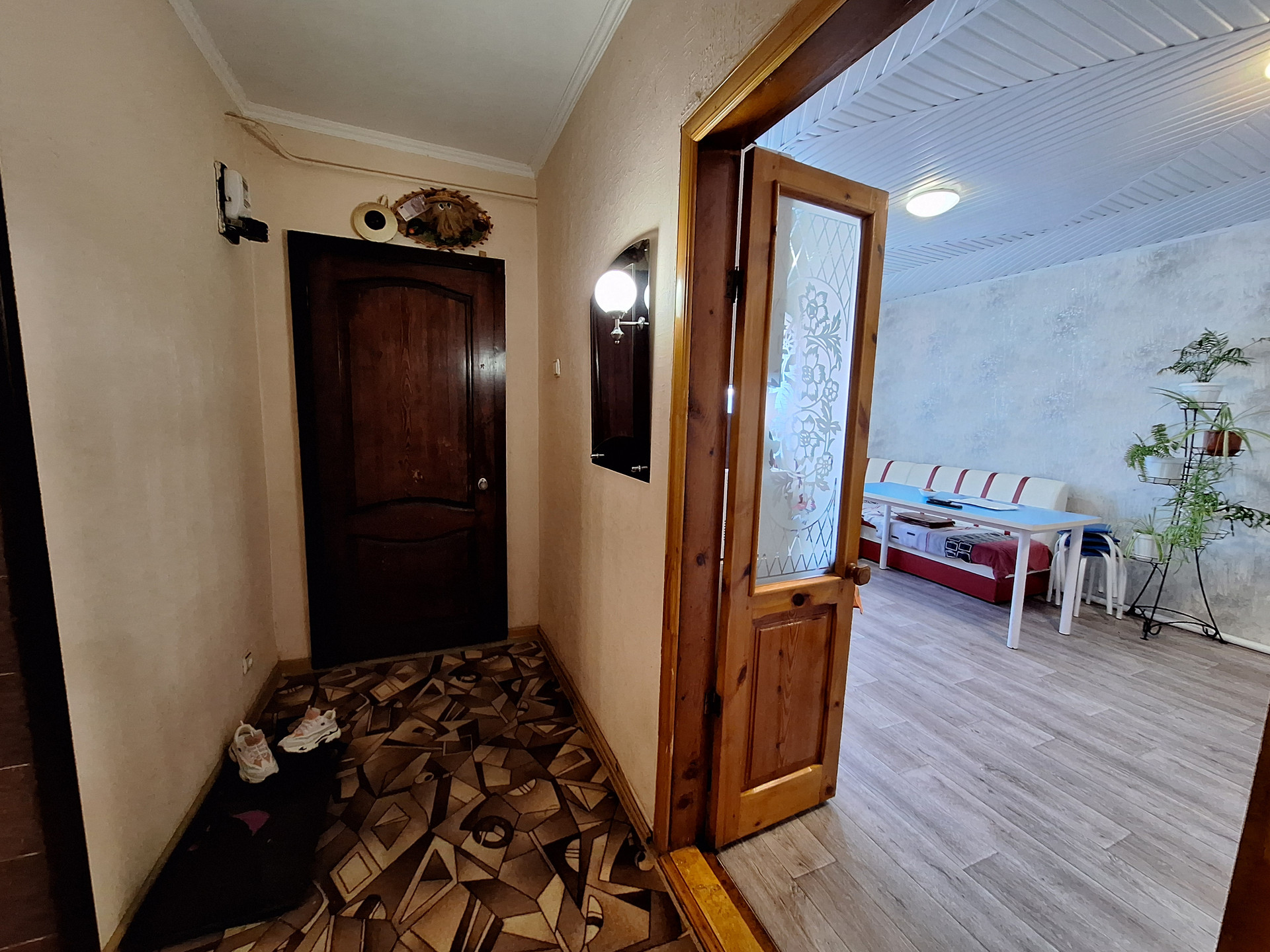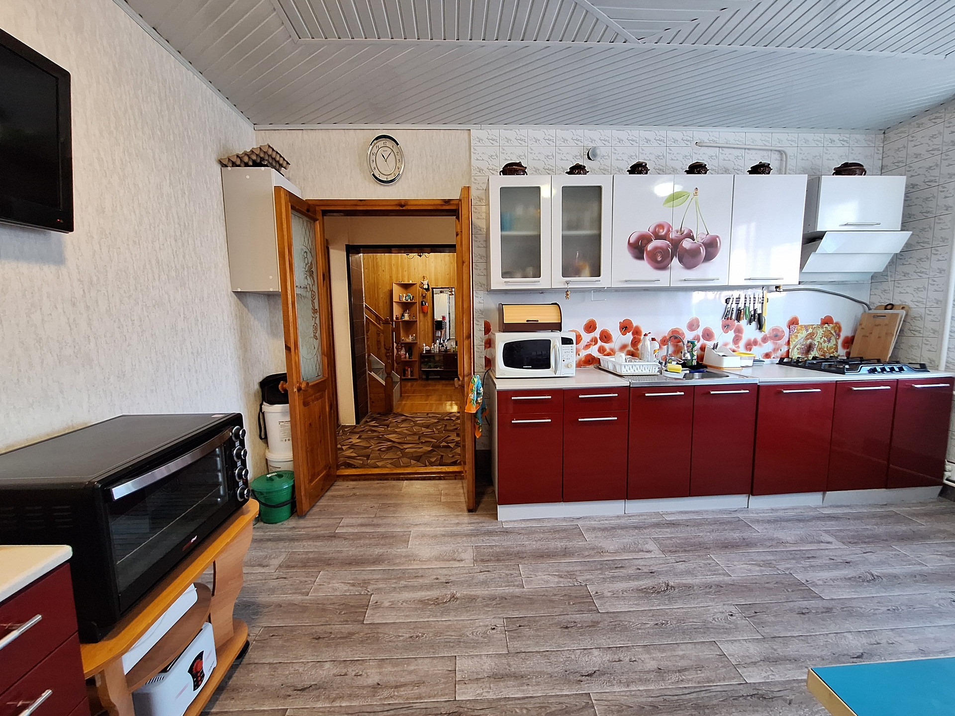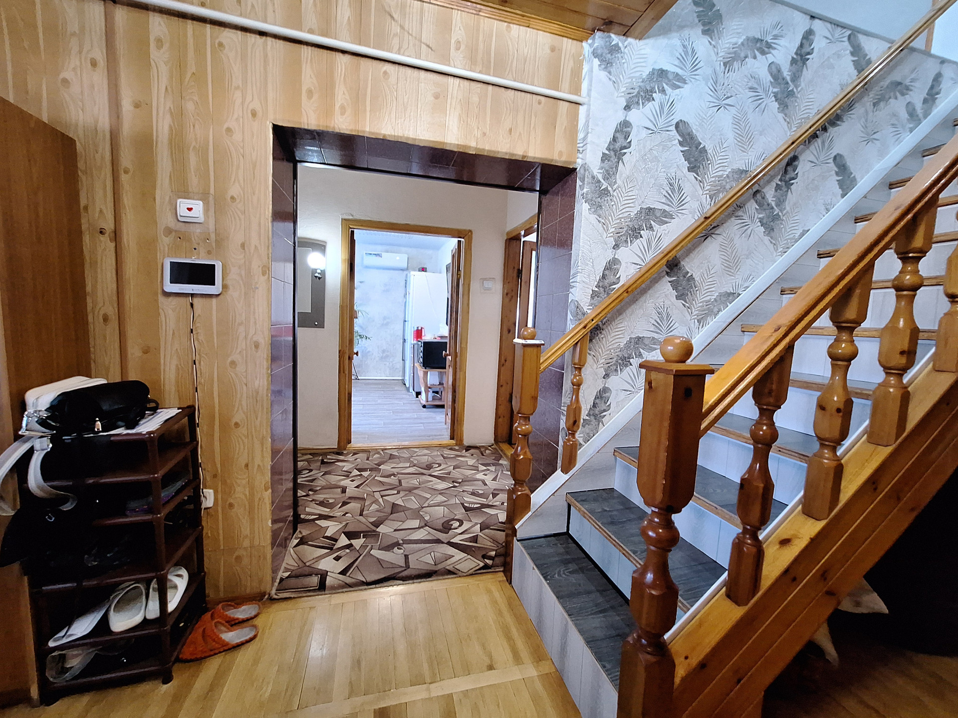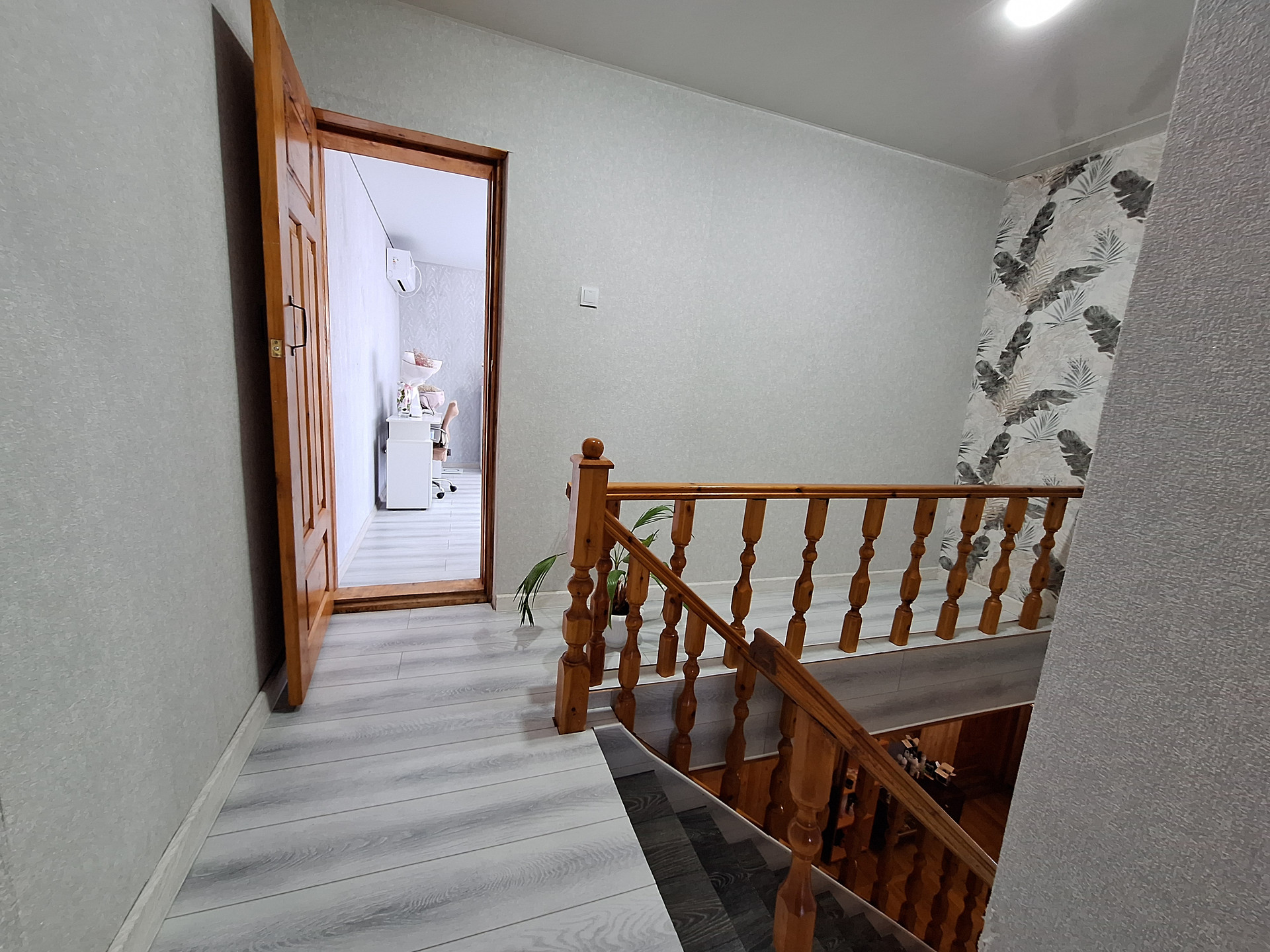На первом: Просторная комната-28.6 кв.м, кухня-17.9 кв.м., раздельный санузел, коридор, подвал для хранения заготовок с освещением-47.3 кв.м., ., есть выход в гараж(С ЯМОЙ)-16.5 кв.м. Лестница из дерева , поверх ламинат, выведены провода подсветки . Окна частично пластиковые и деревянные.