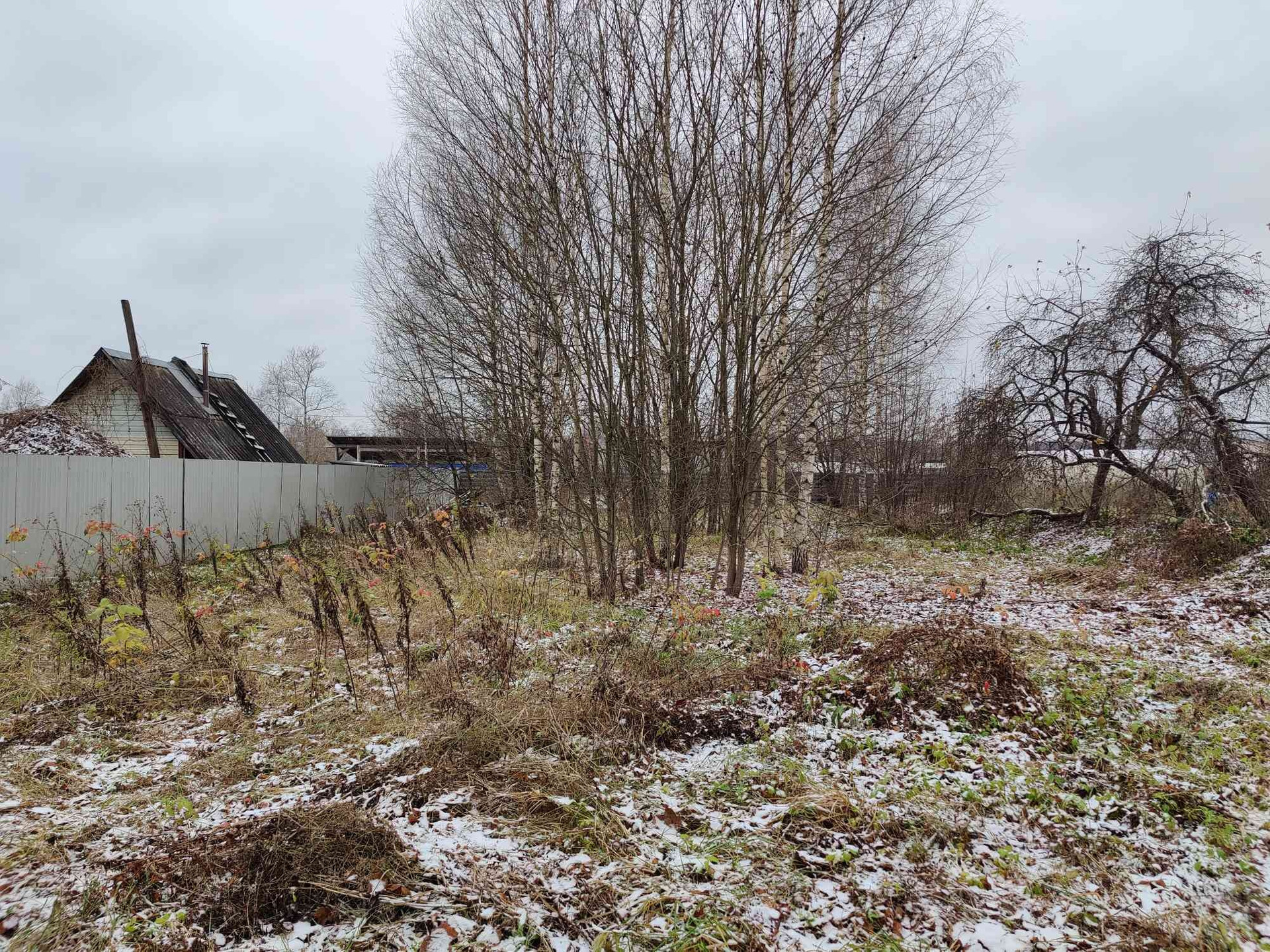 Растут как плодовые деревья, так и обычные (березы, липы). В целом, деревьев много, они как раз создают приватность, закрывают от соседних домов.