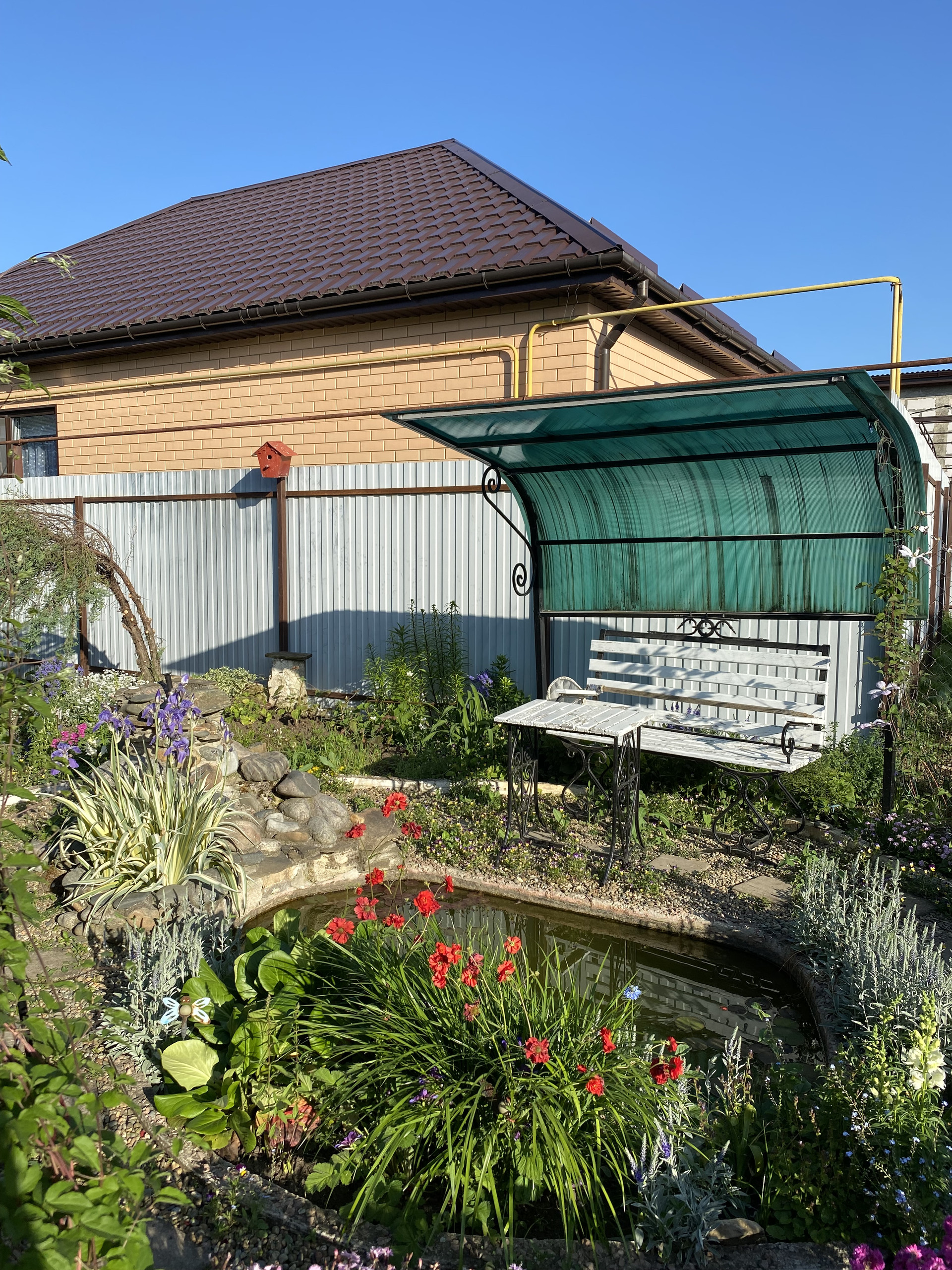 В огороде: пруд с фонтанчиком, лавочкой и небольшим навесом, теплица, посажены фруктовые деревья, кустарники и декоративные растения.
