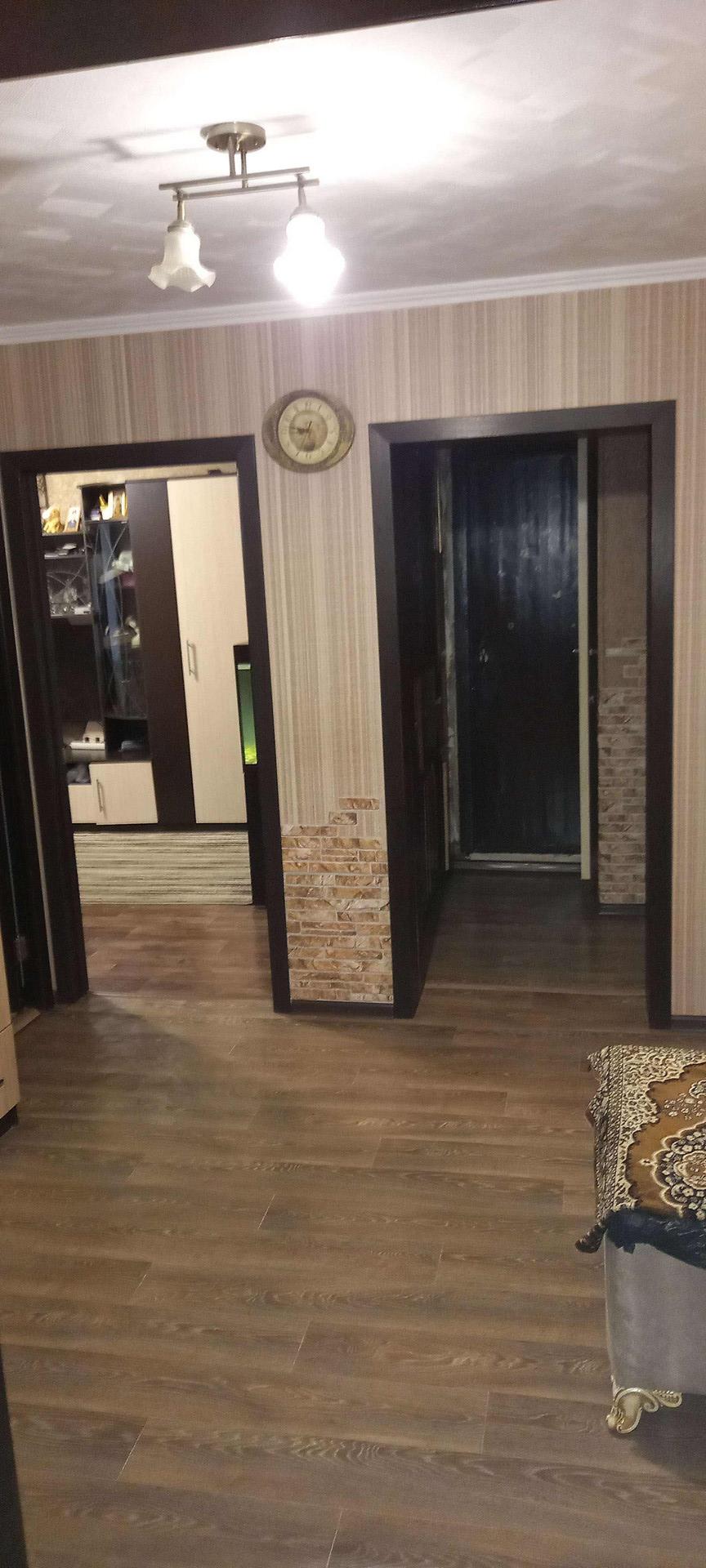 Продаётся уютная трех комнатная квартира,заходи и живи,просторная кухня совмещенная с балконом,две большие комнаты и третья поменьше,из маленькой комнаты выход на лоджию,пластиковые окна кроме лоджии,там застекленная деревянная рама,квартира очень тёплая  и просторная,в шаговой доступности,школа,детский сад,стадион,детские площадки,спортивные площадки,рынок,пятёрочка,магнит и много других магазинов,остановки городского транспорта,жд.станция,микрорайон очень хороший.В квартире два собственника.