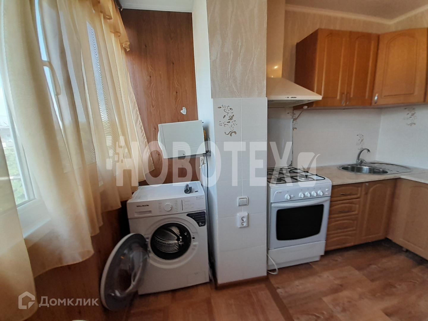 Имеется стиральная машина, холодильник, сплит-система, кухонный гарнитур, микроволновая печь, кровать, шкаф.