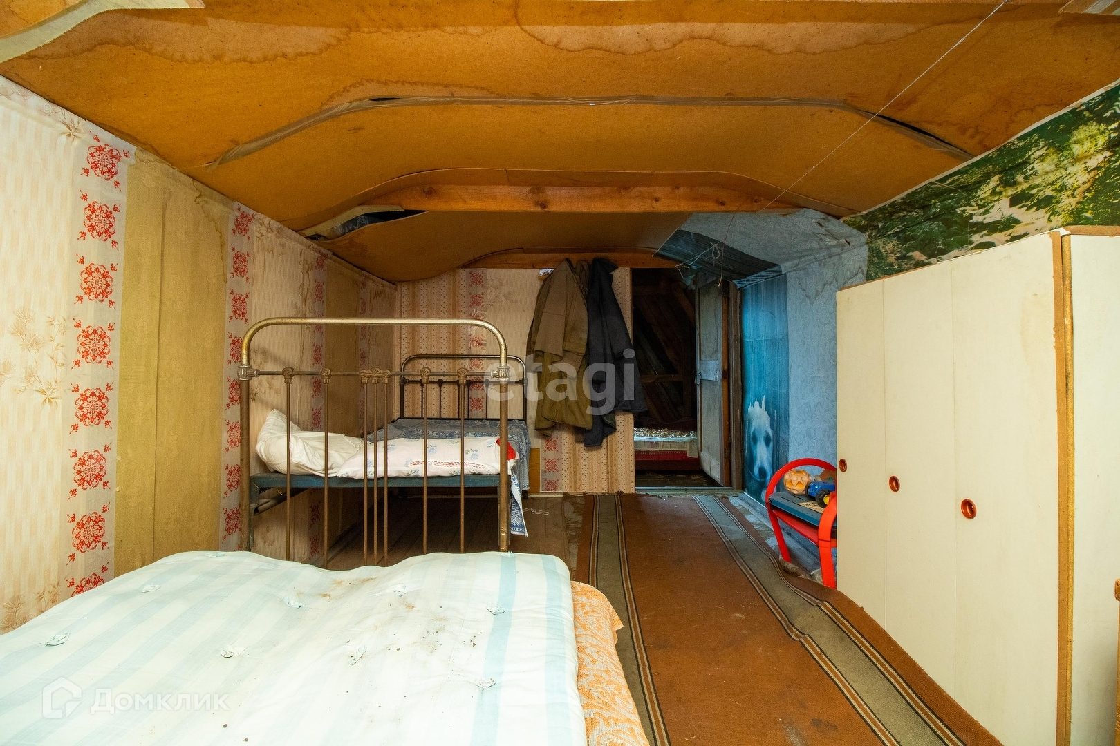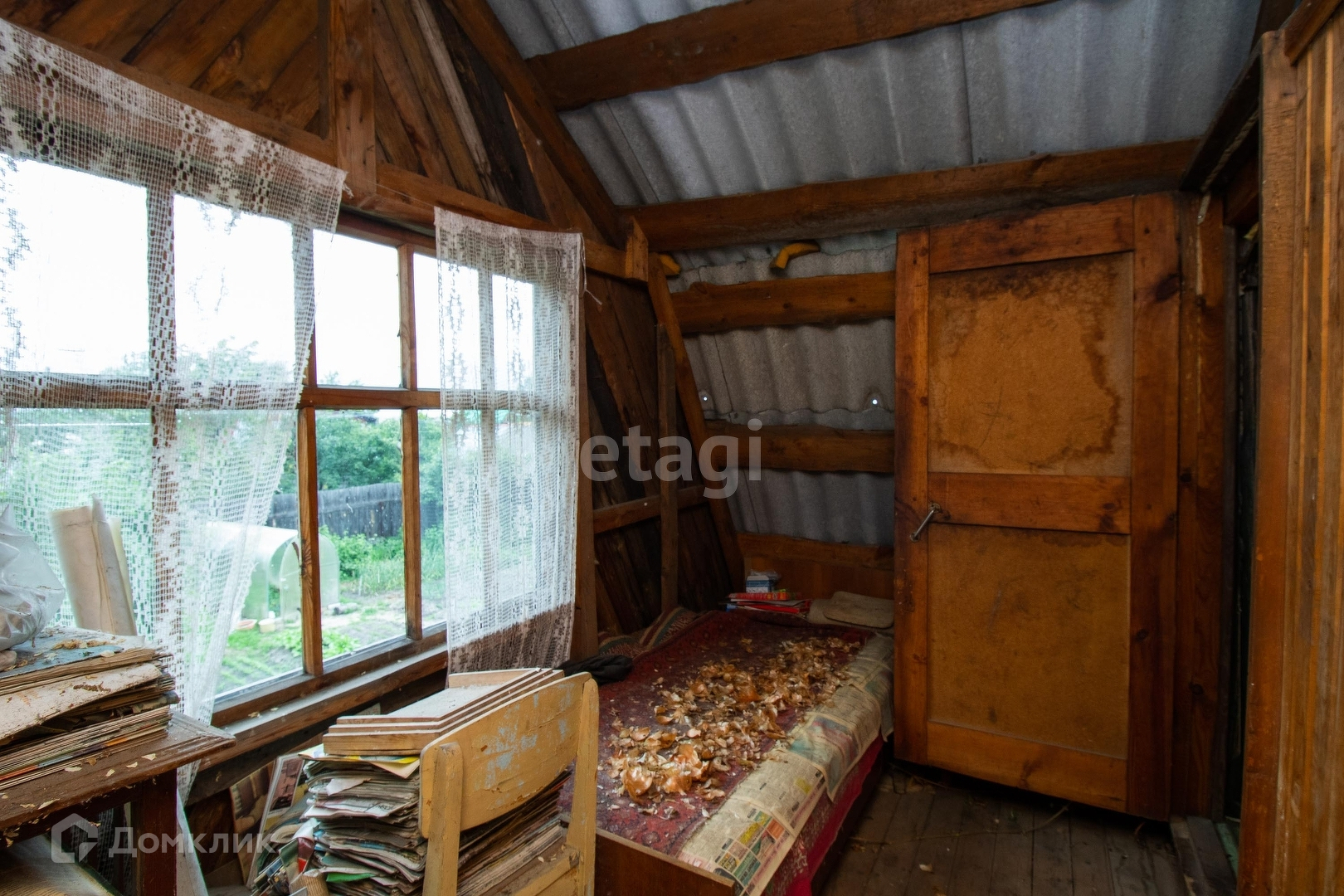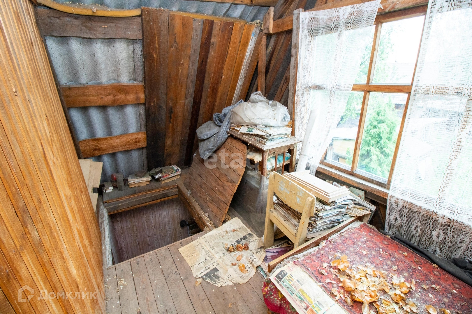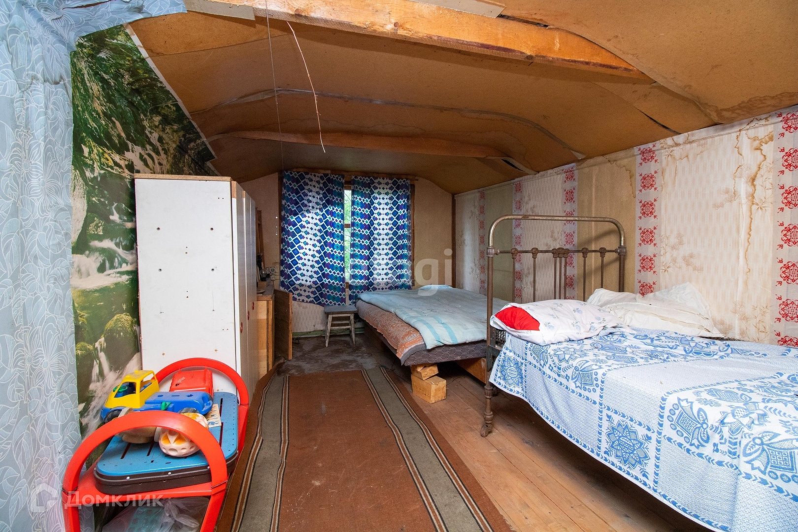 Дом из бревна, на мансарде оборудована спальная комната.
