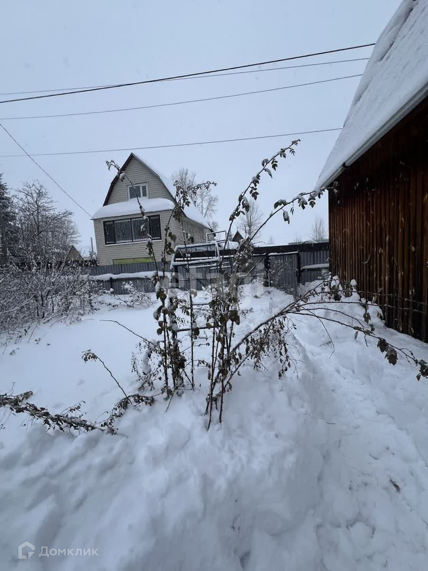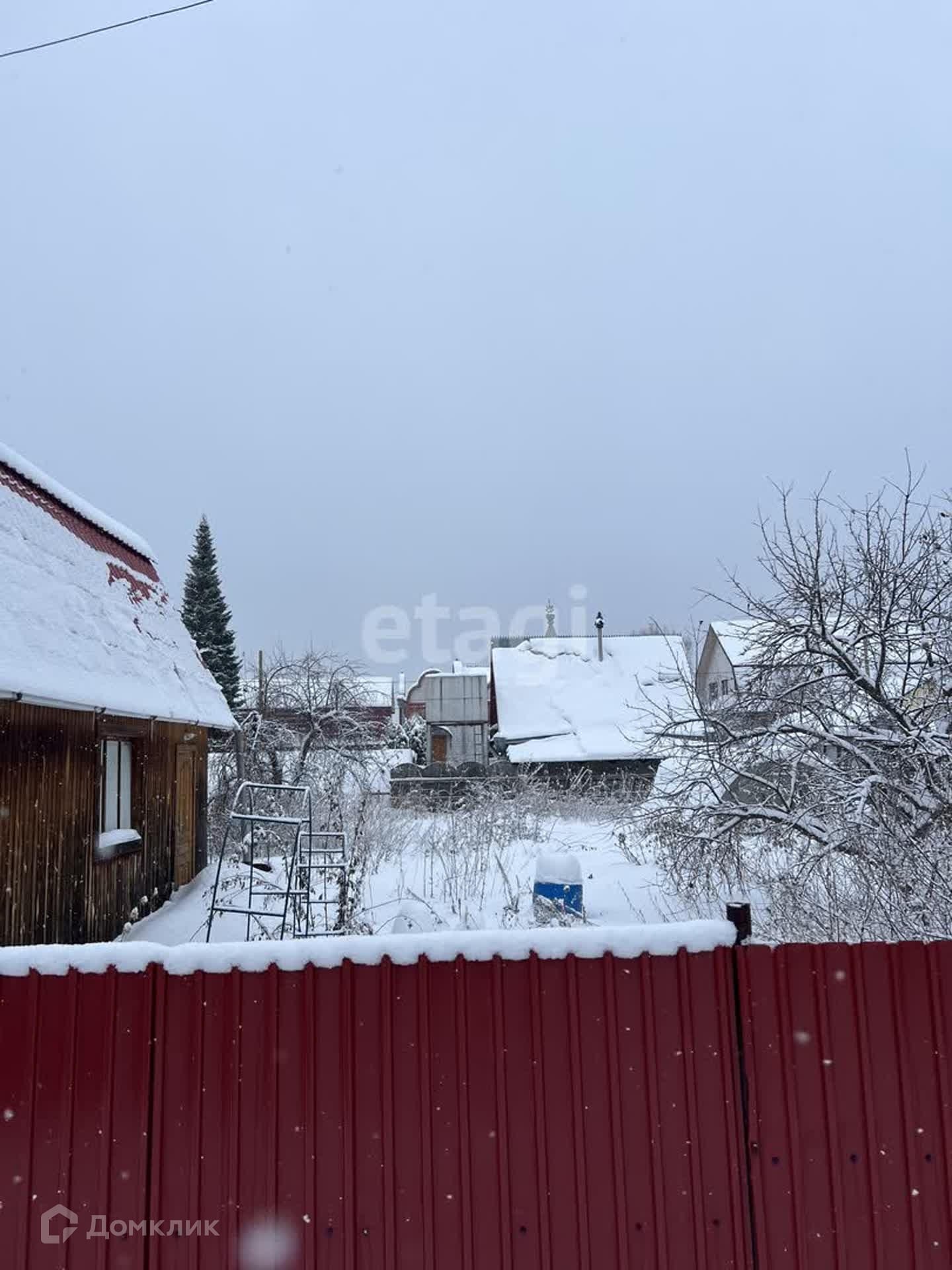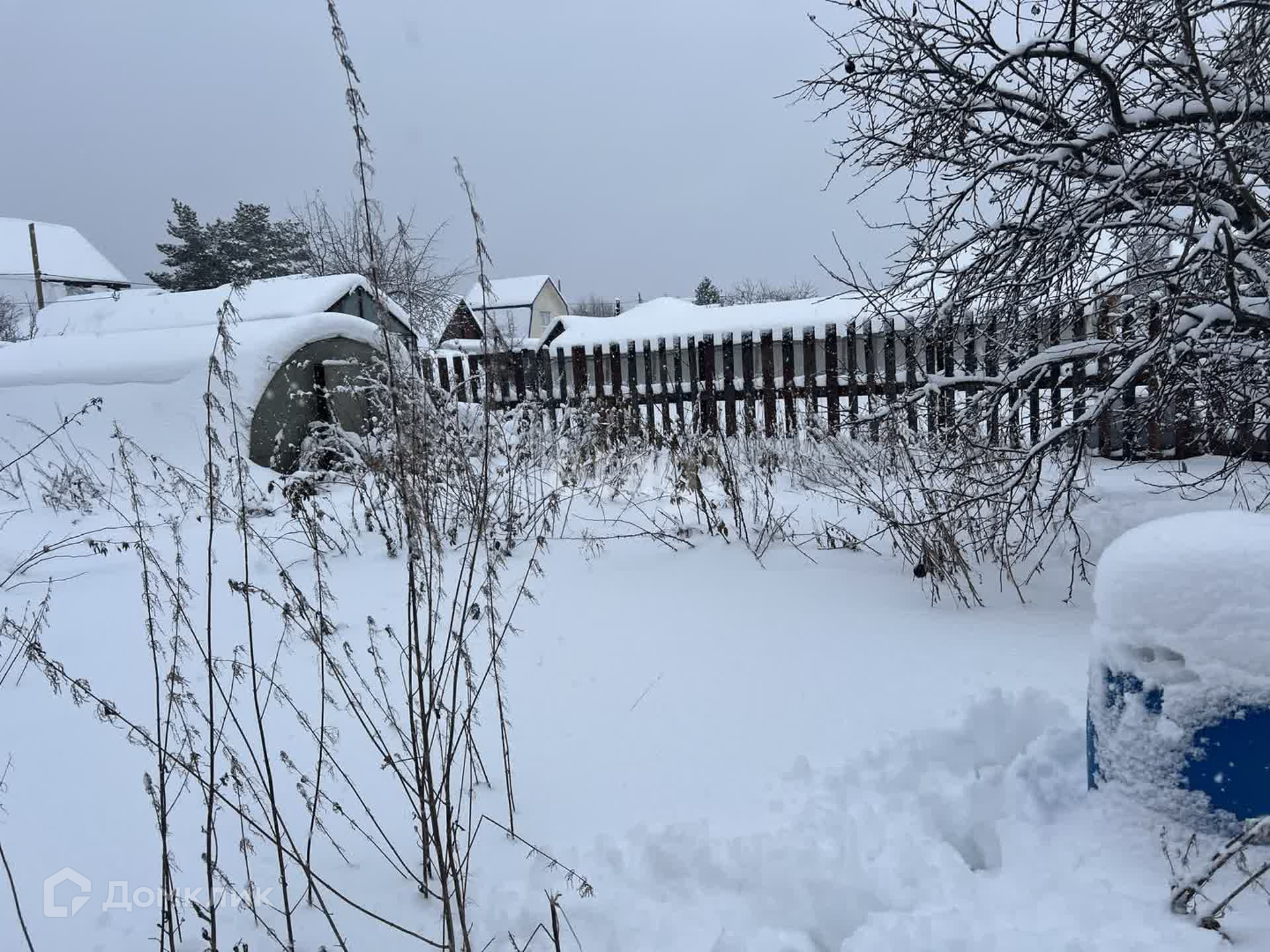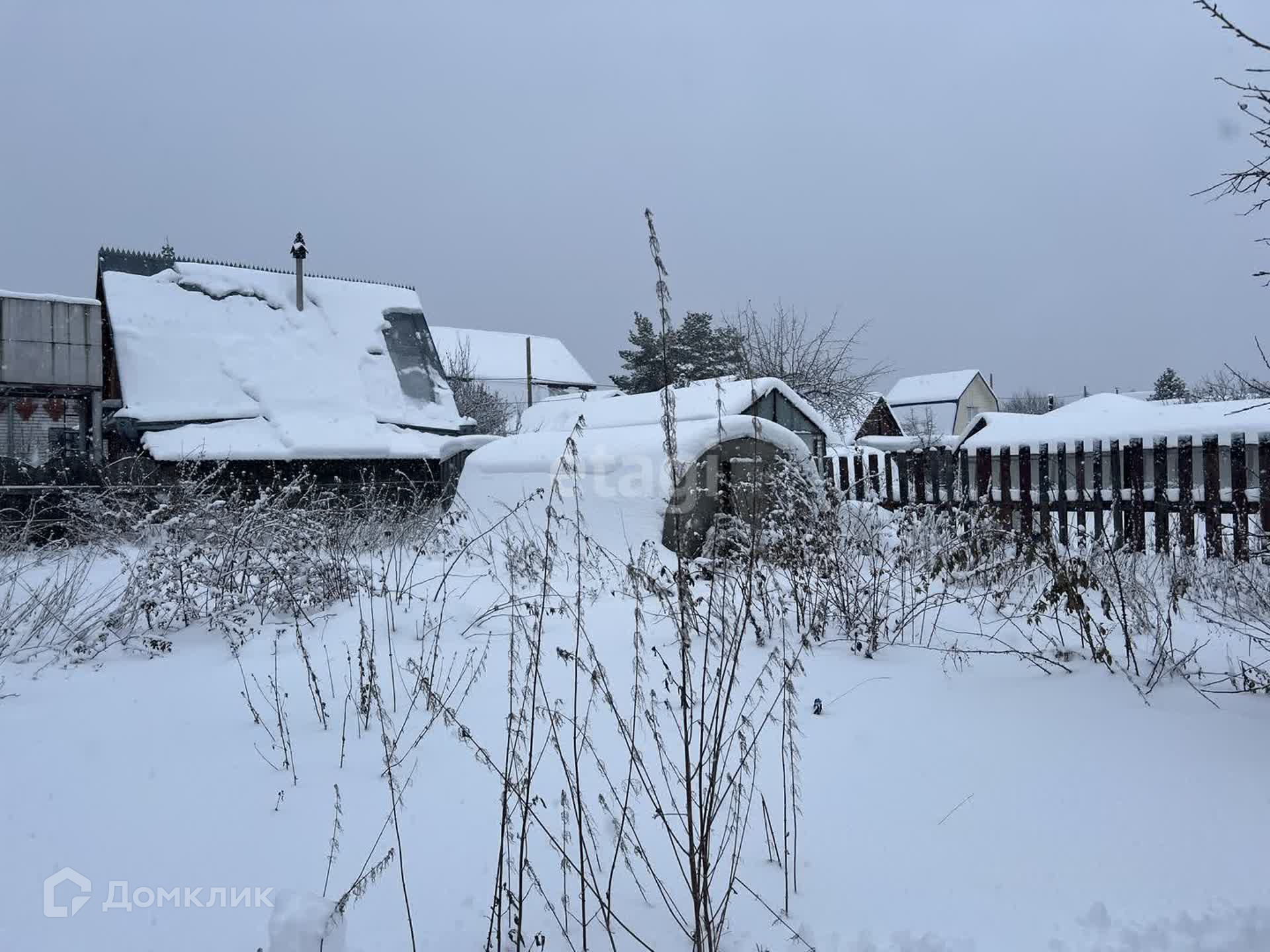 Участок 5.5 сот, огорожен забором из профнастила. Есть насаждения: малина, яблони, вишня. Помимо дома на участке есть теплица, подсобные помещения.