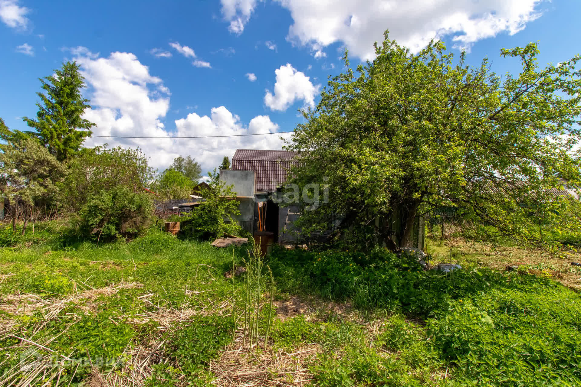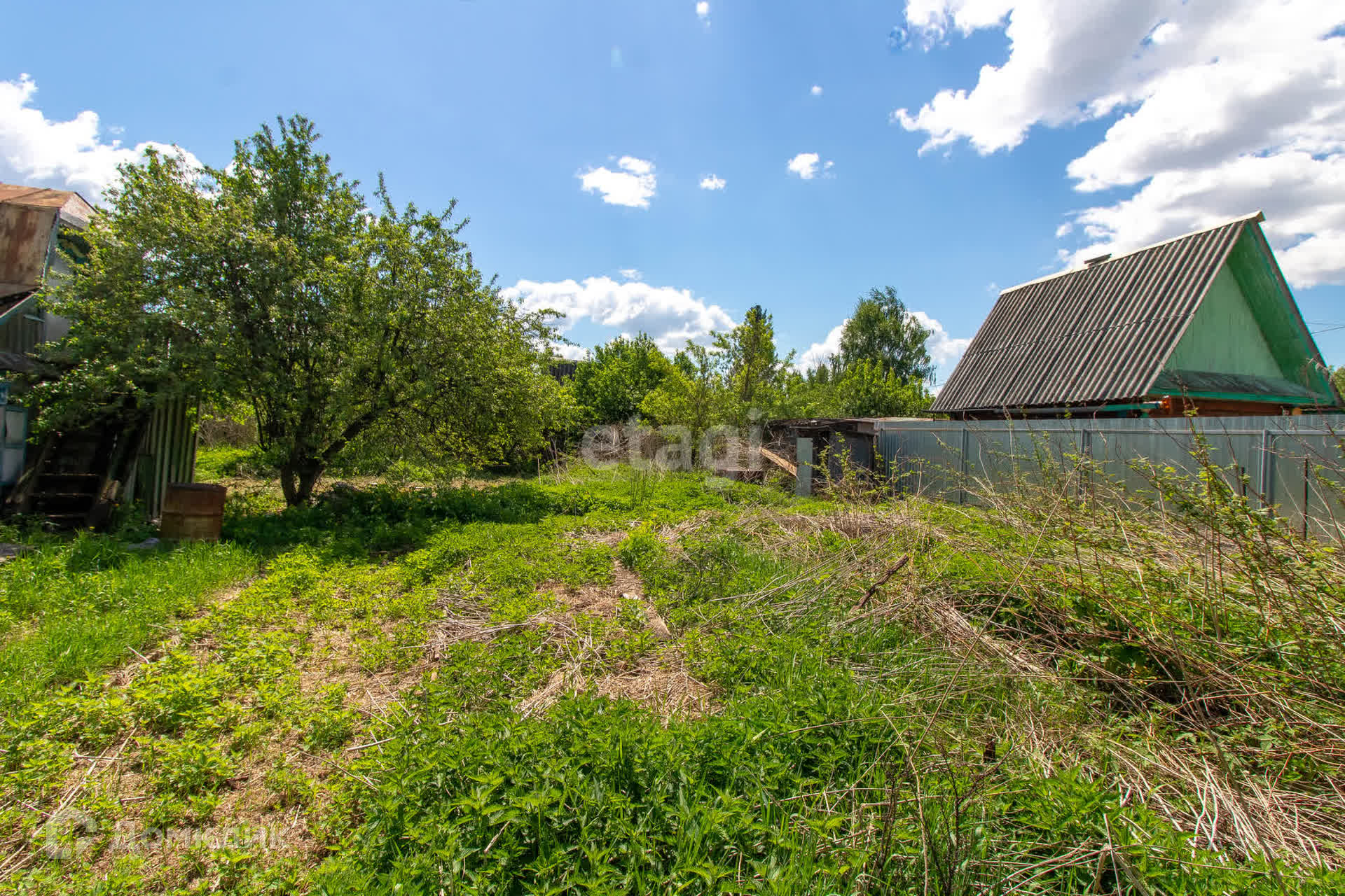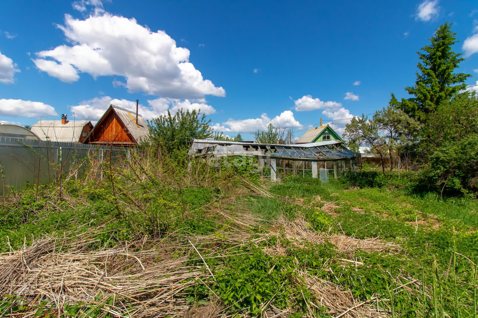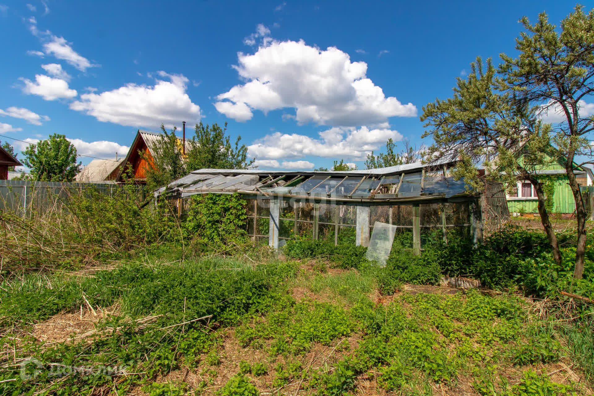 - На участке растут яблони, вишня, облепиха; есть старая теплица