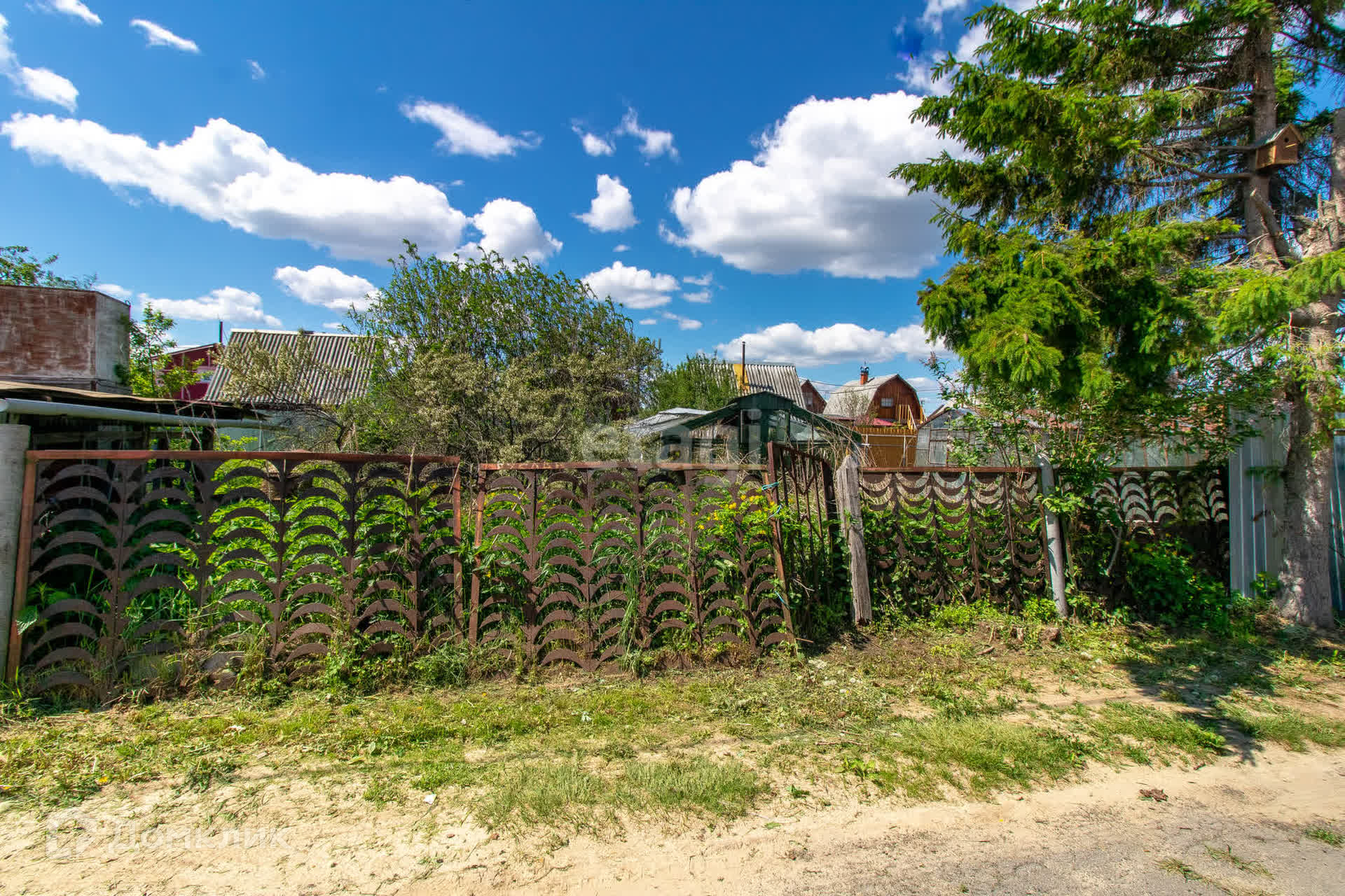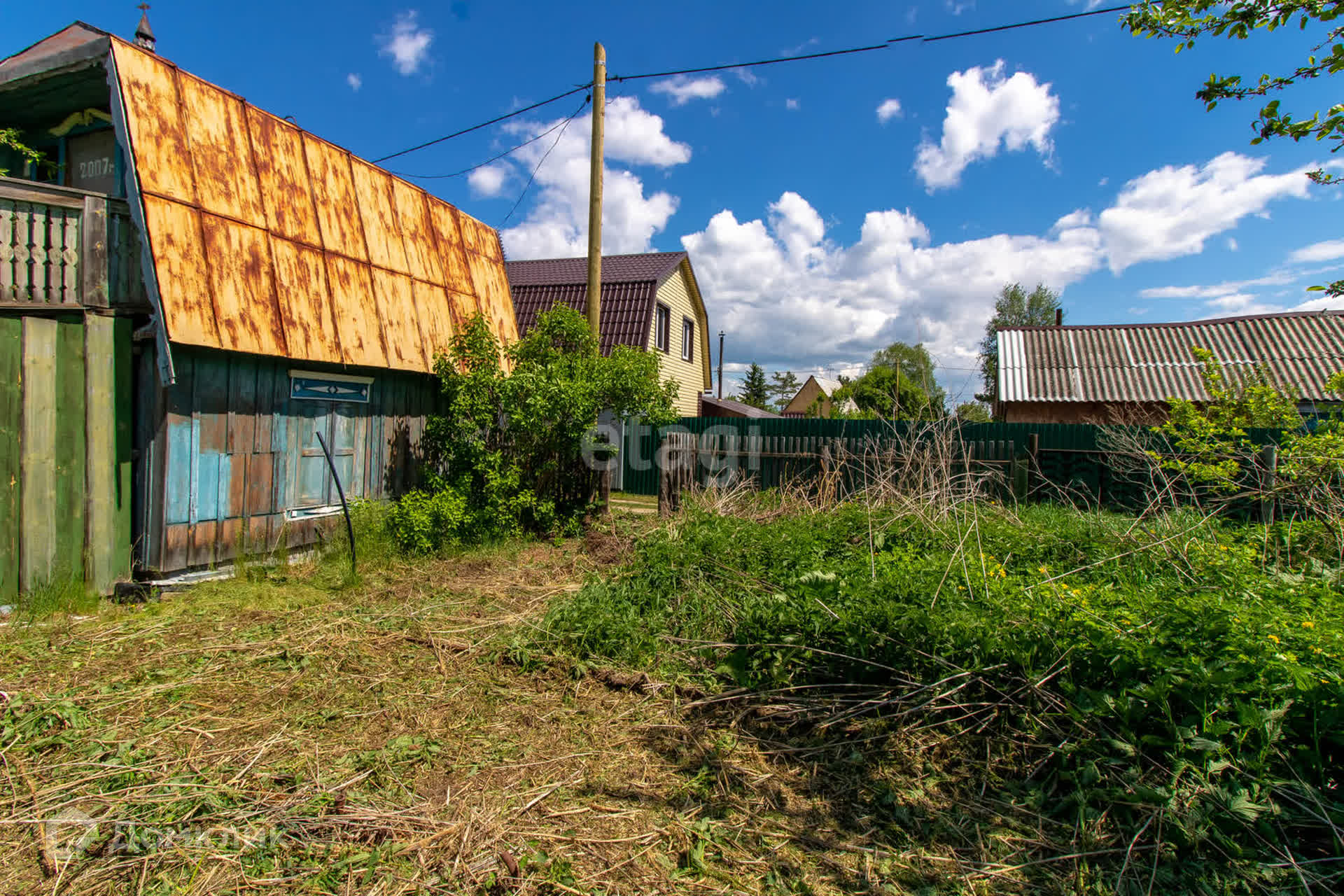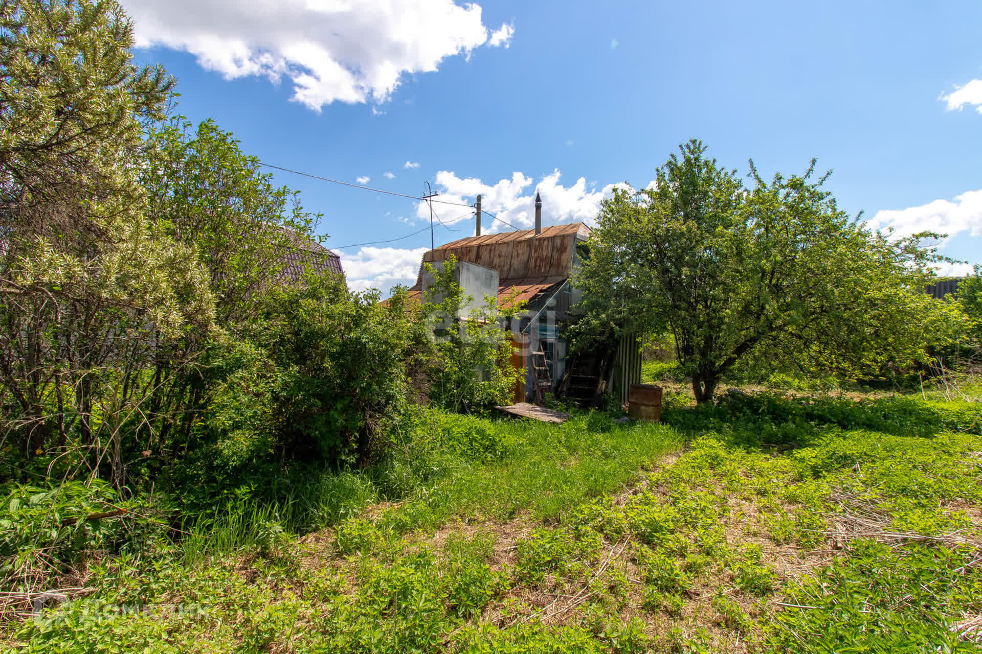 - На участке растут яблони, вишня, облепиха; есть старая теплица