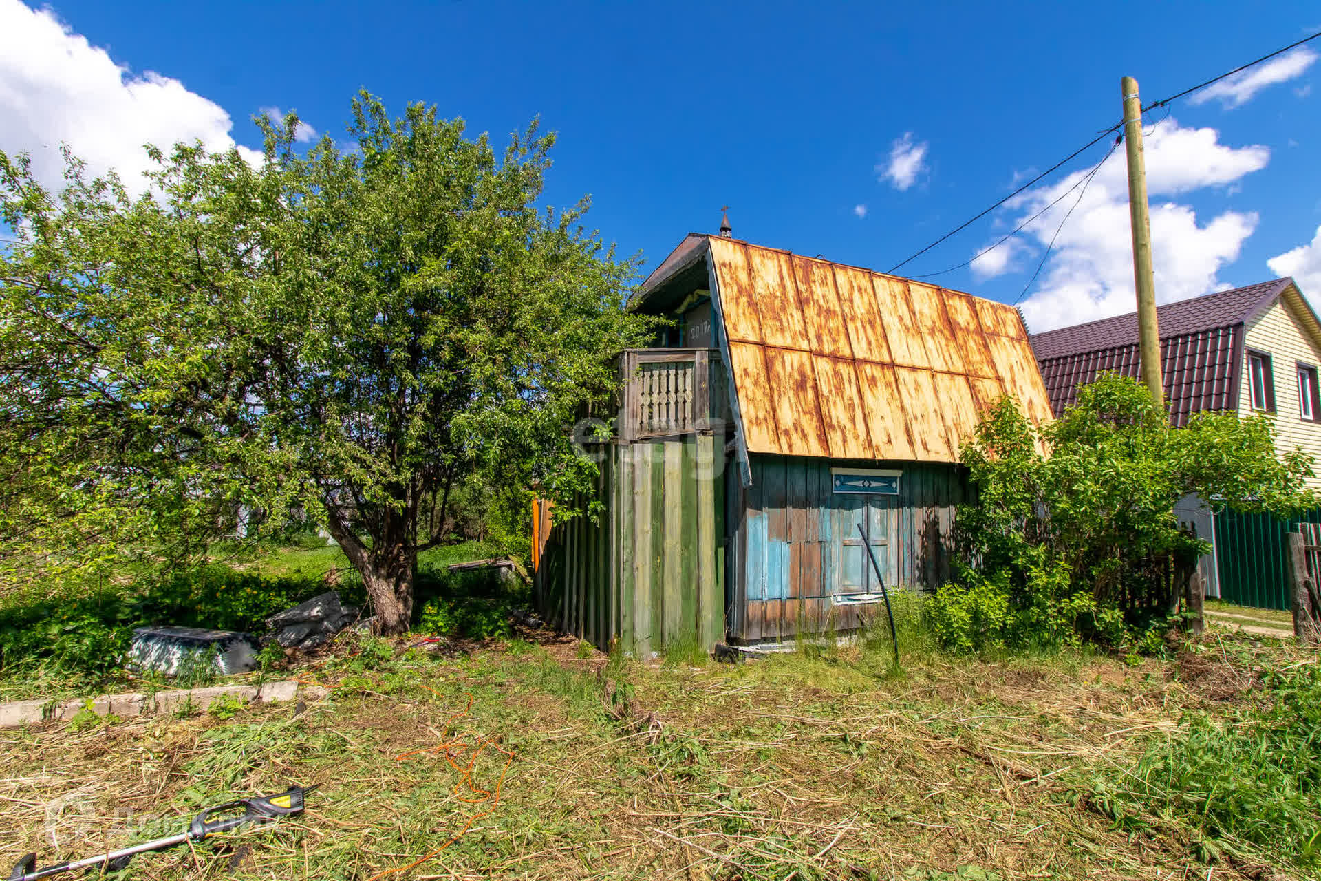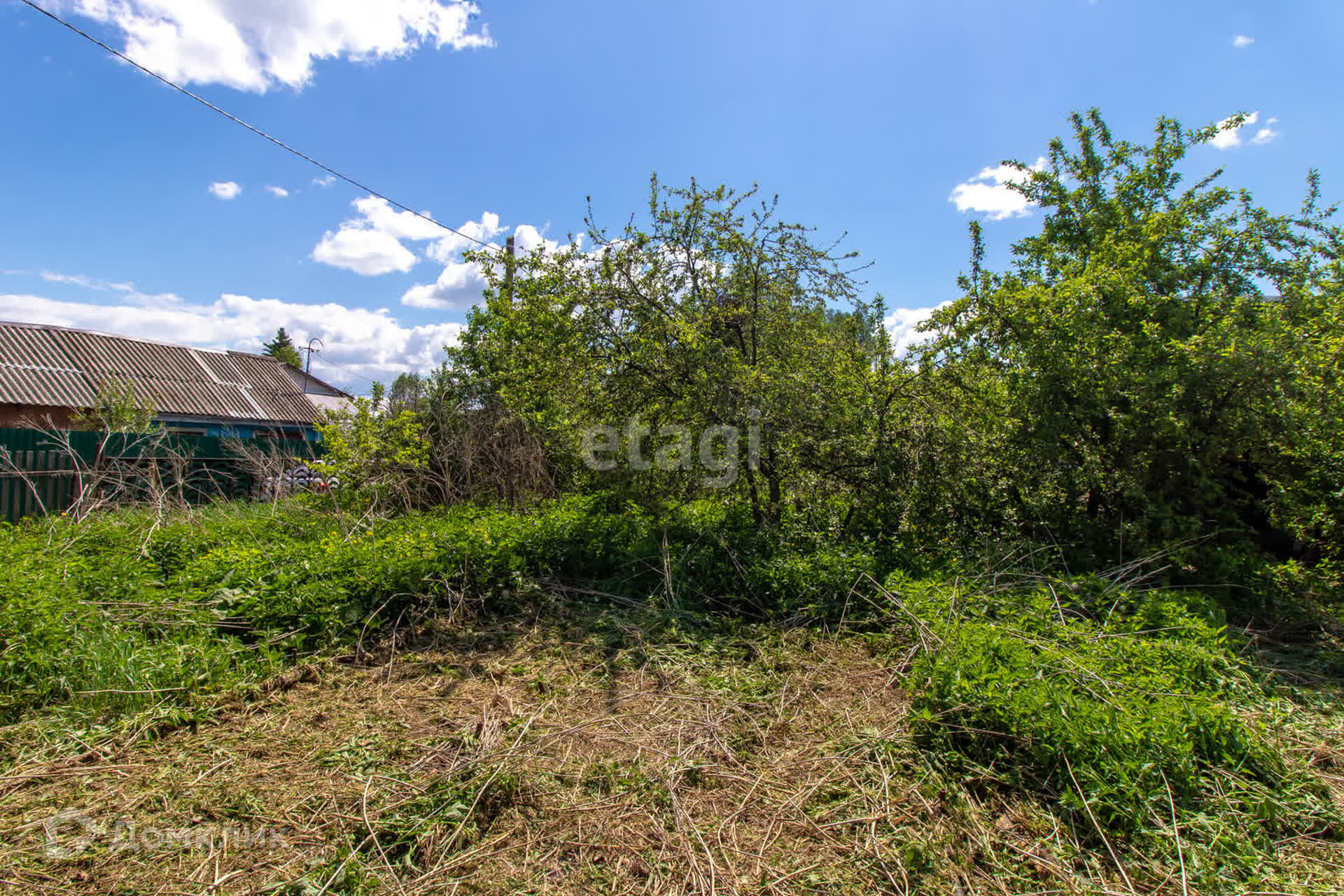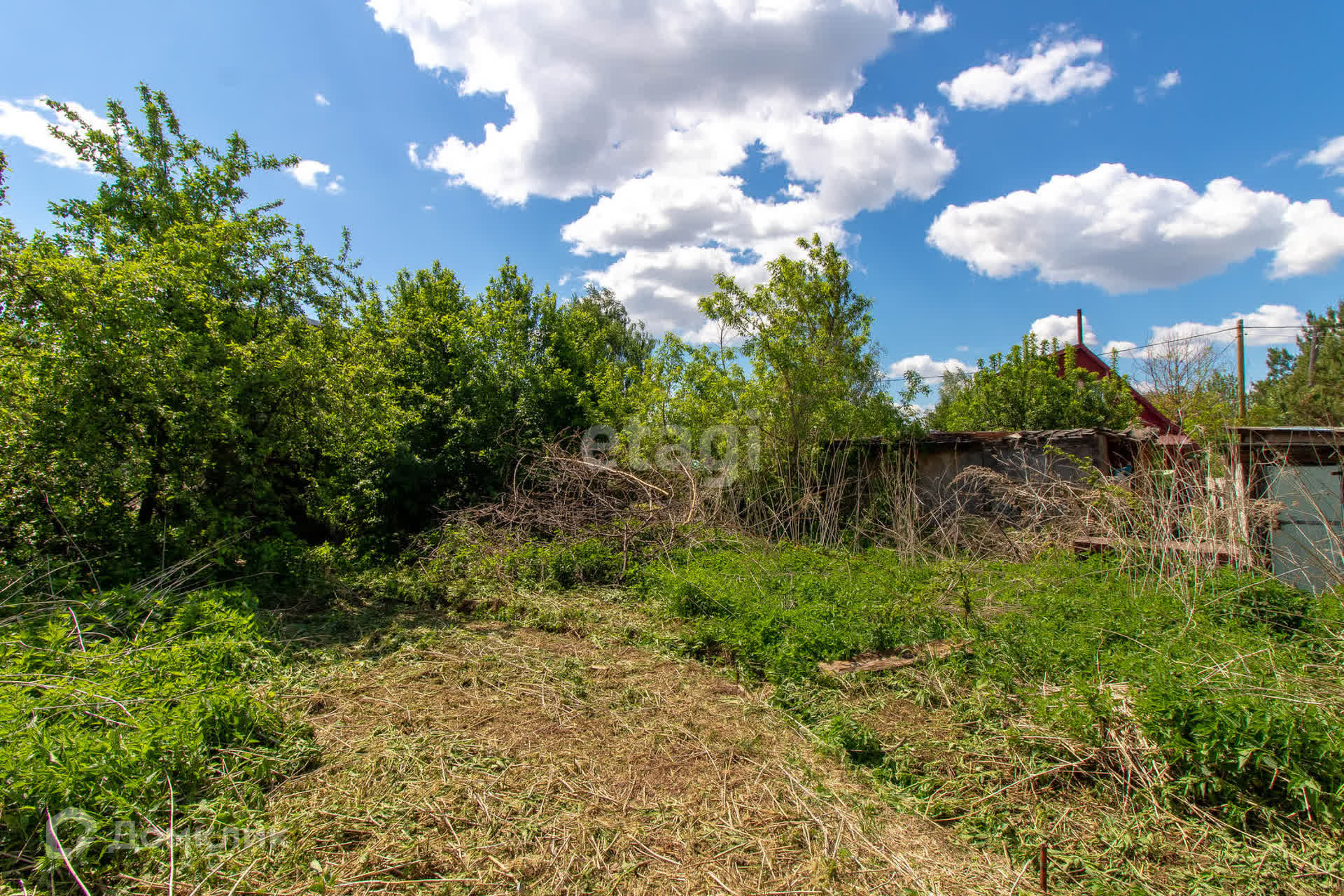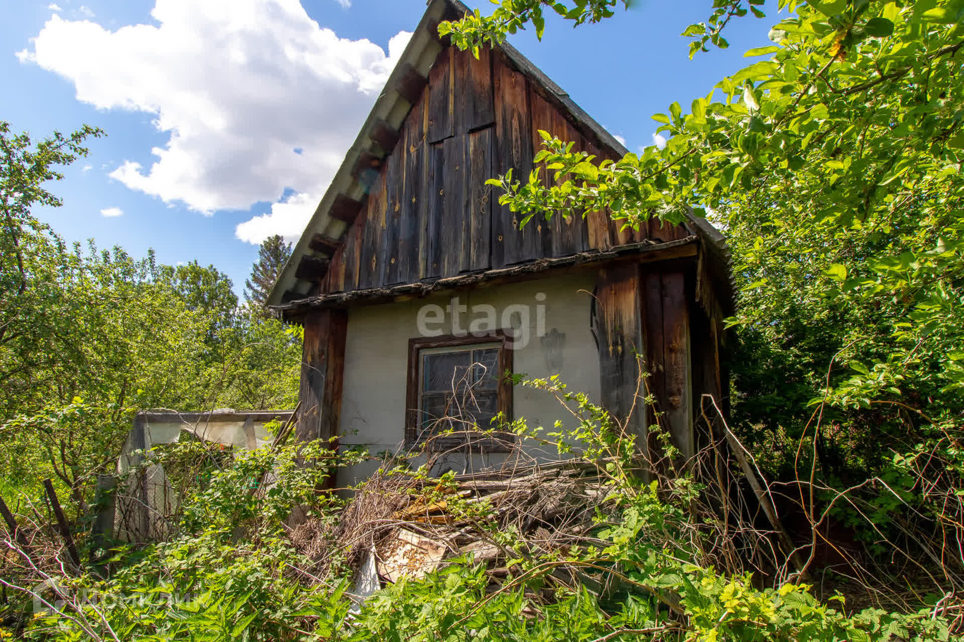 - На участке растут яблони, вишня, облепиха; есть старая теплица
