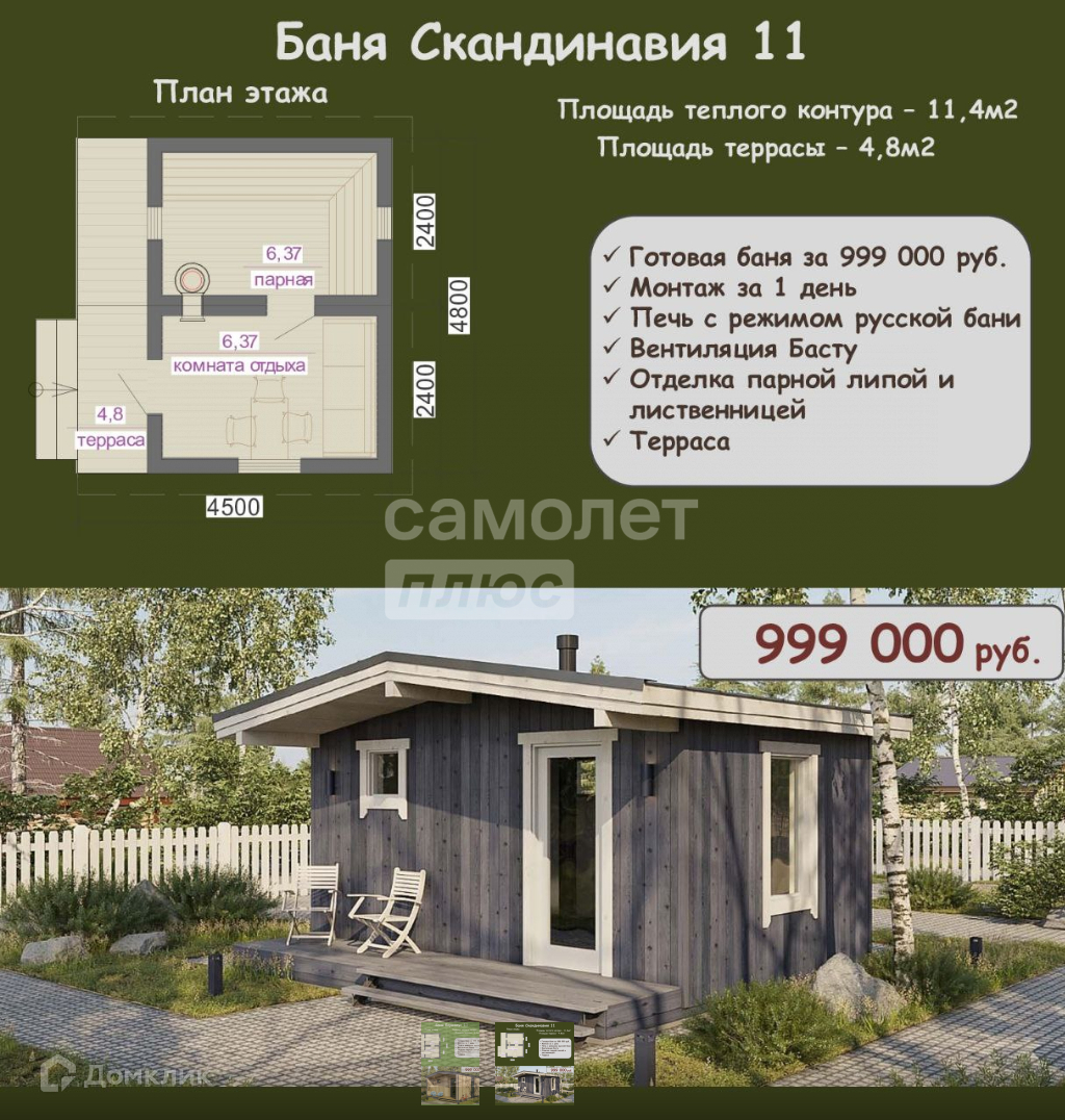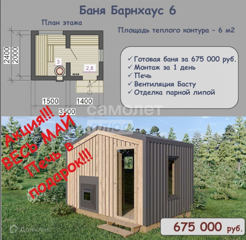 Арт. 67824335 Изготовим и установим в кратчайшие сроки!!!Комплектация:Каркас из сухой строганной сосновой доски камерной сушки, 95*45мм, 145*45ммУтепление базальтовым утеплителем Knauf с перекрестным утеплением: стена 100 мм, пол и кровля 150 ммПарнаяПланкен в парной из лиственницыСъемные трапики в конструкции пола.Вагонка из липы сделана через зазор с «каблучком» для исключения запревания дереваГидроизоляция в парнойПолки из липы, верхний шириной 80 см, нижний выдвижной 50 смВентиляция Басту+ шибер под печь для притока свежего воздуха с улицыПодсветка полковПечь с внутренней каменкой для режима русской баниВнутренняя каменка из нержавейкиПечь установлена на лист минеритаПотолок обшит вагонкой из кедра, стены вагонкой из липы. Стены, потолок, полки, пол покрыты специализированными средствами для обработки стен и потолка для парныхВнутренняя отделкаКомната отдыхаСтены обшиты имитацией бруса из сосны, окрашены на производствеПол: шпунтованная доска, окрашена на производствеПотолок обшит сосновой вагонкой штиль, окрашена на производствеДвухкамерные стеклопакеты, с энергосберегающим стекломДверь в парную стеклянная матовая, на трех петляхДверь на улицу ПВХ, двойной стеклопакет, с энегосберегающим стекломВнешняя отделкаФасад обшит прямым планкеном, окрашена на производствеКровляМЕталлопрофиль МП- 20, цвет графит, доборные элементы из металлаДымоход и сендвич трубы из нержавеющей сталиЭлектрика:Электрический шкаф, с автоматами, УЗО, на группы отдельноРозеткиТочечные светильникиВыключателиФасадные светильникиСветодиодная лентаДополнительные расходыФундамент свайный, доставка и установка в пределах 50 км от п. Березняки около 80 000 рублей