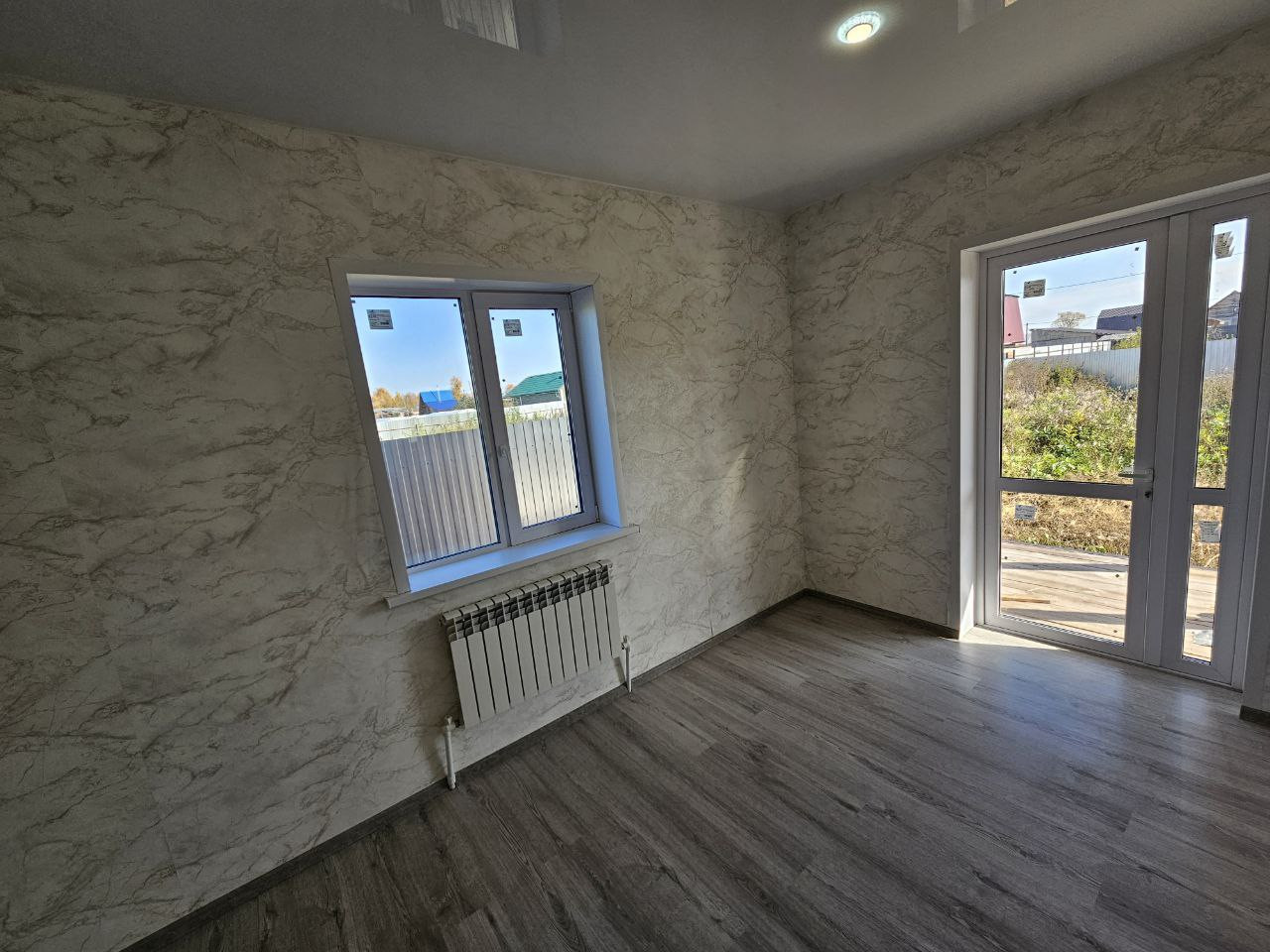 Дом теплый (сделано утепление), материал стен - керамзитблок, сайдинг, свежий ремонт (установлена сантехника, пластиковые окна, толстая входная дверь). Все коммуникации заведены в дом. Отсыпки участок не требует.