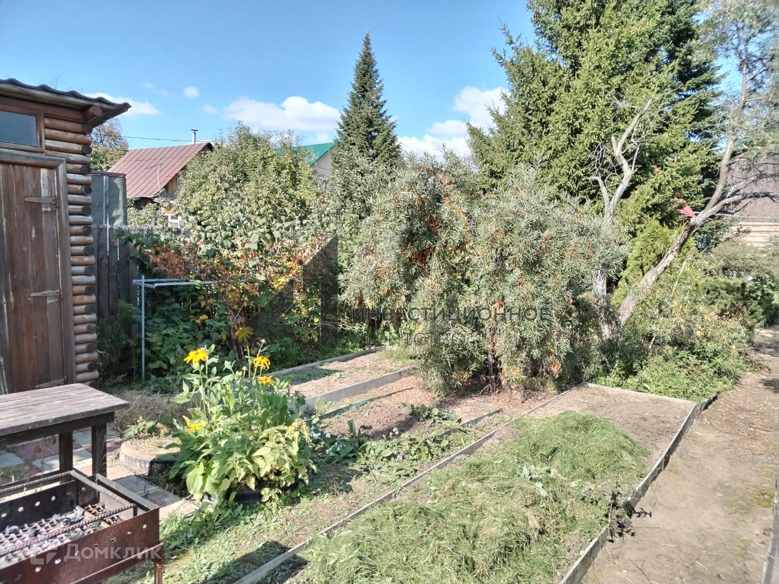 - на участке растут плодовые кусты (смородина, малина, вишня) и деревья (облепиха, яблоня);