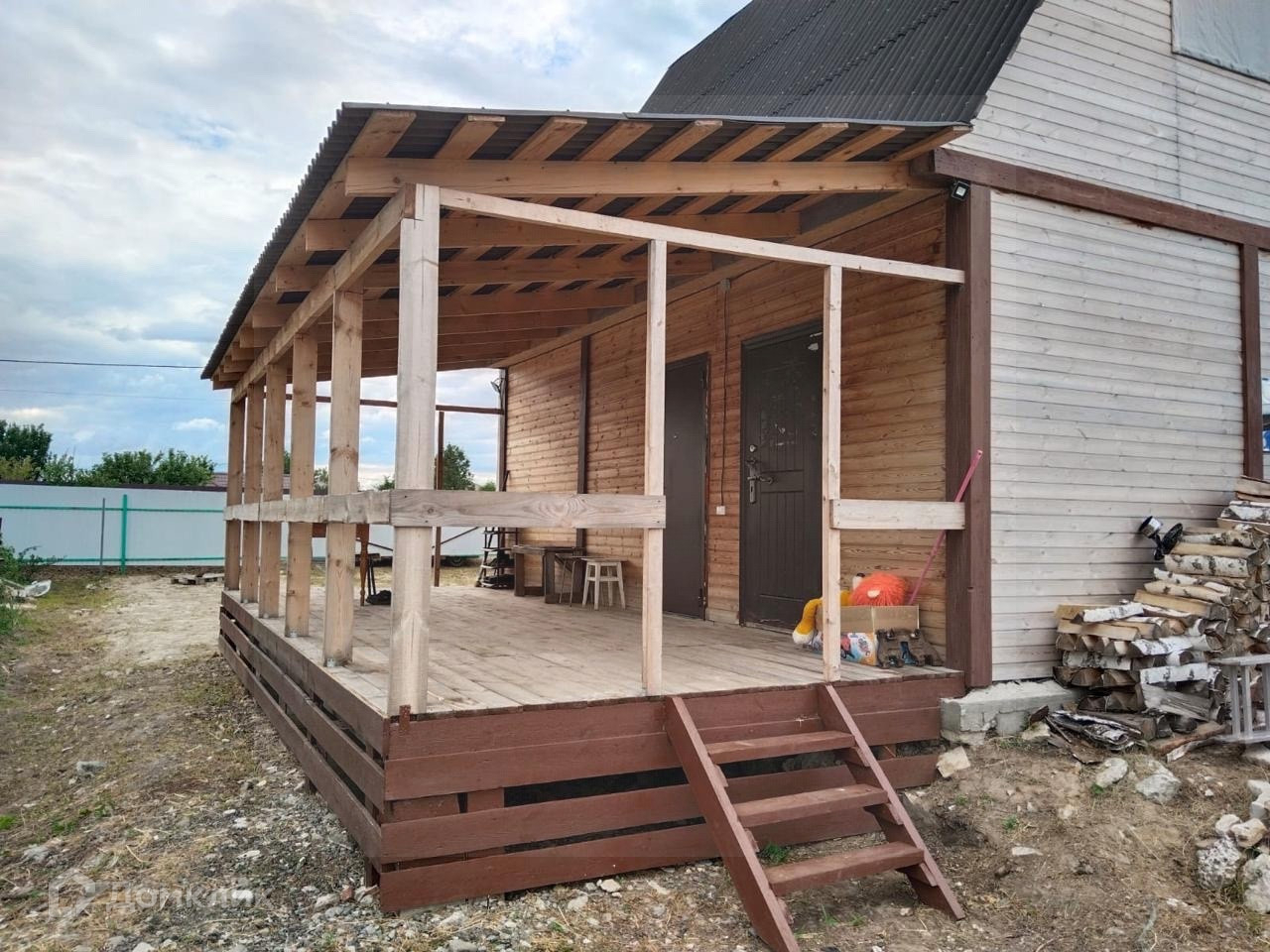 На участке двухэтажный дом с террасой