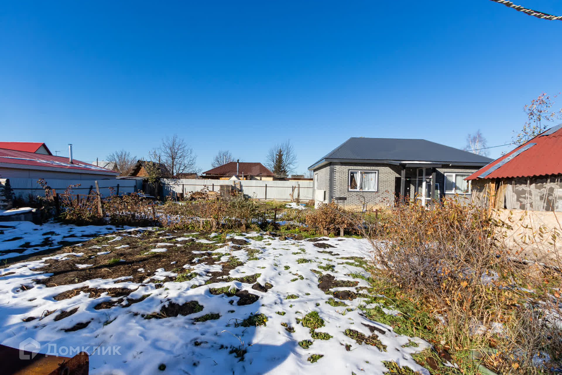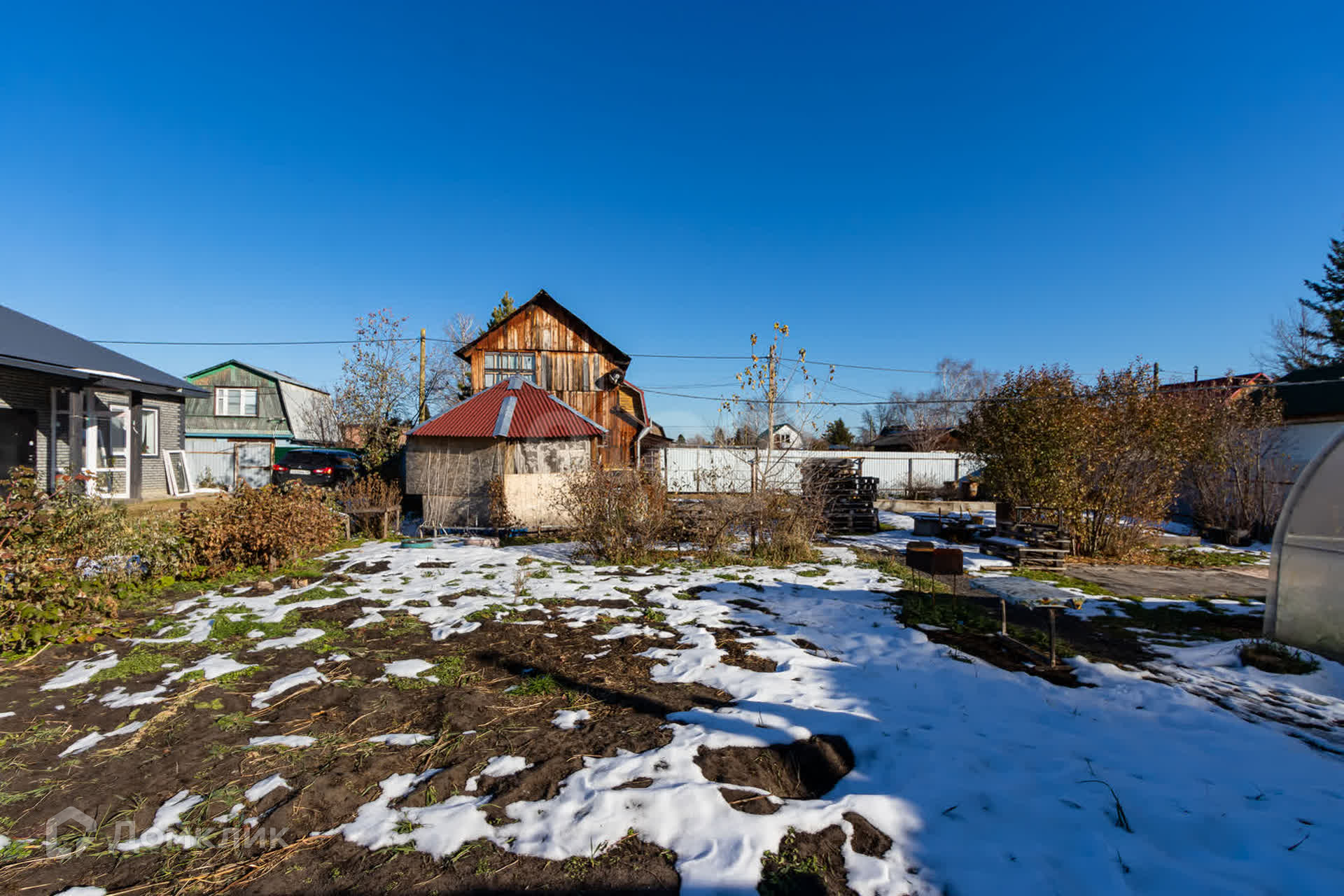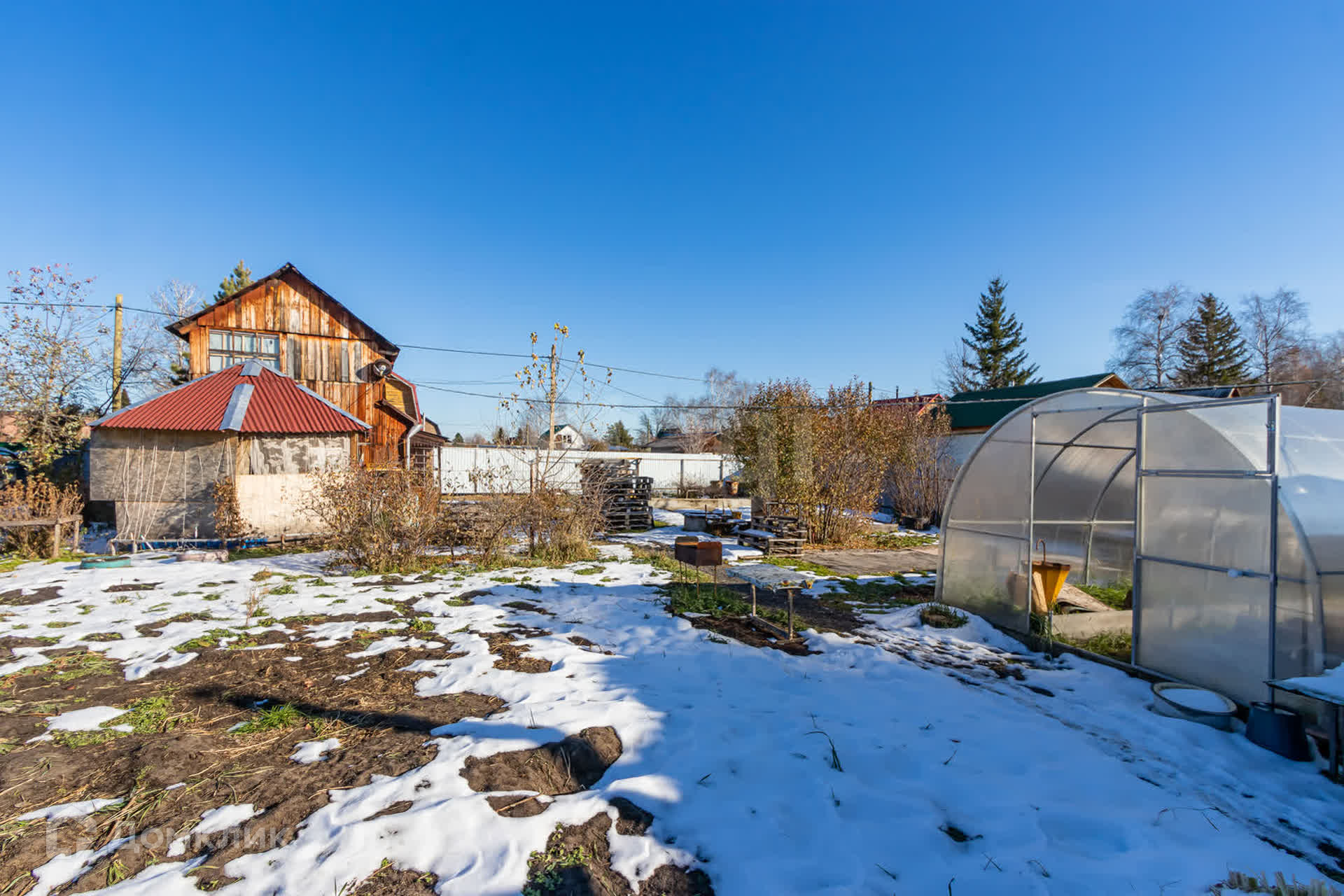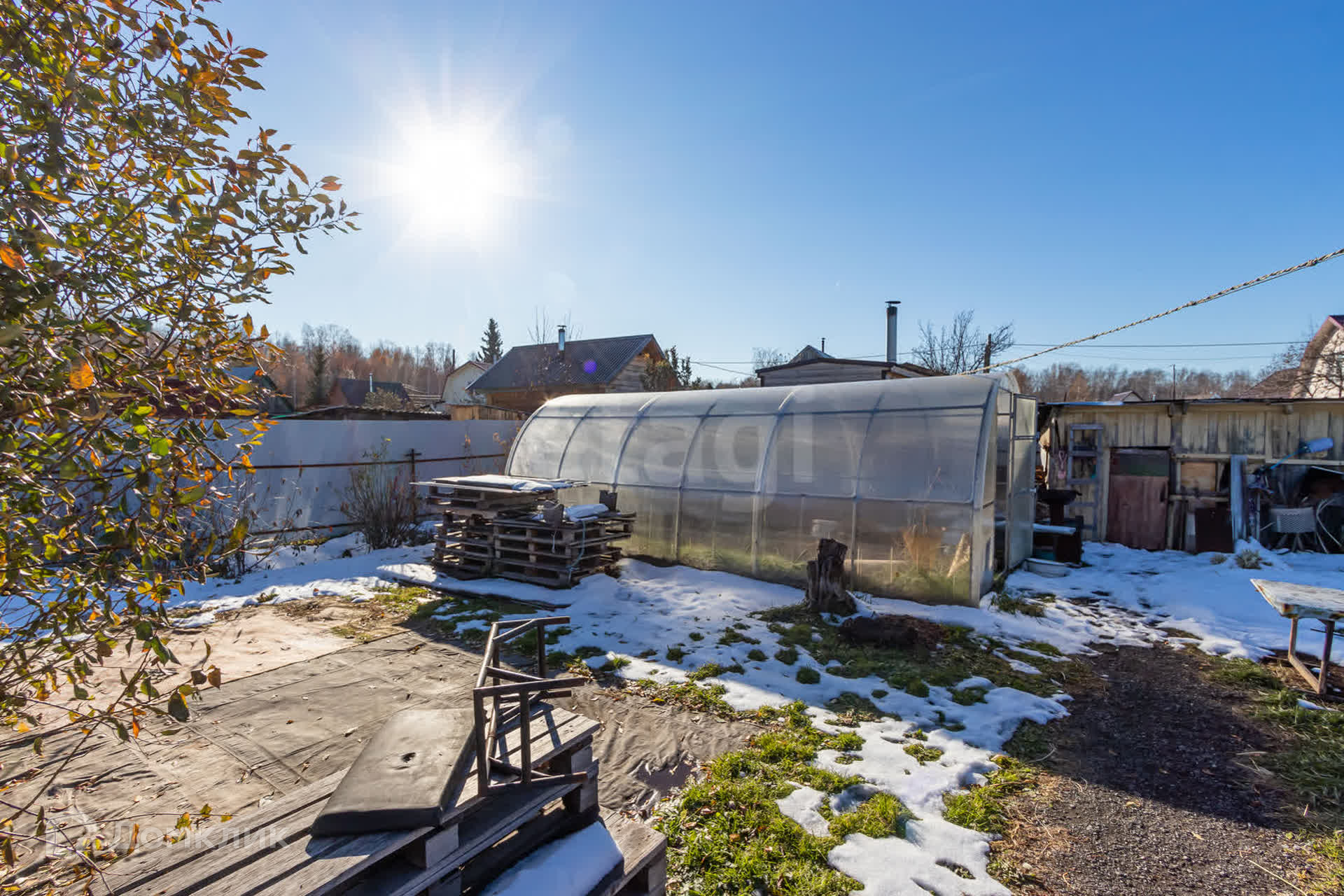 Участок благоустроен и оснащен всем необходимым для комфортной жизни: теплица длиной 6 метров, плодородные грядки и яблони, которые каждый год радуют щедрым урожаем.