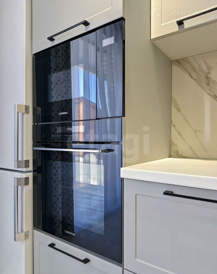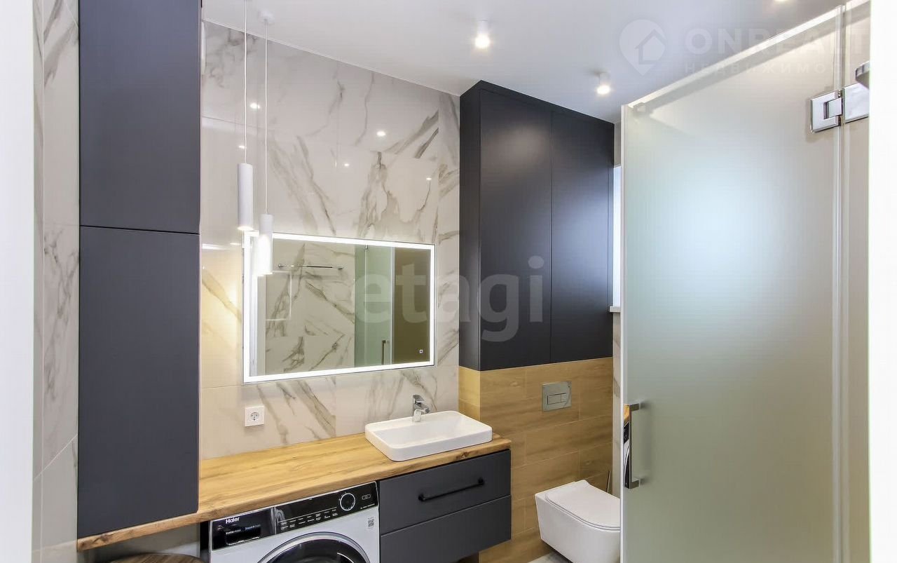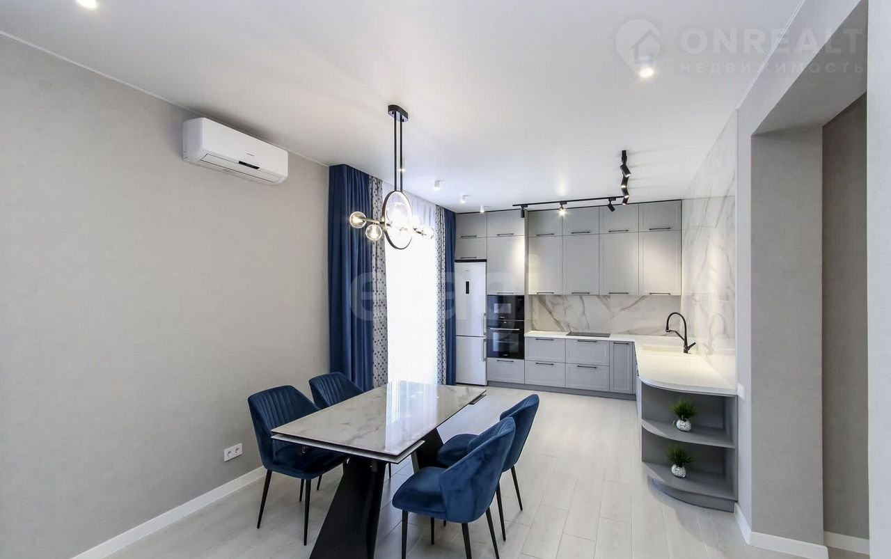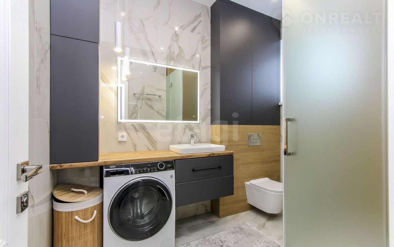 Санузел облицован плитами от "Кеrаmа Маrаzzi", душевая кабина выполнена по индивидуальным размерам. Стены оформлены виниловыми моющимися обоями, натяжные матовые потолки со стильными спотами и трековой системой освещения. Встроенная кухня и шкафы оснащены фурнитурой "Вlum". Вся мебель, встроенная техника и текстиль на окнах остаются новым владельцам.