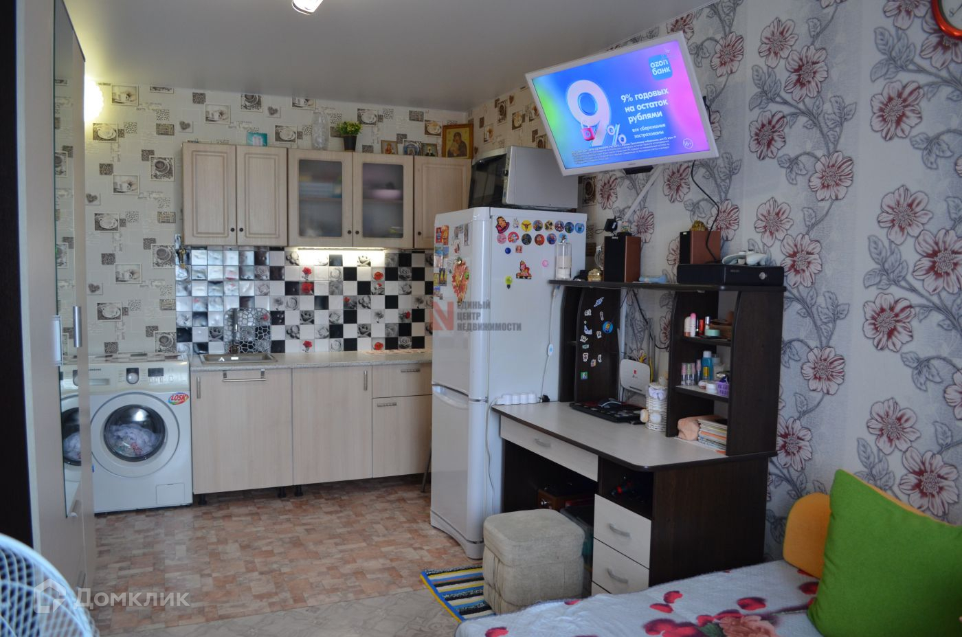 РЕМОНТ КОСМЕТИЧЕСКИЙ: в комнате натяжной потолок, на стенах свежие обои, на полу линолиум, окно пластиковое, заведена вода, установлена раковина и подключена стиральная машинка.