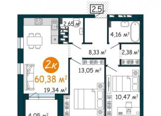2-ком. квартира на продажу, 60.7 м2, Краснооктябрьская улица, 8