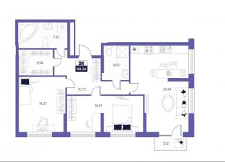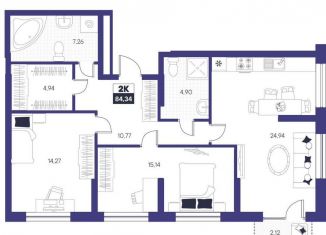 Двухкомнатная квартира на продажу, 84.3 м2