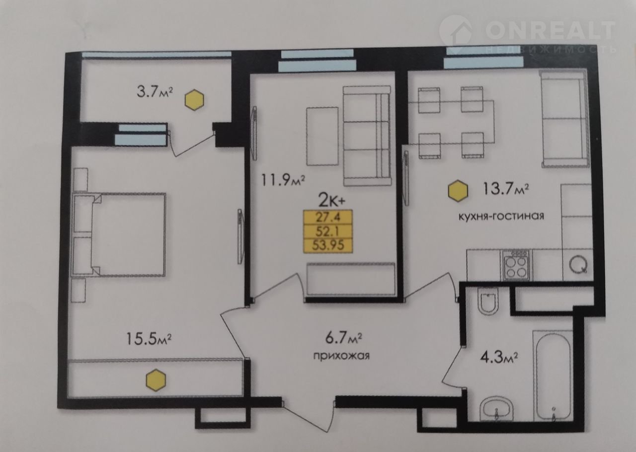Общая площадь 52 м2