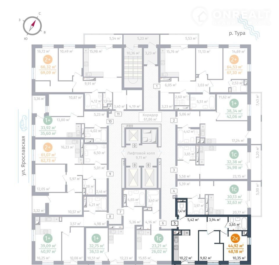 Предлагаем 2 - комнатную квартиру в доме ГП-2.1 общей площадью: 44,92 кв.м., с типом планировки: Стандарт. Комплекс расположен на территории бывшего завода «ДОК «Красный Октябрь.  Это один из самых зеленых и чистых уголков города: здесь нет шумных магистралей и предприятий. До центра всего 2,5 км без мостов и путепроводов, а значит, вы можете спланировать время на дорогу с точностью до минуты. Дома стоят на высоком берегу Туры, на первой линии у воды. С территории ЖК хорошо просматриваются как панорама реки, так исторический центр, Мост Влюбленных и набережная. Проектирование ЖК выполнил архитектор Лазар Герич (Сербия). Из особых фишек проекта – 9 лифтов на один дом, колясочные на каждом этаже, зоны ожидания и стойка консьержа в холле. Дворовая территория с игровыми и спортивными площадками  - закрытая. Машино-места в комплексе бесплатные, общее число для дома первой очереди – 642.