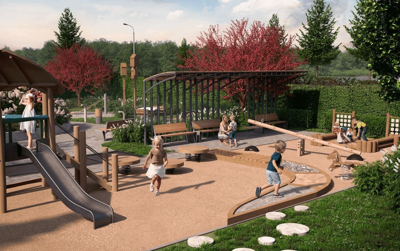 Двор повышенной комфортности. Выполнен в концепции «без машин», оборудован детскими комплексами, спортивной площадкой с настольным теннисом, тренажерами, шахматным столом, местами отдыха, площадкой для игры в бочче, перголами и множеством зеленых насаждений по всему периметру. Закрытая территория 24/7 находится под видеонаблюдением.