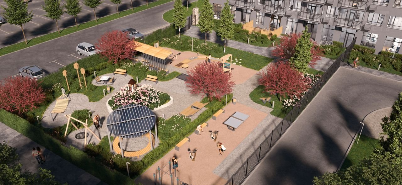 Двор повышенной комфортности. Выполнен в концепции «без машин», оборудован детскими комплексами, спортивной площадкой с настольным теннисом, тренажерами, шахматным столом, местами отдыха, площадкой для игры в бочче, перголами и множеством зеленых насаждений по всему периметру. Закрытая территория 24/7 находится под видеонаблюдением.