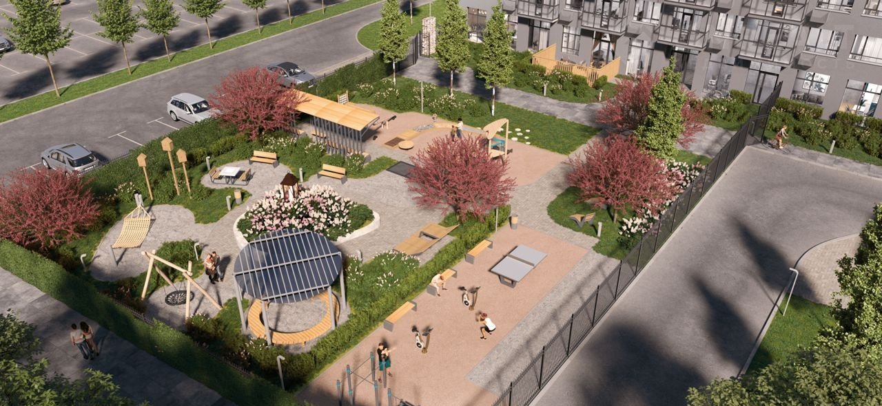 Двор повышенной комфортности. Выполнен в концепции «без машин», оборудован детскими комплексами, спортивной площадкой с настольным теннисом, тренажерами, шахматным столом, местами отдыха, площадкой для игры в бочче, перголами и множеством зеленых насаждений по всему периметру. Закрытая территория 24/7 находится под видеонаблюдением.