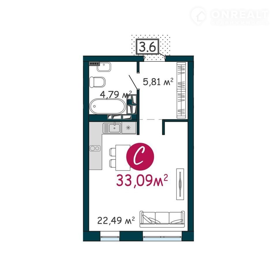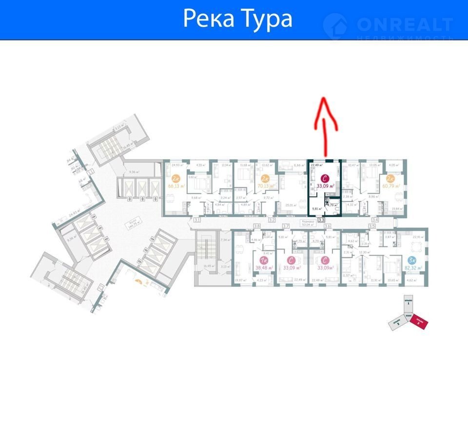 Просторная квартира-студия в жилом комплексе на берегу Туры. Общая площадь квартиры 33,09 кв.м.