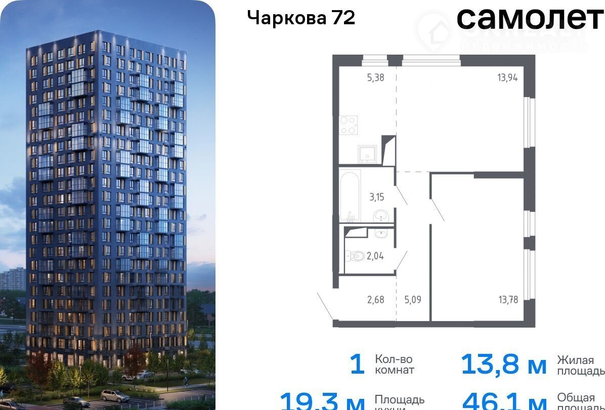 1-комнатная квартира, 45.1 м2, этаж 24 / 24, на продажу в Тюмени, жилой комплекс Чаркова 72, 1.1