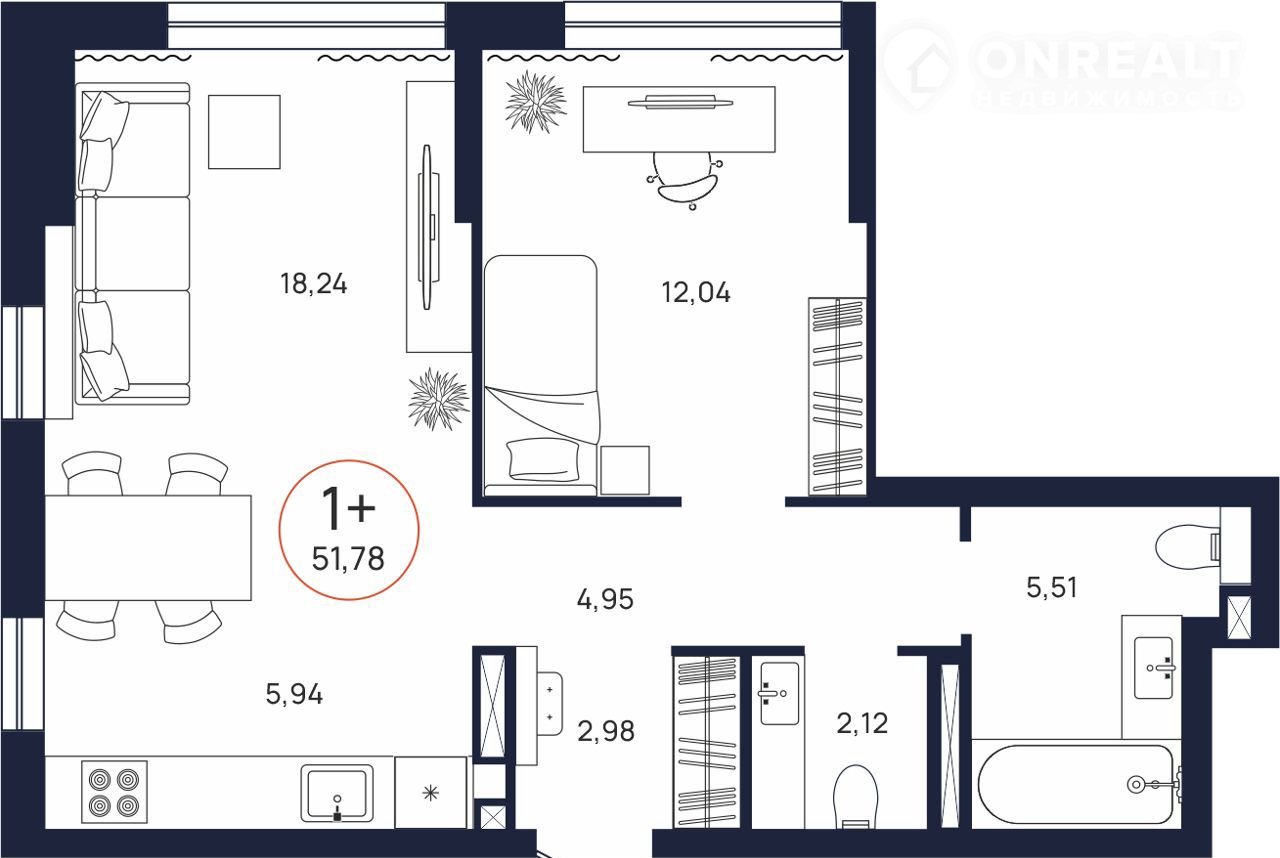 Общая площадь 51.8 м2
