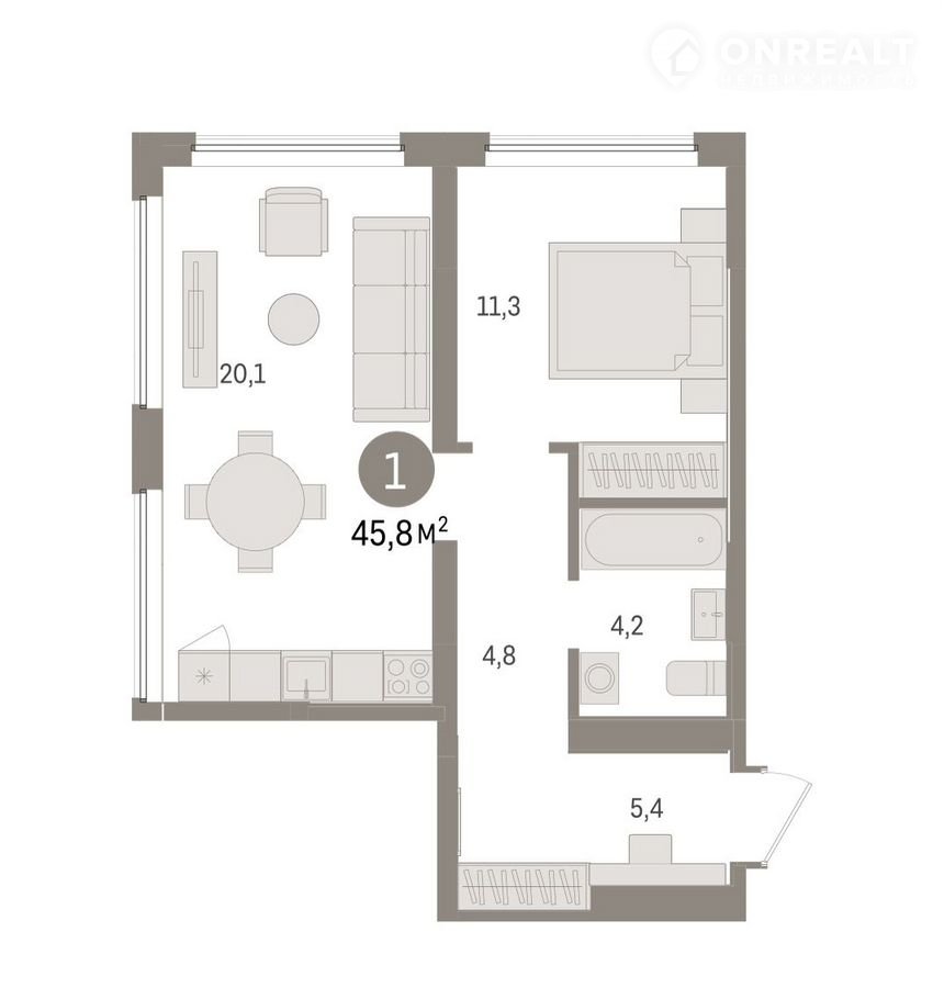Квартира с кухней-гостиной и одной спальней в жилом районе «Речной порт». Особенности планировки: предчистовая отделка.