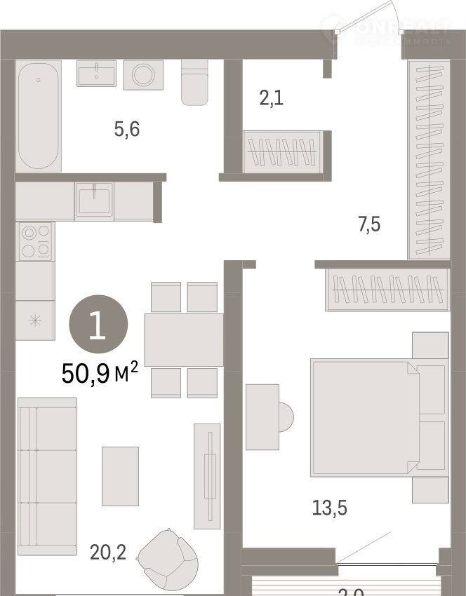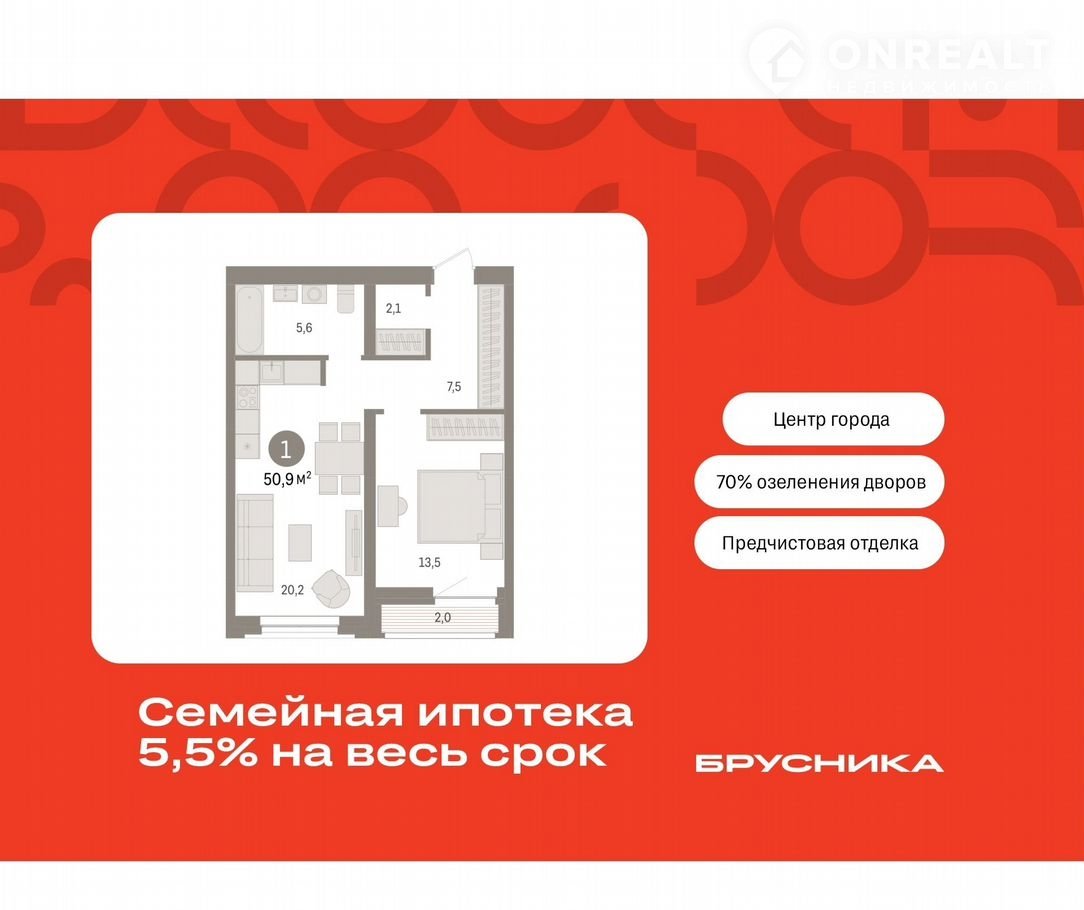 1-комнатная квартира, 50.9 м2, этаж 6 / 10, на продажу в Тюмени