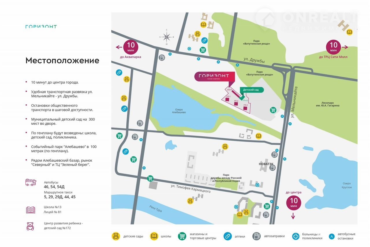 - Все необходимое для комфортной жизни находится в шаговой доступности: магазины, детские сады, гимназии, школы, поликлиники и остановки общественного транспорта. До центра города всего 10 минут!