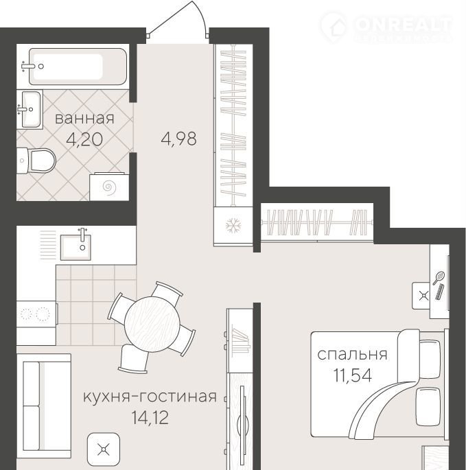 Уютная однокомнатная квартира 34.84 кв.м на 4 этаже. Функциональная планировка позволяет удобно организовать быт, а кухня-гостиная подойдёт для отдыха и общения.