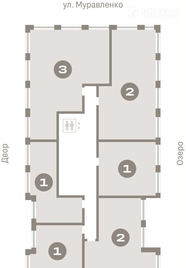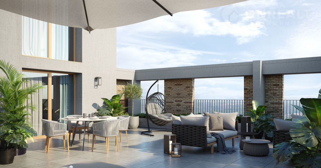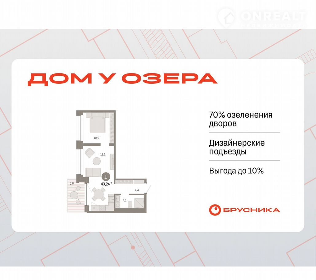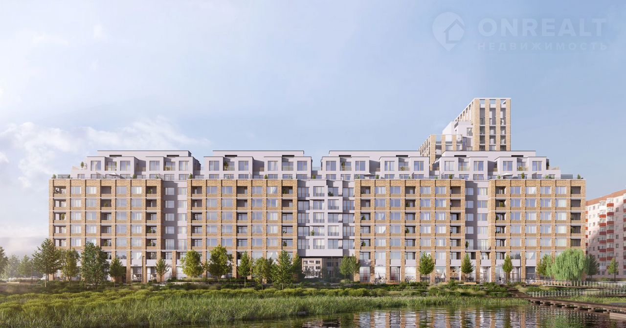 Квартира с кухней-гостиной и одной спальней в Доме у озера. Особенности планировки: вид во двор, панорамное остекление, предчистовая отделка, балкон.